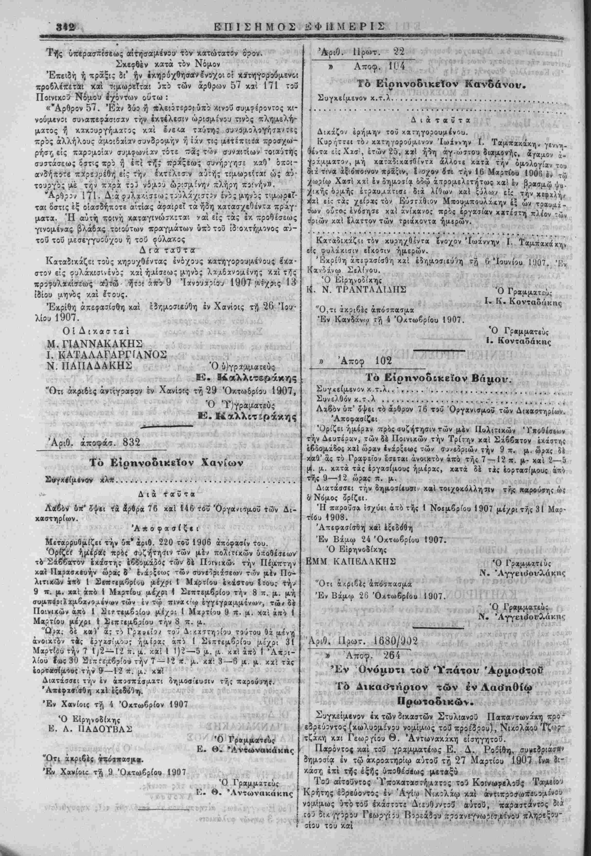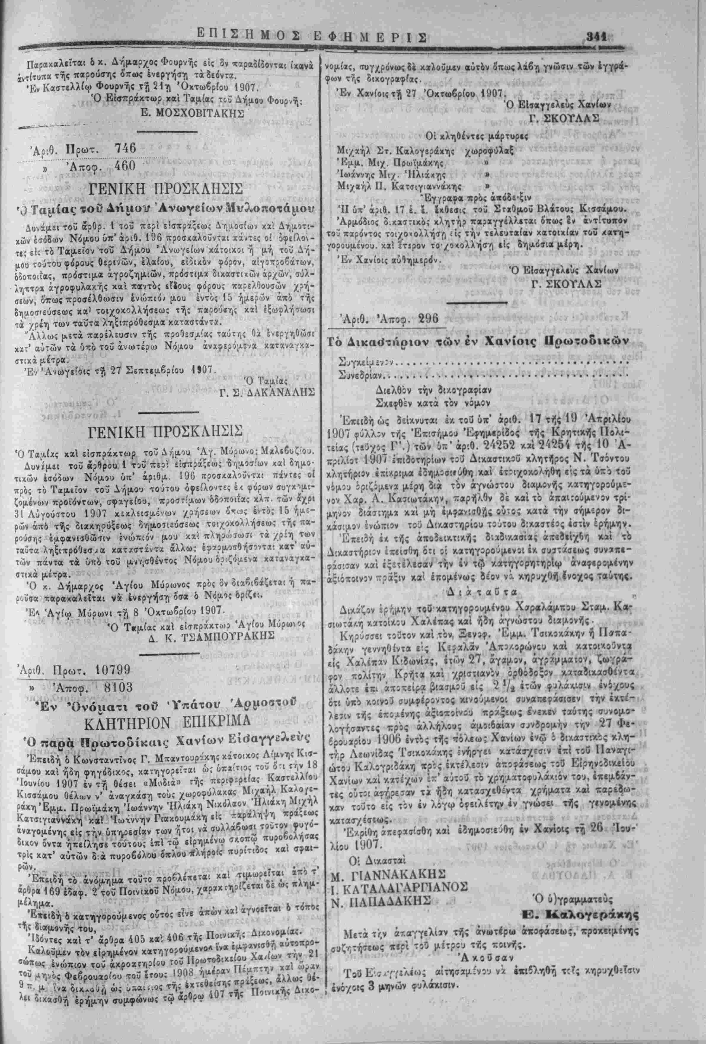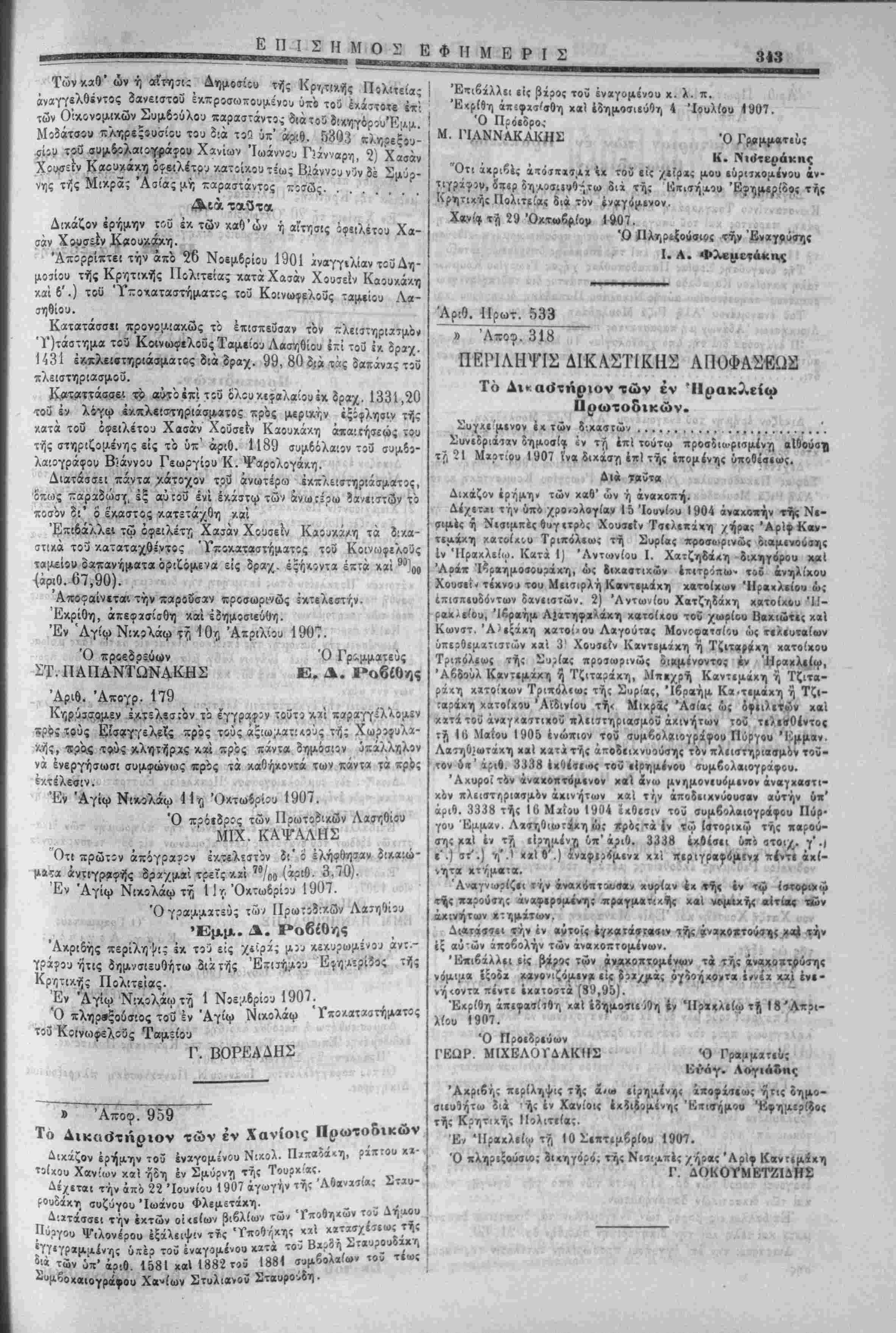 Έν Άγίω Νικολάω <γ?, 10ττι Απριλίου 1907. Ό προεδρεΰων Ό Γραμματεύς ΣΤ· ΠΑΠΑΝΤΩΝΑΚΗΣ Ε, Α. 1»ο6ίθης Αριθ. Άπογρ. 179 , ^., ^. . *ι "_*"". Κηρΰσσομεν έκτελΐσ;Όν τ'ο εγγραφ3ν τουτο κχι «αραγγί πρόί τρΰς ΕίσβγγίλεΙς «ρός τούς α;ιω,Αατ!*ο^ς τής Χωρ ν.<ς, ν?ο& τρ,ύς κλητί|ρας καί πρός πάντα δημόσιον Οπάλλτΐλον ν» ένεργήσωσι συμφώνως πρός τα ΑαδήχονΐΛ ϊων,ιΐάντίϊ Ι» κρός έχτέλεσιν. »?>: ,·»ΐ(ΐ ', - ^ "*