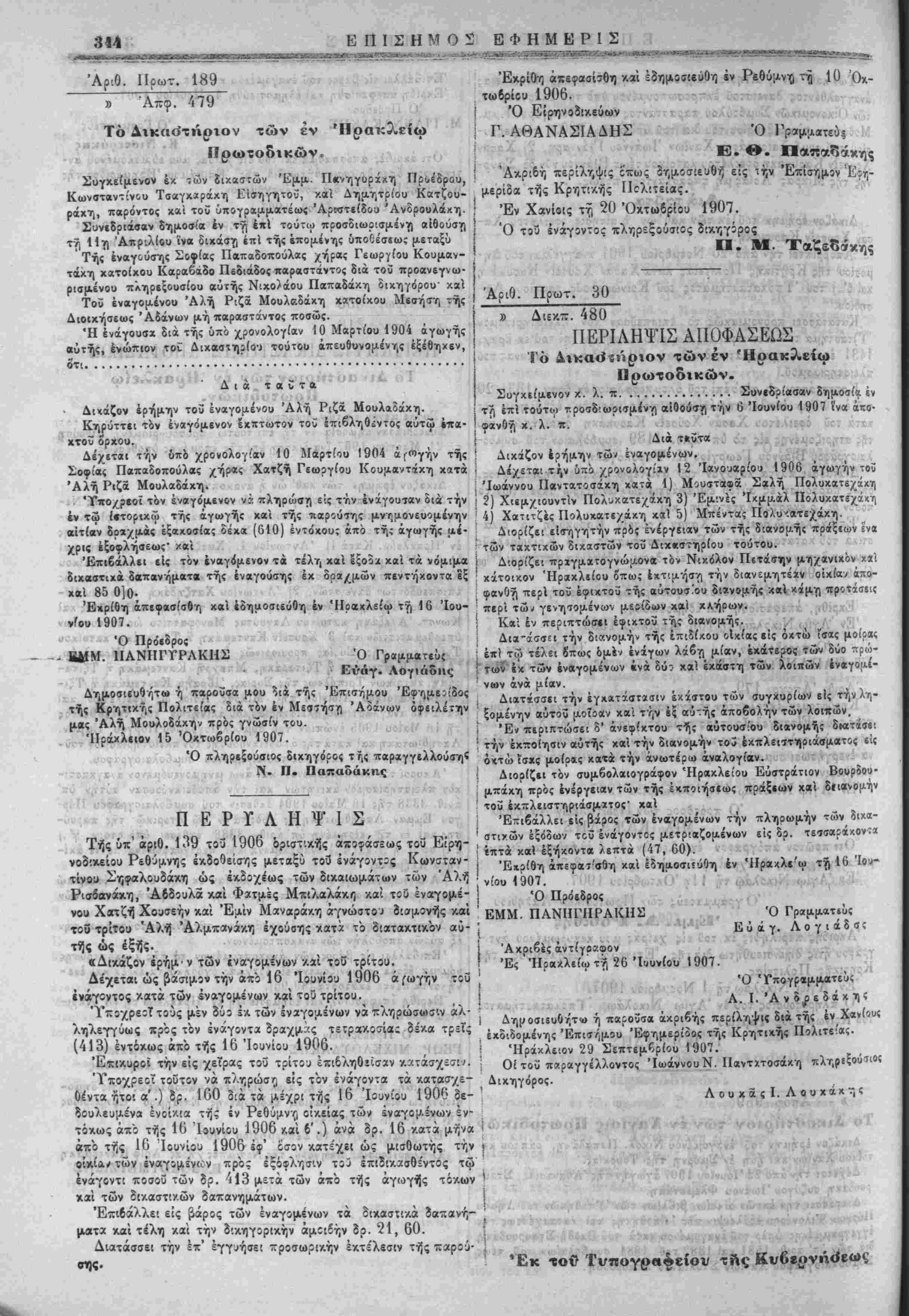 Δέχεται την υπό χρονολογίαν 10 Μαρτίου 1904 ά(·<»γήν τής Σοφίας Παπαδοπουλας χήρ«? Χατζή Γεωογίοα Κουμα^τάχη χατά Άλή Ριζα Μουλαδάχη. ΎΐΓθ/ρβοί τόν έναγόμενον ν? πληρώση ε'ς ττν ένάγουταν διά την έν τώ ίβτοριχώ τής άγωγής χα'ι τής παρούσης μνημονευομενην αιτίαν δραχμάς έξαχοσίας δέχα (610) έντόχου; άπο τή; άγωγής μέ¬ χρις έξοφλήβεως' χαι Επιβάλλει είς τόν έναγομενον τα τέλη καΐ εξοδα χά! τα νόμιμα διχαστιχά δαπανήματα τής έναγούσης έκ δοαχμών πεντήκοντα εξ χαΐ 85 0]0· 'Εχρίθη απεφασίσθη και εδημοσιεύθη έν Ηρακλείω τή 16 Ίου- Ό Πρόεδρον -,τ-ν-^-Τί--.-»/ ί ■ --.· :- 1ΙΑΝΗΓΓΡΛΚΗΣ "Ο Γραμματεϋ{ Εύαγ. Λογιάδης Δημοσιευθ/ϊτω ή παροΰσα μου διά τής Επισήμου Εφημερίδος τής Κρητικϊ^ Πολιτείας διά τόν έν Μεσϊήστ) Άδάνων οφειλέτην αας Άλή Μουλοδάχη/ πρός γνώσίν τού ^Ήράχλειον 15 Όχτωβρίου 1907. ν ^ α, 'Ο πληρεξούσιος δικηγόρος τ Γ,ς ιταραγγελλούση! Γ^χ,βΐΛίθ/·.·!^^^, Ν. Π. Παπαδάκης ' ί-Π ίφ^«·')5Λ^'1'- ι.·»τ (.» ΐ'/ <ι} ί,ϊ- ι'ΊΙΛ ί> .2 Ι