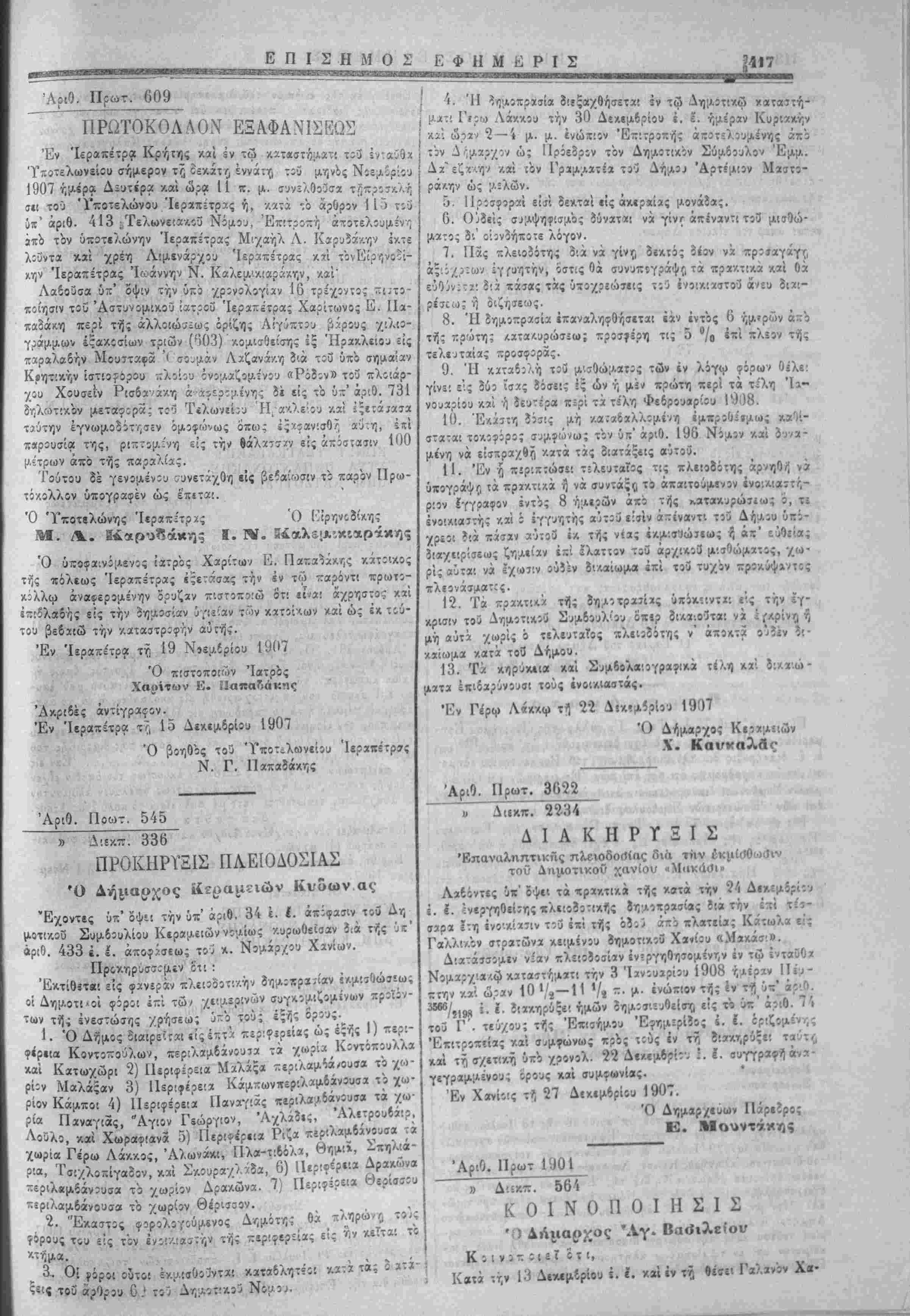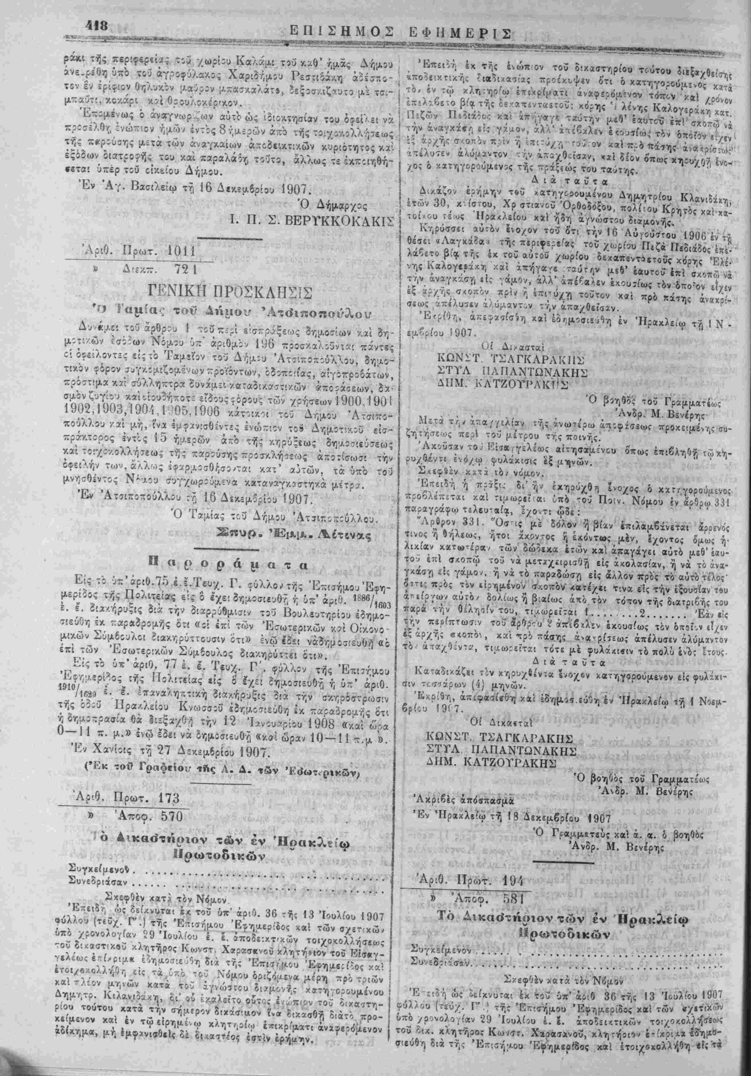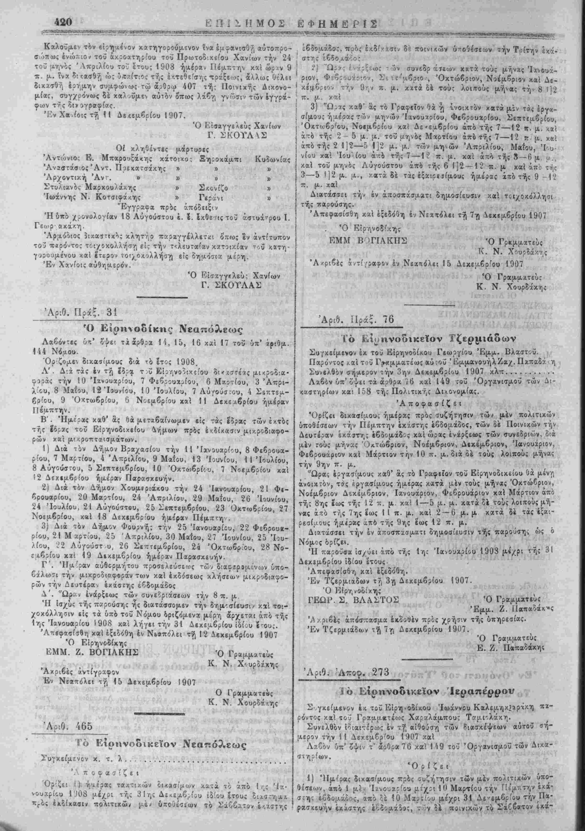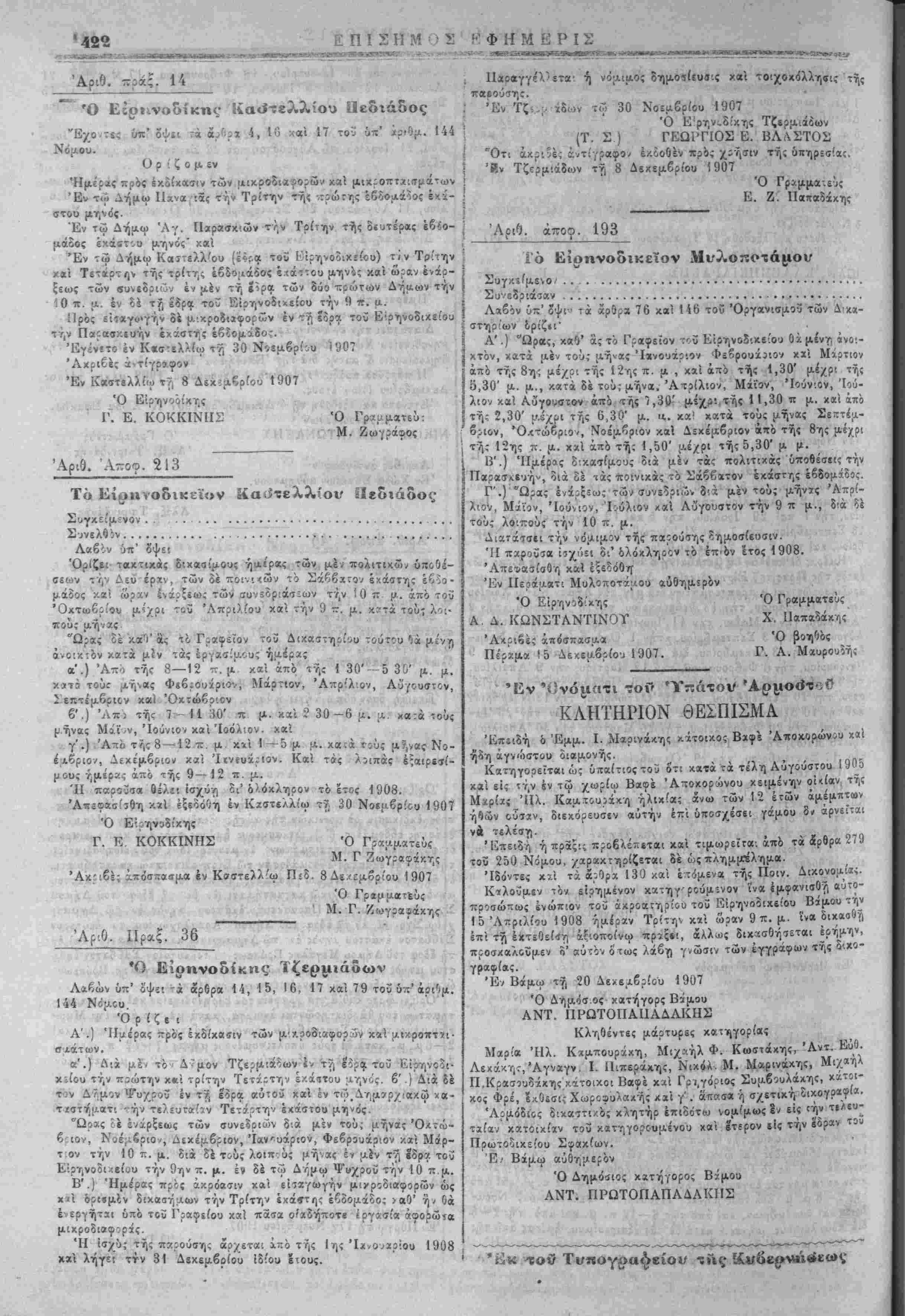 Πρός είίαγ«>γήν δϊ [Λ·κροδιΐ<ρορών έν τ^ Ιξρα τοΰ Ε'ρηνοδικείου **τ,ν Πα^ασκιυήν «χάστης έβίομάδο,-. «,· 'Εγίν'ίτο έν Κ«σ-ελΛ<ω τ·?, 30 Νίϊμβρίου ! 907 'Λχριβές ά-τίγροιφον '1 Έν Κβστβλλίω τ7, 8 Δεκ--μ?ρίου 1907 Ό ΕΊρηνοοίχης ί>^ί >
