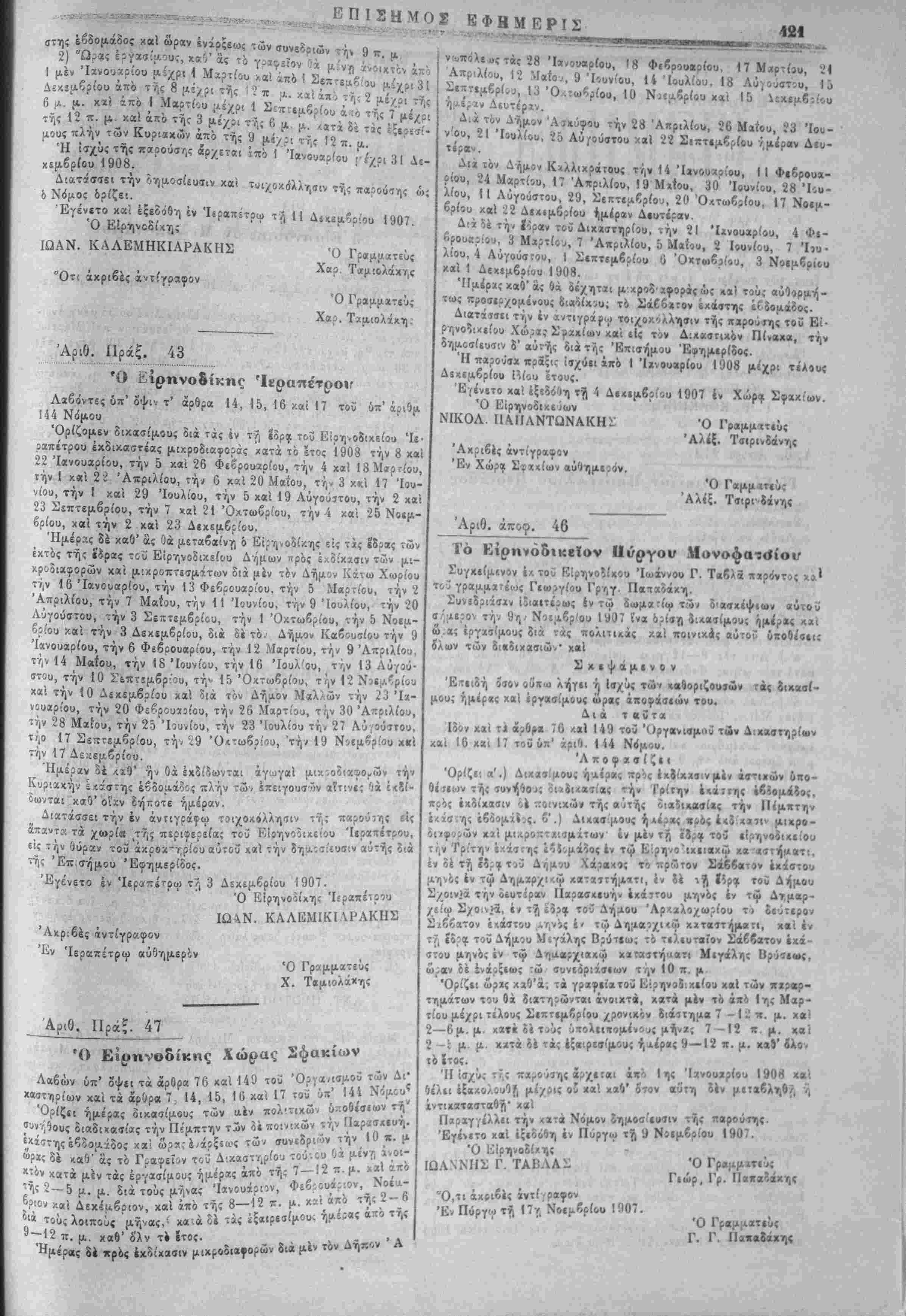 Συϊίδριάσχν Ίδιαιτίρως έν τω δωμαπ'ψ τώ< δ'ασχίψιων αΰτοΰ μρ χ*ι ϋποθίϊκ; σ/;4ε:ον την 9γγ· Νοε^βρ'ου 19ί)7 'ινα δρί«|ΐ 5ι*α«ίμους ω.ας έργχσίμους οιά τάς πολιιΐχάς χχί ποινιχές αυτόν ίλων των δκδιχασιών' χαΐ ϊχιψάμΐνον Έ.τιιδή οοον οϋ'ιΐιι) λήγιι ή Ισχϋς των <«5οριζουΐών τάς οΊχασί- μου; ήμίρκς χά! ίρνασίμους ώρας ίποφάσιών τού. Διά ταυτα Ιδόν χαί τι άι6»« 76 <χ 149 τοϋ Όργανιβμκϋ των Δικαστήριον χαί 16 χαί 17 τοϋ ύπ' αριθ. 114 ΝιΙμου. 'Λποφχσίζκ Όρίζε'. α'.) ΔιχχσΙμους ήαίρας ηρός έχΐίχχΐινμέν άϊ-τικών 6πο- θίΐιων τής ιυνήΐθυς όΐϊίΐΛβσίας την Τρίτην έκ»ϊ της «65βμά?ος, πρός έχδίχασιν ϋ ποινιχώ» τής αυτής οιαϊιχαβίας τή» ΙΙίμκτην ϊ'.ί<3,ι<, ίβδομϋ'^ς. £'.) Λιχαβμους ήΛ^ρας κρός έ<δ.<ΐιιν μιχρο- ';ρών χαί μιχροπτχισμχ'των' έν μέν τ?| ϊορ^ τού εΙρηνοοΊχΐίου Τρίτην έχάστης ΐό$(,μά?ος έν τώ Είρηνο^ΐχειαχω χ«·«στήματι, έ» δέ τή ίϊργ τϊϋ Δτ,μου Χάραχβς το πρώτον Σάββατον έχάστου ς έν τώ Δημϊρχι<ώ χατχϊτήμΐτι, έν 5» ν$ Ιίρχ τοθ Δήμου στου μηνός έν τώ Ληαβρχιαχώ χχταιτήαατι Μιγάλης Βρύιιως, ώ.αν δέ ένάίζίως :ώ συνίβριάσιων τ ιν 10 π, μ Όρίζιι άρχς χχΊ'ϊ; τα γρχφείχτοϊ Κίρηνοίιχείου χά! των «χρ·ρ- τημάτων τού θχ ϊατηοώνται άνοιχτά, χατα μέν τό ά»4 1ης Μαρ- τίου μέχρι τελους Σιπτιμδρίου χρονικόν διάιτημα 7 - 1 2 π. μ. χά! -6μ. μ. χ«« δέτ^ΰς ΰιτολιΐΛομίνους μήνχ; 7 —12 π. μ. χαί 2 -ϊ μ. μ. χχτά δέ τάς έξ«ιρί»ίμου{ ημέρας 9—12 π. μ. κβί' ίλον τό Ιτος. Ή ϊσ/ΰ; τί,ς πχΓούϊης άρχεται «*ο Ιΐ< Ίχνου»ρίου 1908 χαί Οί'λιι έίβχολοΰθ^ μί/5ΐ? οί «αί χαδ' ίτον «ϋ'τη οέν μπαβληθ/, υ, χντΐχατασταβή· χβ! Παρχγγίλλιι την <ατά Νόμον οημοσ(*ι>«ιν της παρου—ς.