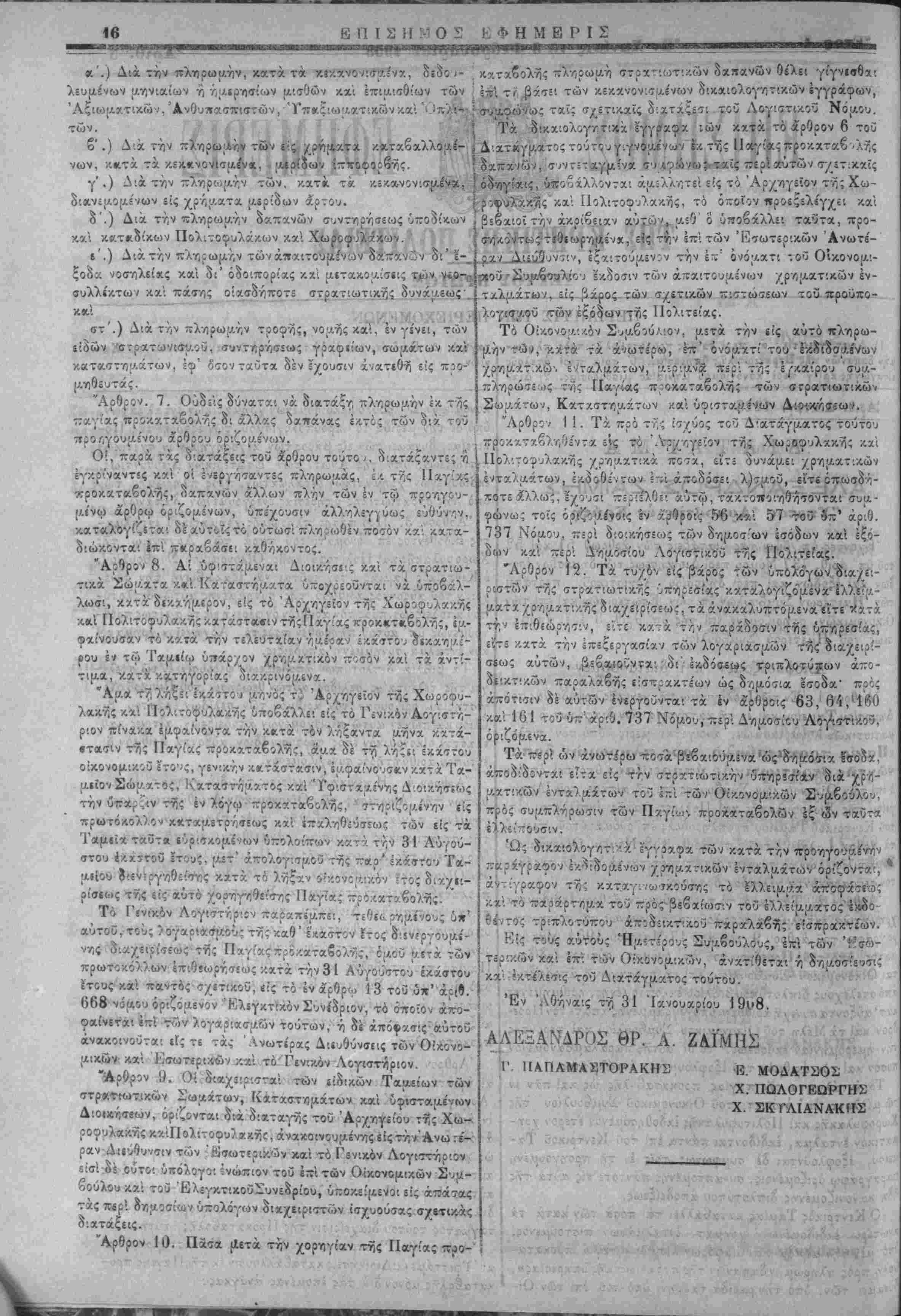 νώντΛς <ίτρατιωτιι:ίις υπηρεσίας» υπό την οποίαν ό επί των Οίχονομικών Σΰμβονλος επι τή αϊτήσει τοΰ Άρχη- γείου τής Χωροφυλακ,ής καί ΙΙολιτοΐυλακής εντέλλεται έ—ι τοΰ ΚδντρικοϋΤαμιίου προπληρωμάς έπ' όνόμχτι τοΰ, πίρί όν τα άρθρχ 1 καί 2 τοΰ ύπ' αριθ. 358 Νόμον, Οίκονομικοΰ 3νΐλβουλίου, ών τό σύνολον δίν έπιτρέπίτα: νά υπερβή τάς εκα¬ τόν τεσσαράκοντα χιλιάδας δραχμάς. Άρθρον 2. Τα κ,ατα τό προηγοναενον άρθρον έ/4διδό;ο.ενχ χρηματικά έντάλματα έξοφλοΰνται σναοώνως τή τρίτη πα- ραγράφω τοΰ άρθρον 9 τοϋ άπό Π Μάρτιον 190Ί Διατζγ- [Λχτος, υπό τοΰ. Πρόεδρον τοϋ έπ' ονόματι ούτινος έΛδίδον- ται Οϊκονοαικοϋ Συμβουλιον, επί τή προσχγωγή άποδείξεως χπό στΓλε'χους διπλότυπον βιβλίον έκκοτ::ο[Λένης, ήριθαηαί'νης κατ' χύξοντασνν.χήαριθμόν,ΰπογεγραμμένης άπό τε τόν Πρόε¬ δρον καίτχΜέλη τοΰ Οίκονομικοΰ Σνμβουλίου κα'ι φερούσας ήμερομηνίαν εκδόσεως, τό δι'αυτής παραλααβανόμ=νον "Οσον καί τόν αριθμόν τοΰ έςοφΆονμένον έντάλμχτος. Τα. έντάλματα τής πχγίας προκαταβ Αής, ώς καί παν έν τφ μίλλοντι έπ' όνόιιχτι τοΰ Οικ,ονομικοΰ Σνμβονλίον τής Χωροφυλακής κχί Πολιτοφνλακής έκδοθ/ισόμενον ετίρον χρη- ϊνταλμα, έκδίδονται πάντα επί τοΰ Κεντρικόν Τα¬ μείον, έξοφλοΰντα-. δέ συμφώνως τοίς έν τή προηγουμϊ'νη χγράφω όριζομ,ένοις, συ^απτομένης πάντοτί Είς αΰτά τής κχνονιζομένης διπλότυπον άποδείξεως. *1 πρός πληρωμήν δχπανΐόν τής στρχτ'ίθΤ'.Αος υπηρεσίας», . : των, υπό την μερίδχ ταύτην, υπό τον' επί των Οί- ταγή Λ Δ. Πχώί'Ί: *.«.'· 3) Άτπι/οΑ'.κή ϊιαταγή Χα- ν.ων. κονομι/.ών Σύμβουλον £κ,διδθ|ο.5νων χρ/)7.*τικ,(όν έ, υπό δί την α,ϊρίδχ τοΰ προύπολογιτιιοΰ των έίςόδων τη; Πο- λιτείας, δυνάμει των είς βάροςτών κί/ορηγηαί'νων σχετικών πιστώσεοιν, ΰχό της Ανωτ. τω; Έσυΐτίρικ'όν Δ-.5υ0ύνσ:ως, έκ,διδοΐΛό'νων χρηΐΑχτικ,ών έντχλμχτων, πρός πλη:ω;ζο·' τώ/ υπό της στρχτιωτΐΑης ΰπηρ5σίχ; εν»ογ3υ*ίνων δχπχνΰ;. Άρθρον 3. ΙΙρό πχ7/ι; πληρωχης χρηαχτΐΛθ^ ίΐτχΚιι.%- τος έκδοθί'ντος έπ' ονόματι τοΰ πχρχ τφ Άρχηγίίω τη; Χωρορυλακης κχί ΙΙολιτοίρυλχκνίς Οϊκονομικοΰ Συμβουλιον, ό Κεντρ'.ΛΟς Τχαίχς ΰτθ/·05θΰτχι νχ έςχΛριβώνη τ/]ν σννί- χειχν τοΰ χνςοντος άριθίλθϋ της συνημτ,ένης αύτω διπλότυ¬ πον άποδείςεως,πρός τόν αριθμόν ονοό'ρειήεϊςτό ά7.5σωςπροη¬ γουμένως ΰπ' αυτόν πληρωθέν πρός τα Άρχηγίϊον νρη[Λχτι- κόν ϊνταλ[;χ σννημΐλένη άπόδδΐςις. Τα β'.βλία διπλοτύπων άποδίίξεων φίρουσιν έν τω, στιλί- νει της τελεντχ'ας σδλίδος αυτών θεώρησιν τού ΓενΐΛθΰ Λο- γιστϊΐρίον, όρίζονσχν τόν άρΐθιχόν των σιλίδω/1 έ<άστου βι¬ βλίον κχί των έν αύτω πίριεγοΐΑί'νων άπο^ίίςιων, χΐτ'.νες κχθ' έκαστον οϊκονοαΐΛΟν έ'τος φέρο ίΐιν ίδιον χνξοντχ αριθμόν δ:' έντυπον άριθμητηρος συνενιζόμε^ν. "Αρθρον 4. 'Η γενική διαχείριτις της διχ χρηματ. ένταλ- ι/.άτων της Άνωτίρχς των Οίκ,ονομικών Διευθύνσεως /ορη- γονμένης πχγίχς προχχτχβολης, πρός πληρωμήν δχπχνών της στρατιωτικης υπηρεσίας, άνατίθότχι είς τό ~αρά τω Άρχηγίίω της Χωροφνλχκης καί Πολιτο,ρυλακης νίριστάιιε- νο; Ο(κ,ο//(Λ;κ,όν Συ;ο.οονλΐον, τό οποίον διχνίαίΐ την ΙΙαγίχν προκ,χτχβολήνείς τχστρχτιωπχ.χΣώμχτχ,Κχτχστόαχτα κχϊ τα/ ΰφιστααένην Διοίκησιν, άνχ)·5γα>; των άνχγκων της
