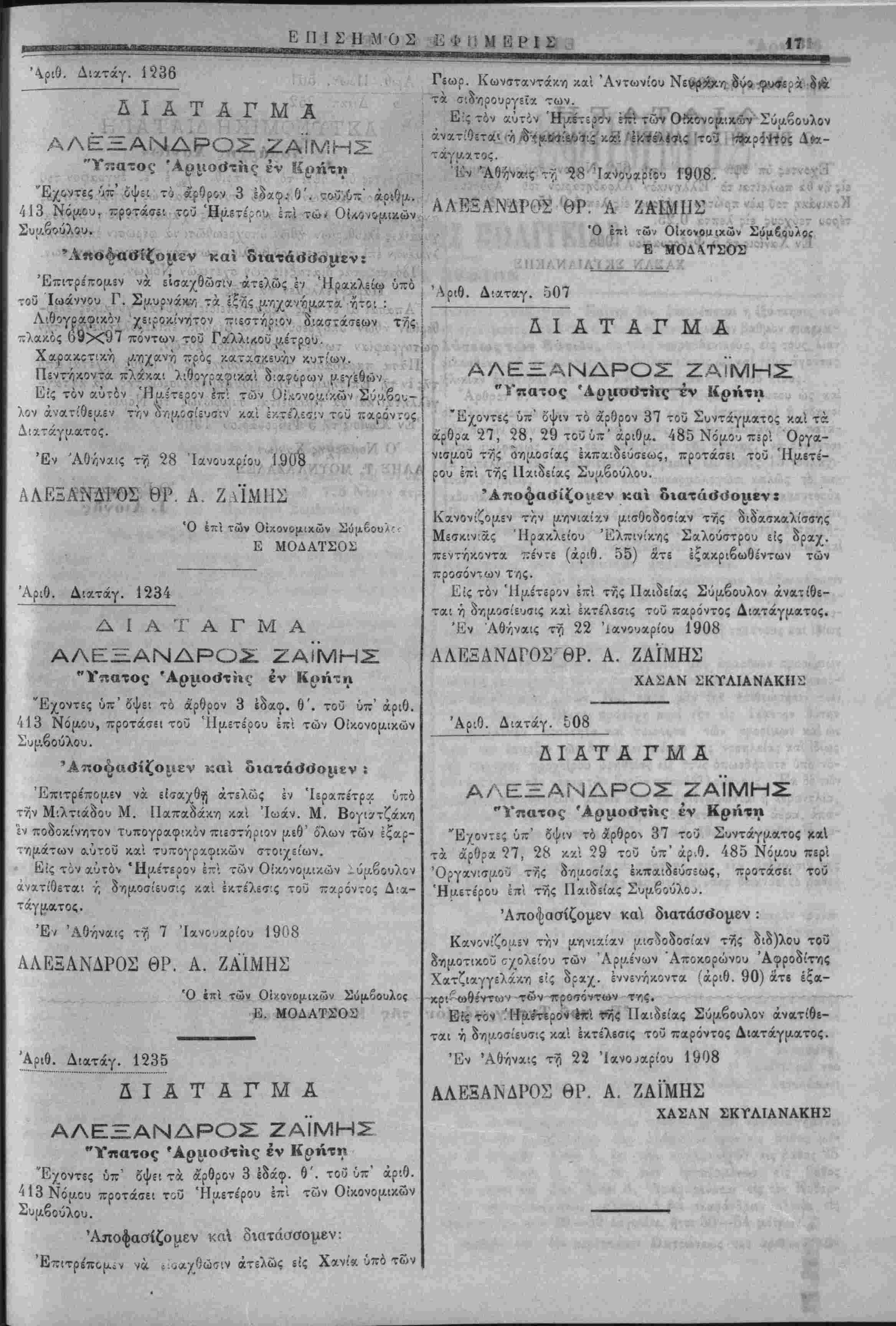 "Υπατος 'Αρ*ιο<ίτης έν Κρήτη Έχοντες ΰ-' δψει τα άρθρον 3 έδάφ. θ'. τοΰ ύ-' αριθ. 413 Νόμου προτάσει τοΰ Ήμετε'ρου επί των Οίκονομικών Συμβούλου. Αποφασίζομεν κοΛ διατάσσομεν: Έ-τ ν* ο^αχθώσιν άτελώς είς Χανιά υπό των Αριθ. Διαταγ. 507 ΔΙΑΤΑΓΜΑ ΑΛΕΞΑΝΔΡΟΣ ΖΑΙΜΗΣ "ϊ'πατος Άρμοότίϊς "έν Ιίρήτη Έχοντες ύπ' όψιν τό άρθρον 37 τοΰ Συντάγματος κα,ί τα άρθρα 27, 28, 29 τοΰύ-'άριθμ. 485 Νόμου π=ρϊ "Οργα¬ νισμόν τνίς ο·/ιμοσί*ς έκπαιδεύσεως, προτάσει τοΰ Ήμετέ- ρου επι της Παιδίία,ς Συμβούλου. Άποφαο*ίζο»ίεν καί διατά<ί<ίομενΐ Κανονίζομεν την μηνιαίαν μισθοδοσίαν της διδασκαλίσστ;ς Μεσκινιας Ηρακλείου Έλπινίκης Σαλούστρου είς δραχ. πεντήκοντα πέντε (αριθ. 55) άτε έξακριβωθέντων των προσόν-ων της. Είς τόν Ημέτερον επί τής Παιδείας Σύμβουλον άνατίθε- ται ή δγ;μοσίευσις καί εκτέλεσις τοΰ παρόντος Διατάγματος. Έν Αθήναις τη 22 'ίανουαρίου 1908 ΑΛΕΞΑΝΔΡΟΝ ΘΡ. Α. ΖΑΙΜΗΣ ΧΑΣΑΝ ΣΚΥΛΙΑΝΑΚΗ Η Αριθ. Διατάγ. -508 ΔΙ ΑΤ Α ΓΜΑ ., ΑΛΕΞΑΝΔΡΟΝ ΖΑΪΜΗΣ "Υπατος 'Αρμοίίτης έν Κρήτη Έχοντες ύπ' δψιν τό άρθρον 37 τοϋ Συντάγματος καί τα άρθρα 27, 28κ7.ι29 τοΰ ύπ'άρ.θ. 485 Νόμου περΐ ΌργανισμοΟ της δημοσίας έκπαιδεύσϊως, προτάσει τοΰ Ήμετε'ρου επι της Παιδϊίας Σύμβουλον. Αποφασίζομεν και διατάοΌΌμεν : Κανονίζοαεν την μηνιαίαν μισ^οδοσίαν της διδ)λου τοϋ δημοτικοΰ σχολείου των Άρμίνων Άποκορώνου Άφροδίτνις Χατζιαγγελά'κη είς δραχ. έννενήκοντα (αριθ. 90) άτε έξα- κρ'/ωθέντων των ιτροσβντω^ν της. Είς τόν .Ήμβτερον ίπί *% Παιδείας Σύμβουλον άνατίθε- ται ή δημοσίευσις καί εκτέλεσις τοΰ παρόντος Διατάγματος. Έν Αθήναις τη 22 Ίανο^αρίου 1908 ΑΑΕΞΑΝΔΡΟΣ ΘΡ. Α. ΖΑΙΜΗΣ ΧΑΣΑΝ ΣΚΥΛΙΑΝΑΚΗΣ