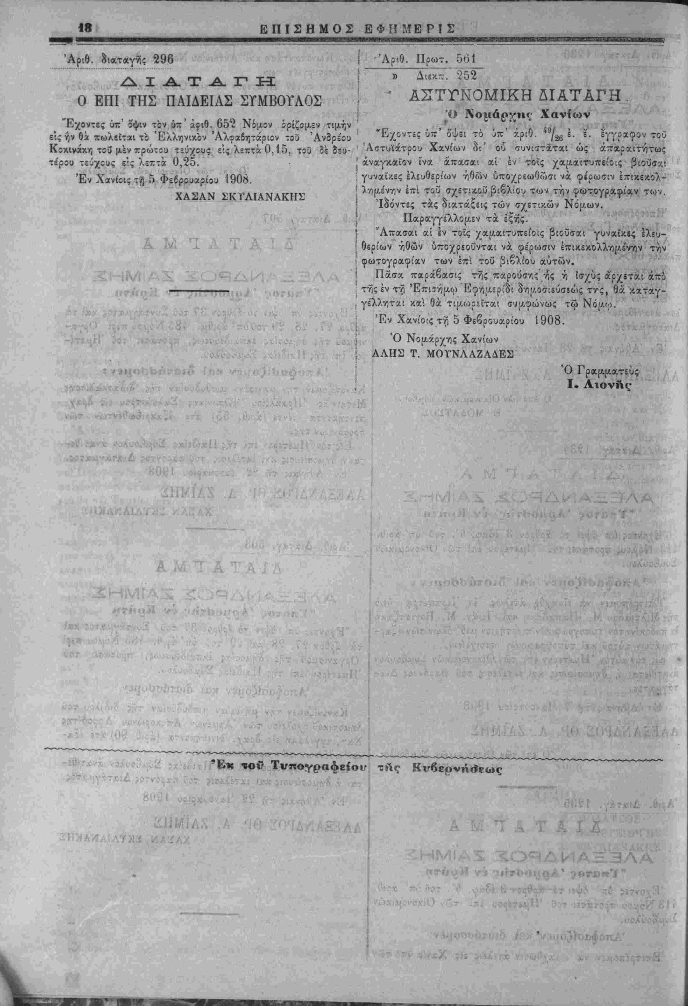 ϊ Πόίσχ χαράβασις της παρούσ/,ς τίς ή ί<τχύς άρχεται άπδ ' της έν τνί Έπυήμω Εφημερίδι δηαοσιεύσίώς ττς, θά καταγ- . γέλληται κ*1 9ά τιμωρεϊται συμφώνως τω Νό(Λΐο. : Έν Χανίοις τνί 5 Φεβρουαρίου 1908. ϊ Ό Νομάρχης Χανίων ; ΑΛΗΣ Τ. ΜΟΤΝΛΑΖΑΔΕΣ Ό Γραμματεύς Ι. Αιονης Α .ν. .-ν Έκ το« Τυπογραφείον