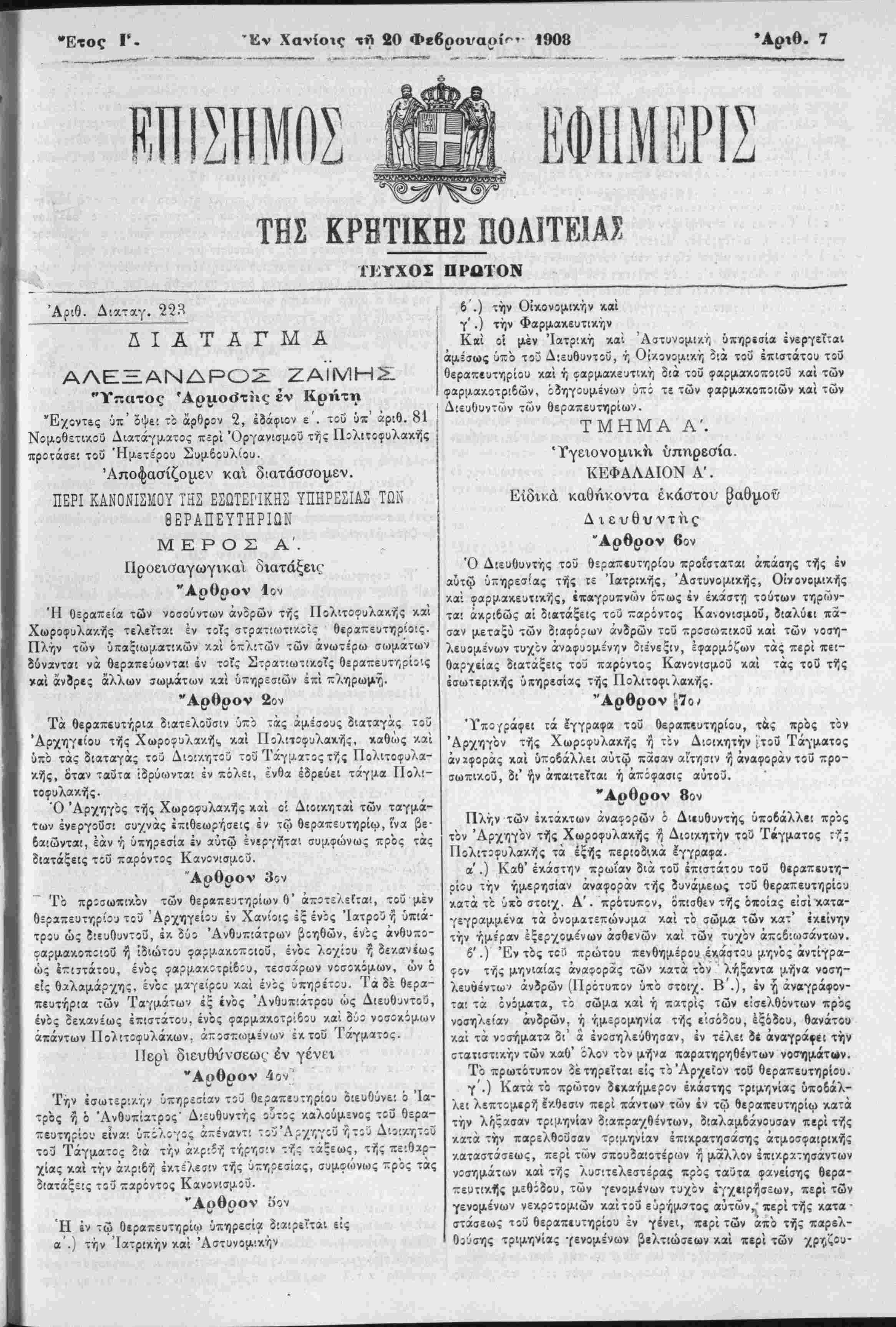 Εν Χανίοις τΛ 20 Φβ6ροναρί<~' 1908 •Αριθ. 7 ΚΠΙΣΤΤΜΟΣ ΕΦΗΜΕΡΙΣ ΤΗΣ ΚΡΒΤΙΚΗΣ ΠΟΛΙΤΕΙΑΙ ΤΚΥΧΟΣ ΠΡΟΤΟΝ Αριθ. Διαντχγ. 223 ΔΙΑΤΑΓΜΑ ΑΑΕ2ΞΑΝΔΡΟ5: ΖΑΪΜΗ_1 "Υπατος 'Αρμοό"τ>ις· έν Κρήτη