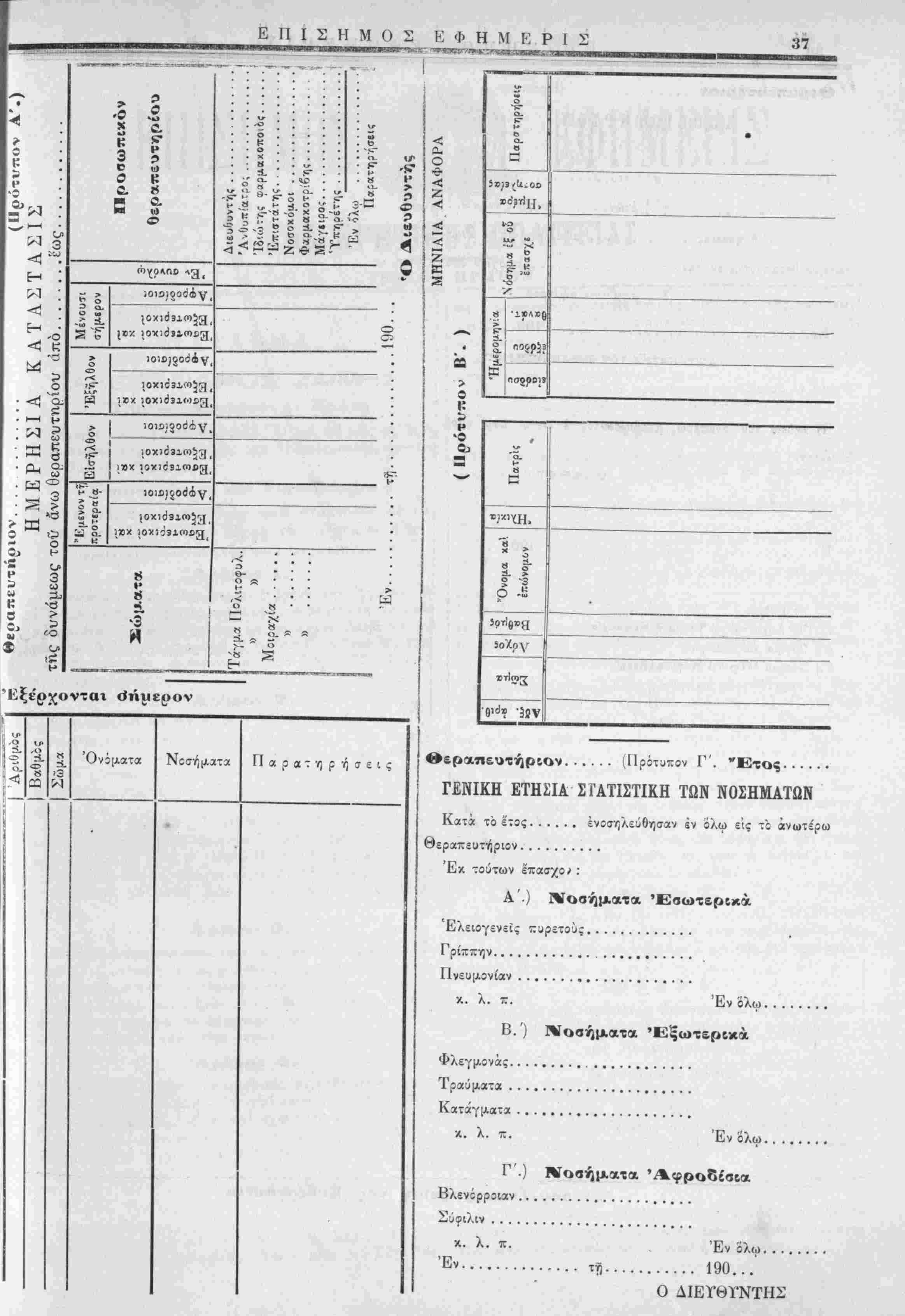 < 03 Όνόματα Νοσήματα Π α ρ α τ ν) ρήσεις ο ι: ρ •ο α. 5» 13 ^Μ^- (100001 β?·«ΧΗ, 1 I" § 1 Ο -ϋ 5οΧργ Θεραπευτήριον...... (Πρότυπον Γ'. "Ετος...... ΓΕΝΙΚΗ ΕΤΗΣΙΑ ΣΓΑΤΙΣΤΙΚΗ ΤΩΝ Ν0ΣΗΜΑΤί2Ν Κατά τό έ'τος...... ένοσηλεύθησαν έν όλω είς τ"ο α Θεραπευτήριον.......... Έκ τούτων έ'χασχο; : Α'-) Νοσήματα Έσωτ&ρικά Ελειογενείς ΐτυρετούς............. Γρίζ-ην....................... ΙΙνευμονίαν..................... κ. λ. π. Έν όλω Β.') Νοσήματα 'Εξωτερικά Φλεγμονάς..................... Τραύματα...................... Κατάγματα..................... κ. λ. π. Έν όλω Γ'■) Νοσήματα Άφροδίσια Βλενόρροιαν..................... Σύφιλιν........................ κ. λ. π. Έν όλω. . .. Έν.............. τί)........... 190...' Ο ΔΙΕΥΘΥΝΤΗΣ