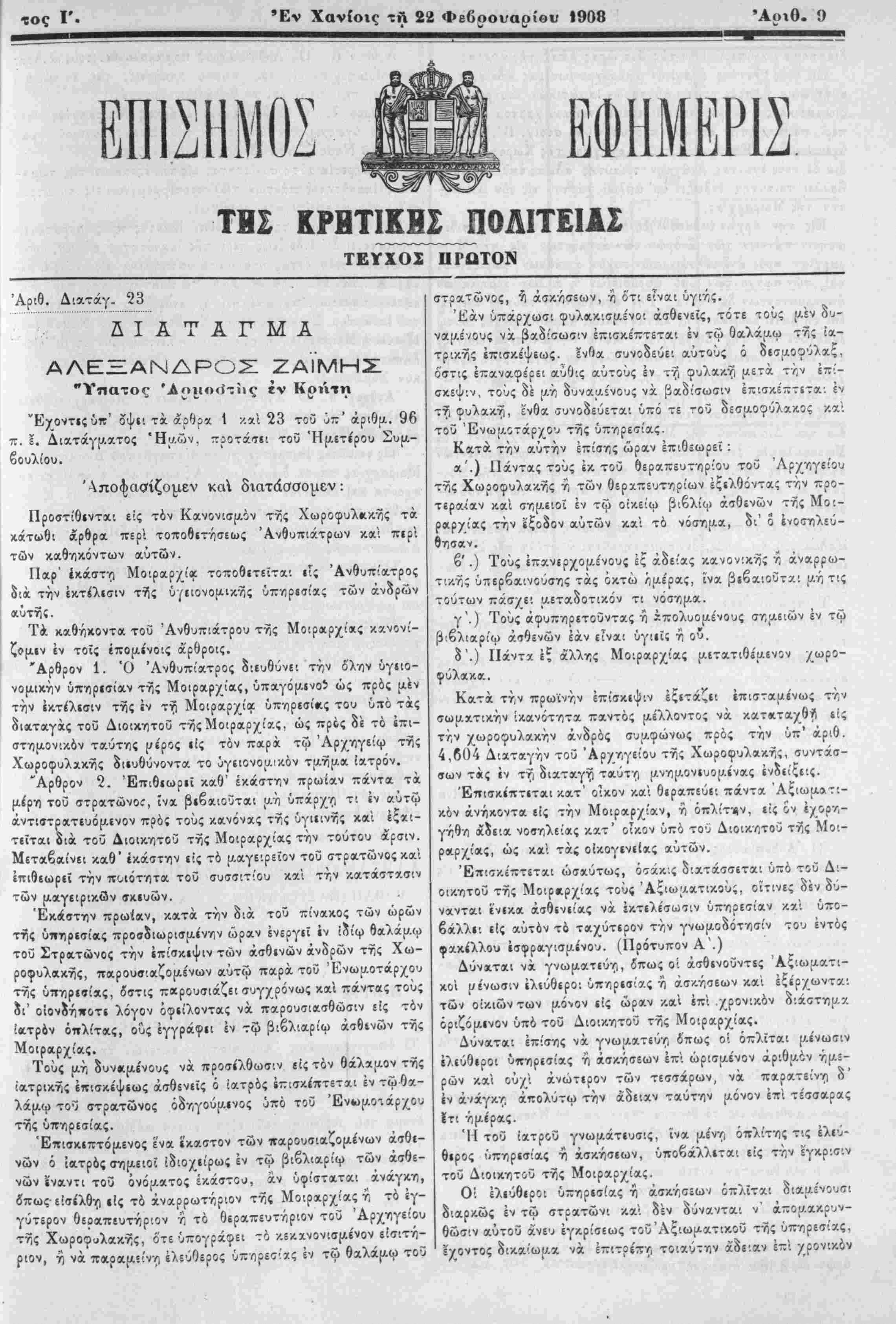 Έν Χανίοις τη 22 Φεοοουαοίου 1908
