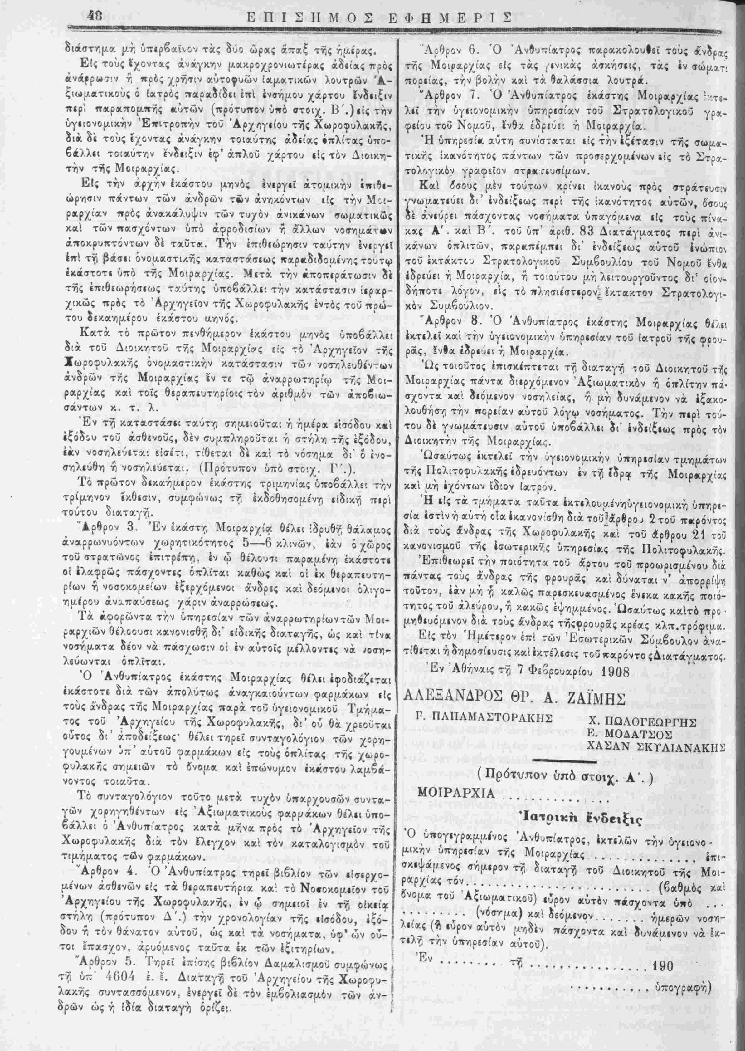 δέ άνιύρει πάσχοντας νοσήματα ύπαγόμίνα ι!ς τούς πίν<χ- κας Α'. κ*ί Β'. τοΰ ύπ αριθ. 83 Διατάγματος πιρί άνι- κάνων όπλιτών, παρκπίμπιι δι' ένδιίζεως αύτοΰ ενώπιον τοΰ έκτακτον Στρατολογι«.οΰ Συμβουλιον τοΰ Νομοΰ ε8οι ίδριύίΐ ή Μοιραρχία, ή το ούτου μή λιιτουργοΰντος δι' οίον- δήποτι λόγον, είς τό πλησιι'στιρον^κτακτον Στρατολογι¬ κόν Συμβούλιον. "Αρθρον 8. Ό Ανθυπίατρος ίκάστης Μοιρκρχία,ς θίλΐ! έκτιλιΐ καί την ΰγιιονομικήν ύπηρισίαν τοΰ ίατροϋ τής φρου- ρας, ίνΐα ϊδριυιι ή Μοιραονί*. Ώς τοιούτος έπισκίπτιται τή διαταγή τοΰ Διοικητοΰ τ^ς Μοιραρχίας πάντα διιρχόμιν&ν Αξιωματικόν ή όττλίτην πά¬ σχοντα καί οΊόμινον νοσηλείας, ή μή δυνάμινον νά εξακο¬ λουθήση την ποριίαν αύτοΰ λόγψ νοσήμα,τος. Την περί τού¬ του δέ γνωμάτιυσιν αΰτοΰ ύττοβάλλιι οι' ίνδιίξιως πρός τόν Διοικητήν τής Μθίραρχίας. Ωσαύτως έκτιλιϊ την ύγίΐονομ,ικήν ύπηρισίαν τμ,νιμάτων τής Πολιτοφυλακής ίδρΕυόντων έν τή ΐδρι^ τής Μοιρκρχία; κα'ι μή ενόντων Ίδιον ιατρόν. Ή ι!ς τα τμήματα ταυτα έκτιλουμένηύγιιονομική ύπηρι- σία εστίν ή αυτή οία ικανον'σθη διά τοΰ-ά'ρίροΛ 2τοΰ πειρόντοζ διά τούς άνδρας τής Χωροφυλακής καί τοϋ Λρθρου 21 τοϋ κανονισμοΰ τής έσωτ.ρικής ύπηρισί»ις τής Πολιτοφυλακήί. Έπιθιωριΐ την ποιότητα τοϋ άρτου τοΰ προωρισμέ'νου δι* πάντας τούς άνδρας τής φρουρας καί δύναται ν' άπορρίψϊΐ τούτον, εάν μή ■$ καλώς παρισκιυασμένος ενικα κακής ποιό¬ τητος τοΰ άλίΰρου,ή κακώς έψημμένος. "Ωσαύτως κα'ιτό προ ■ μηίιυόμινον διά τούς ά'νδρας τήςφρουράς κρέας κλπ.τρόφιμχ. Είς τόν ΊΙμίτιρον επί των Εσωτερικήν Σύμβουλον άνα- τίθίται ή δημοσίιυσις καί εκτέλεσις τοΰ ίταρο'ντο ςΔιατάγματος. Έν Αθήναις τή 7 Φίβρουαρίου 1908 ΑΛΕΞΑΝΔΡΟΣ ΘΡ. Α. ΖΑΪΜΗΣ Γ. ΠΑΠΑΜΑΣΤΟΙΆΚΗΣ Χ. ΠΩΛΟΓΕΩΡΓΗΣ Ε. ΜΟΔΑΤΣΟΣ ΧΑΣΑΝ ΣΚΤΛΙΑΝΑΚΗΣ ( Πρότυπον υπό στοιχ. Α'. ) ΜΟΙΡΑΡΧΙΑ ........... Ίατρικη ένδειξις Ό όπογιγραμμίνος Ανθυπίατρος, έκτιλων την ύγειονο- μικήν ύπηρισίαν τής Μοιραρχίας ... ......... 4πι- σκεψάμενος σήμιρον τή διαταγή τοΰ Διοικητοΰ τής" Μοι- ραρχίας τόν. ...................... (βαθμός καί δνομα τοΰ Άξιωμαπκοΰ) εύρον «ύτον πάσχοντα υπό ... ......... (νόστμα) καί δεόμινον ......ήμίρών νοση- λείας (9 εύρον αυτόν μηδέν πάσχοντα καί ουνάμινον νά Γ τιλή την ΰπηρίσίαν '' Έν.....'... υνάμινον νά Ικ- 190 υπογραφή) δρώ ρων ως η ιδία δι ιαταγη ορίζίΐ