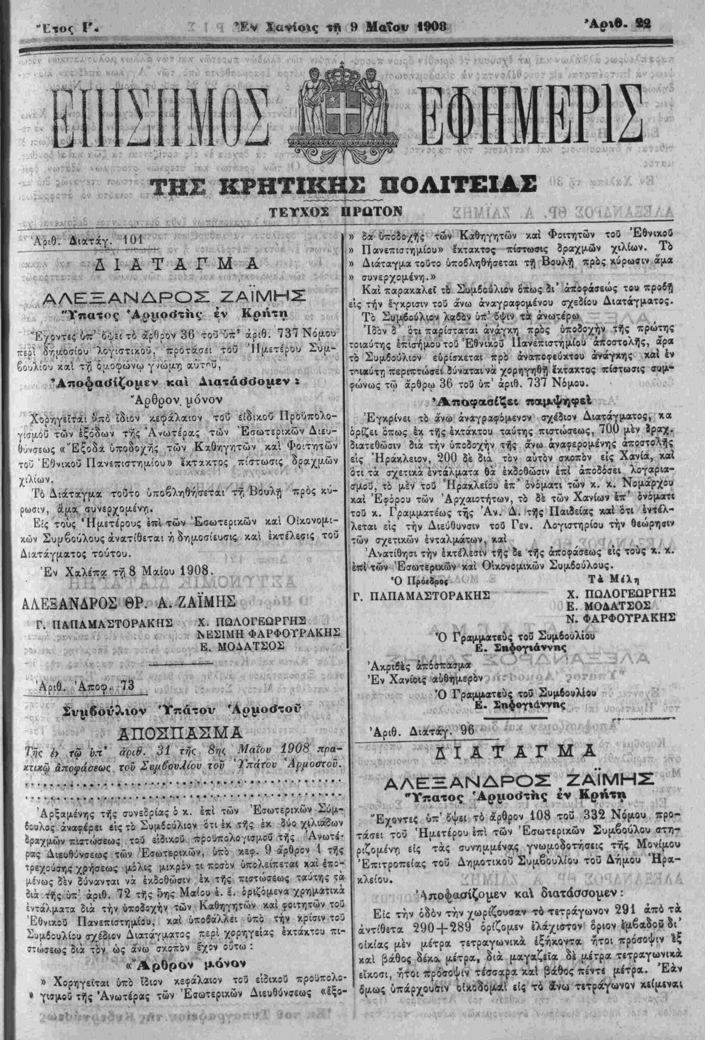 βουλιον χ αί τγ, όν.ο<ρώνω γ/ώαη αύτιΰ, Αποφασίζομεν καί Διατάσσομεν * Άρθρον υ.όνον Χόργΐγΐϊ-ίαι υπό ίδιον κεφάλαιον τού είοΊκ,οϋ Προϋπολο- γ'σμ,οΰ των έςόδων της Ανωτέρας των Έσωτερικών Διευ¬ θύνσεως «Έξοδα ΰποοοχης των Κχθηγνιτών καΐ Φοιτητών τοϋ ΈΟνιχοϋ Πανεπιστημίου» 'ίκτακτος πίστωσις δραχμών χιλίων. ' _ Φ**Λ Τό Διάταγμ,α τουτο ΰποβλ·/)θτισεται ττ, Βόι»λ?] πρός κύ- ρωοιν, άμα συνερχομε'νη. Είς τοΰς 'Ημετέρους επί των Έσωτερικών καί Οϊκονομι- χ.ών Συμβούλους άνατίθεται ή δτ;μ.οσίευσις καί εκτέλεσις τοϋ Διατάγματος τούτου. Έν Χχλέπα τη 8 Μαίου 1908. "' *~ ΑΛΕ3ΑΝΔΡ0Σ ΘΡ. Α. ΖΑΪΜΗΣ Γ ^· ' Γ. ΠΑΠΑΜΑΣΤΟΡΑΚΗΣ Χ. ΠΩΛΟΓΕΩΡΓΗΣ ΝΕΣΙΜΗ ΦΑΡΦΟΤΡΑΚΗΣ Ε. ΜΟΔΑΤΣΟΣ ν , . Ύπάτον 'Αρμοότον ΑΠΟΧΠΑΣΜΑ ^«-*.-,,: Τής ά$ %ρ·^2ριθ. 31 τής 8τ,(. Μαίον 1908 πρα- ω αποφάσεως τού ΣιψβονΜου τού 'Τπάΐ'ου Άρμοατοΰ. Άρξαμε'νης τής συνεϊρίας ό κ. επί των Έσωτερικών Σύμ- 6ιυλος «ναφέρβι ϊ'ις τό Συμβούλιον ότι έκ τής έκ δύο χιλιάδων ίρΐχμών πιστώσεως τού είδιχοΰ προυπολο ^ισμσΰ τής Ανωτί- ρϊς Διευθύνσεως των Έσωτε-ρικών, υπό κεφ. 9 αρθρον 1 τής τρεχούσης χρήσεως μόλις μικρόν τι ποσόν ϋπολείχεται χαί έπο- ,-ΐ^ως δέν δύνανται νά έκδςθώσιν έκ τής πιστώσξως ταύτης τα ίιά τής ύπ' αριθ. 72 τής 5ης Μαίου έ. έ'. όριζόμενα χρηματικά ε 'τάλματα διά την ύποδοχήν των ΚαΘηγητών καί φοιτητών τού Εθνικοϋ Πανεπιστημίου, καί ύποδάλλει υπό την κρίσιν τού -Λμδΐυλίου σχέδιον Διατάγματος περί χορηγείας έκτάκτου πι- ϊτώσεως διά τδν ώς ά"νω σκοπόν έχον οίΐτω : «"Αρθρον μόνον » Χορηγεϊται υπό ίδιον κεφάλαιον τοΰ ε'ιδικοϋ προύπολο- τής Ανωτέρας των Έσωτερικών Διευθύνσεως «εξο- » δα ύχοδο/ής των ΚαΘηγητών καί Φοιτητών τοϋ Έθνικοδ » Πανεπιστημίου» Ικτακτος χίστωαις δραχμών χιλίων. Τό » Διάταγμα τούτο ύποδληθήσεται τή Βουλί) πρός κυρωαιν άμα » συνερχομένη.» Καί παρακαλεΐ το Συμβούλιον Οπως δι* αποφάσεως τού προβή1 εις την έγκρισιν τοΰ ά'νω άναγραφομένου σχεδίου Διατάγματος. Τό Συμβούλιον λαβόν ύπ' όψιν τα ανωτέρω Ίδόν δ' ότι παρίσταται άνάγκη πρός ύποδοχήν τής πρώτης τοιαύτης επισήμου τού Έθνικοΰ Πανεπιστημίου αποστολάς, αρ« τό Συμβούλιον ευρίσκεται πρό άναποφεύκτου άνάγκης καί έν τιιβύτίΐ περιχτώσει δύναται νά χορηγηθί) ϊκτακτος πίστωσις αιιμ* φώνως τω ά'ρθρω 36 τοϋ ύχ' αριθ. 737 Νόμου. Άποφασίζει παμψηφεί Έγκρίνει τό ά'νω άναγραφόμενον σχέδιον Διατάγματος, κα δρίζει όπως έκ τής έκτάκτου ταύτης πιστώσεως, 700 μέν ίραχ. διατεθώσιν διά την ύποδοχήν τής άνω άναφερομένης άχοστολής είς Ηράκλειον, 200 δέ διά τόν αυτόν σκοπόν είς Χανία, καί ότι τα σχετικά έντάλματα θά έκδοθώσιν επί άχοδόσει λογαρια- σμοΰ, τό μέν τοθ Ηρακλείου έπ' ονόματι των κ. κ. Νομάρχου καί Έφόρου των Άρχαιοτήτων, τό δέ των Χανίων έχ' ΐνόματι τού κ. Γραμματεύς τής Άν. Δ. 'τί)ς Παιδείας καί 'ότι 4ντέλ- λεται είς την Διεύθυνσιν τοθ Γεν. Λογιστηρίου την θεώρηβιν των σχετικών ένταλμάτων, καί Άνατίθησι την εκτέλεσιν τής δέ τί]ς αποφάσεως εις τοϋς κ. κ. επί των Έσωτερικών καί Οικονομικήν Συμδοΰλοι»ς. Ό ΙΙρόίδροί Τ* Μίλη Γ. ΠΑΠΑΜΑΣΤΟΡΑΚΗΣ -6·""*1""*- χ. ΠΩΛΟΓΕΩΡΓΗΣ! Ε. ΜΟΔΑΤΣΟΣ Ν.ΦΑΡΦΟΤΡΑΚΗΣ Ό Γραμματεύς το3 Συμδουλίου Ε. Ση^ογι&τ Άκρτίές άχόσχασμα Έν Χανίοις α6θημερόν ».-«· .· ...Ό Γραμματεύς τοδ Συμ6οι»λί«υ Ε. ΣπΑογιάννης ,_ ^ Αριθ. Δίατάγ. 96 ΔΙΑΤΑΓΜΑ ΑΛΕΞΑΝΔΡΟΣ ΖΑΐΊνΙΗΣ: "Υπατος 'ΔρμοίίτΗς έν Κρήτη Έχοντες ύπ' δψιι τ6 άρθρον 108 τοΰ 332 Νόμου προ- τάσει τοϋ Ήυ.ετέρου επί των Έσωτερικών Συμ.βούλου οτη- ριζομένγι είς τάς συνημμένα,ς γνωμοδοττ,σιις της Μονίμου Επιτροπείας τοΰ Δϊ]μ.οτικοΰ Συμβουλίου τοΰ Δήμου "