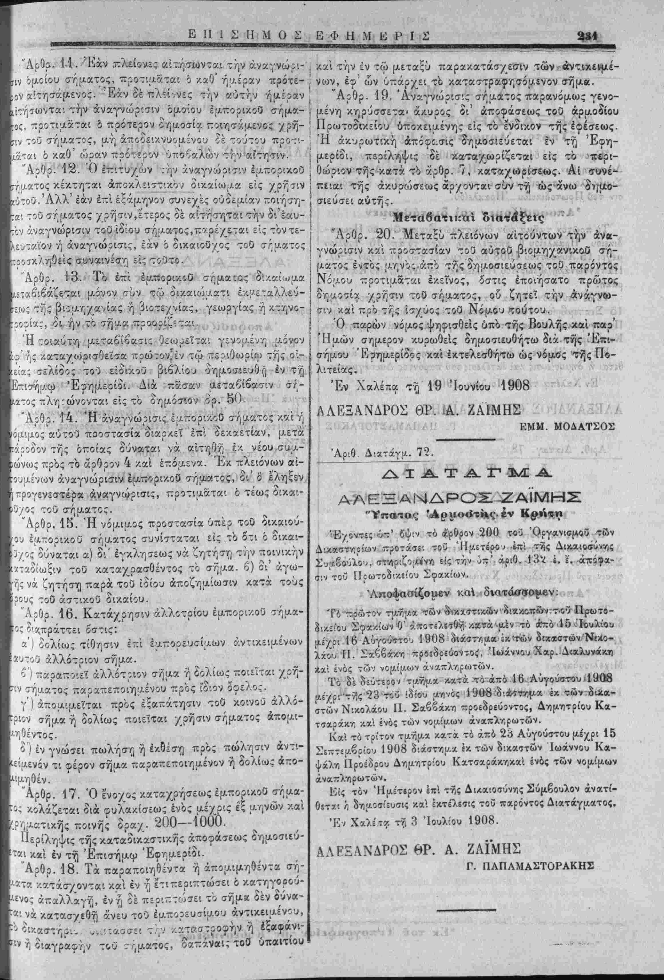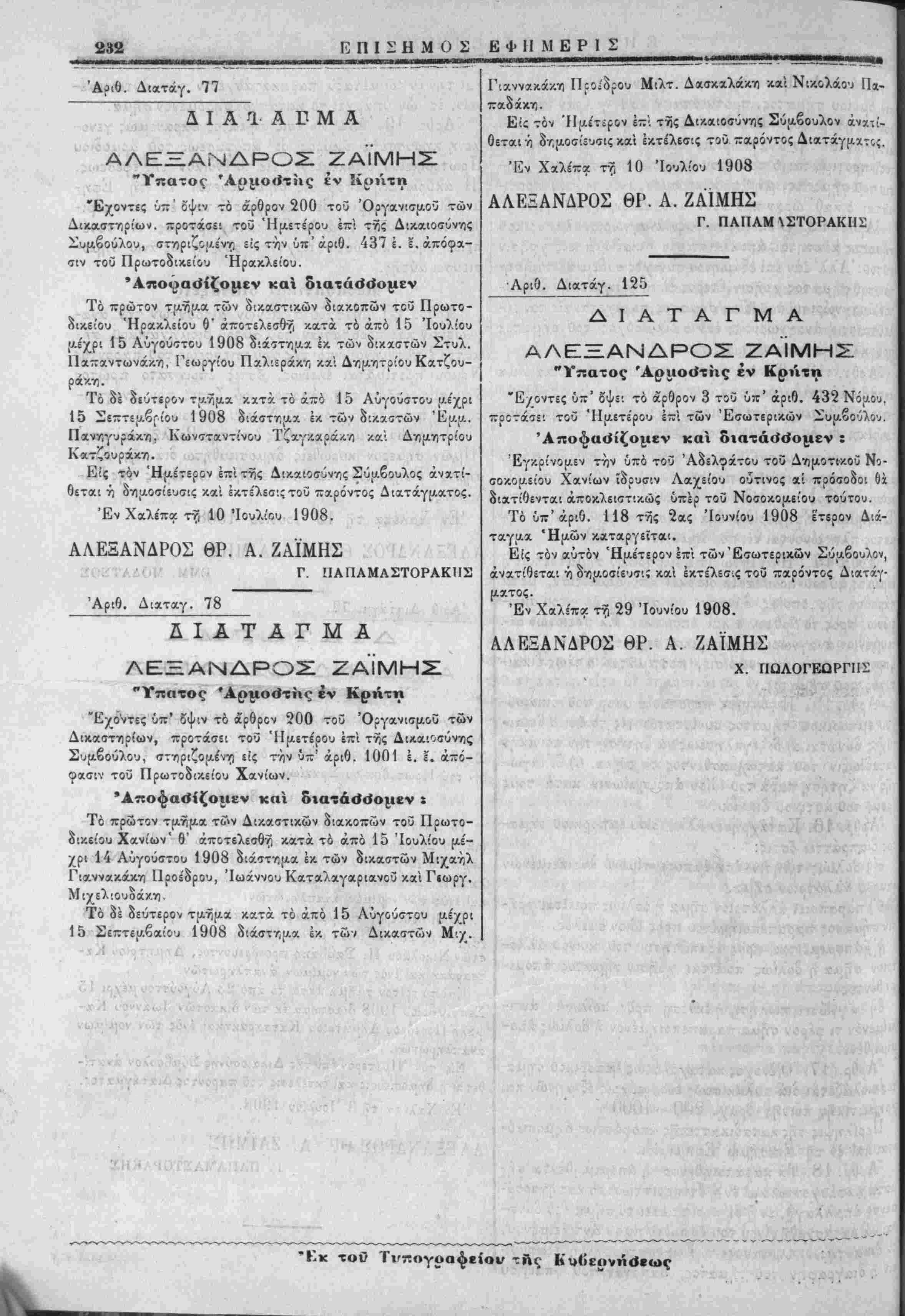 θίτχι /) δτι;ο.ο«ί5υ<τις καί έκτέλειΐις τοϋ παρόντος Διατάγματος. Έν Χαλε.τκ τ? 3 Ιουλίου 1908. ΑΛΕΞΑΝΔΡΟΣ ΘΡ. Α. ΖΑΙΜΗΣ Γ. ΠΑΠΑΜΑΣΤΟΡΑΚΗΖ