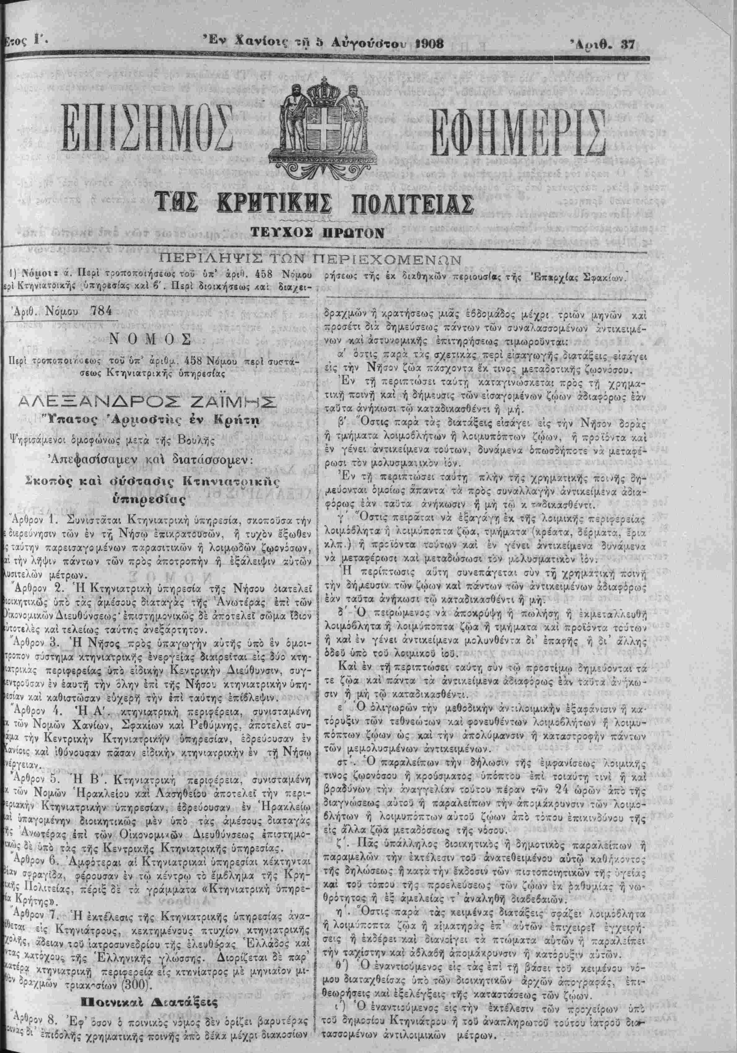 Αρθρον 1. Συνισταται Κτηνιατρική ύπηρεσία, σκοπούσα την }