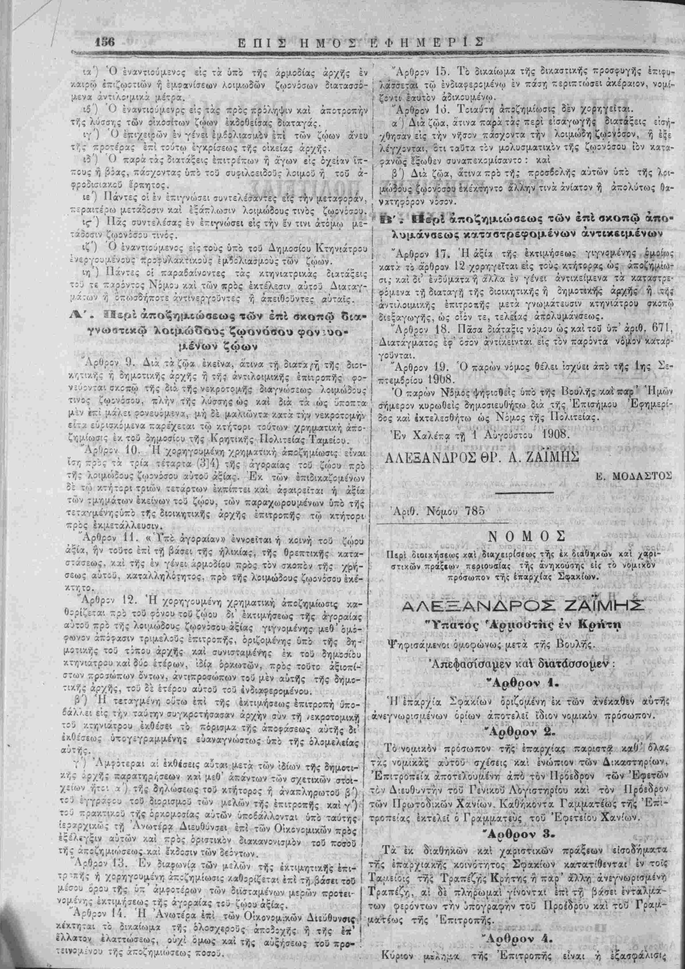 χϊίων ήτο·, χ') τής 8<;λώσεως τού κτήτορος ή άναχληρωτού β' τού ίγγρ*?ίυ τοϋ διορισμού των μελών τής έπιτροπής καί ν'1 αλεξιανΑρο_: ζ "Υπατθς Άρμοο'της έν ομοφώνως μετά της Βουλης. - Άπεφασίσαυ.εν τ.αχ διατάσσο^βν: Γ ' "Αρθρον 1. ·· .ί ΊΓέπάρχΊ'α Σφακίων όριζομένη έκ των άνέκαθεν αΰτηί άνεγνωρισμένων όρίων αποτελεί ίδιον νομικόν πρόσωπον. "Αρθρον 2. Τό νομΐϋον πρόσωπον της επαρχίας παρ,ιστα καθ' 6'λ*ς.· τκς νομικαϊ Λοτοΰ σχέσεις καί ενώπιον των Δικαστήριον Έπιτροπ'ίίχ αποτελούμενη άπό τόν Πρόεδρον των Ί "Αρθρον 13. Ε ■κης ή ς/ορηγι όρου τί!; ύ~ Εν δ'.αφωνία των μελών τής έκτιμητικής γουμένη άχ:ζημίωσις /.αθορίζ=ται επί τή,βάσε ιεσου ορου τής 6~'αμφοτέρων των διισταμένων μίρών χροτει- ομένν;ς εκτιμήσεως τής άγ:ραίας τίύ ζώου άξίας. Άρθρον 14. Ή Ανωτέρα επί των Οίκονομ.κών Διεύθυνσις- κε'κτηται τό δικαίωμα τής όλοσχερούς ά-οδοχής ή τής έ*' ΐλλατον ελαττώσεως, ούχι όμως καί τής αϋςήσεω; τού προ- τίΐνί,λ.νου τ»;; ά-οζημιώσεως χοσον. ρ μ ρρ ^ τόν Διευθυντήν τοΰ Γενικοΰ Λογιστνιρίου καί τ6ν ΙΙρόεδρον'1· των Πρωτοοικων Χανίων. Καθηκοντα Γαμμαΐέως της Επι* τρο-είας έκτε.λίί ό Γραμματίΰς τοϋ Έφβτείου Χανίων. "Αρθρον 3. Τα" έκ οίαθηκών καί χα,ρτστικών πράξβων έ Σ θ χρ ρ έχι- Ι τ?ί έιταρχιακίις κοινότητος Σφακιων κατατίθίνται έν τοίς" άσει τοθ ■ Τ/α,ι/.είοις της Τραπέζης Κρήτης η χαρ" άλλνι άνίγνωρισμένί) " Τζ ε έλίά ρ ρ ρ γ Τραπέζν·,, «ί οί πληρωμαί γίνοντχι επί ττ, βάσει των φερόντων την ύπογραοην τοΰ Προέορου καί τοΰ της Έπιτροπης. Κύριον "Αρθρον 4. τής Έπιτροπης είναι η 5ζ*σφ*λΐσΐ4.,