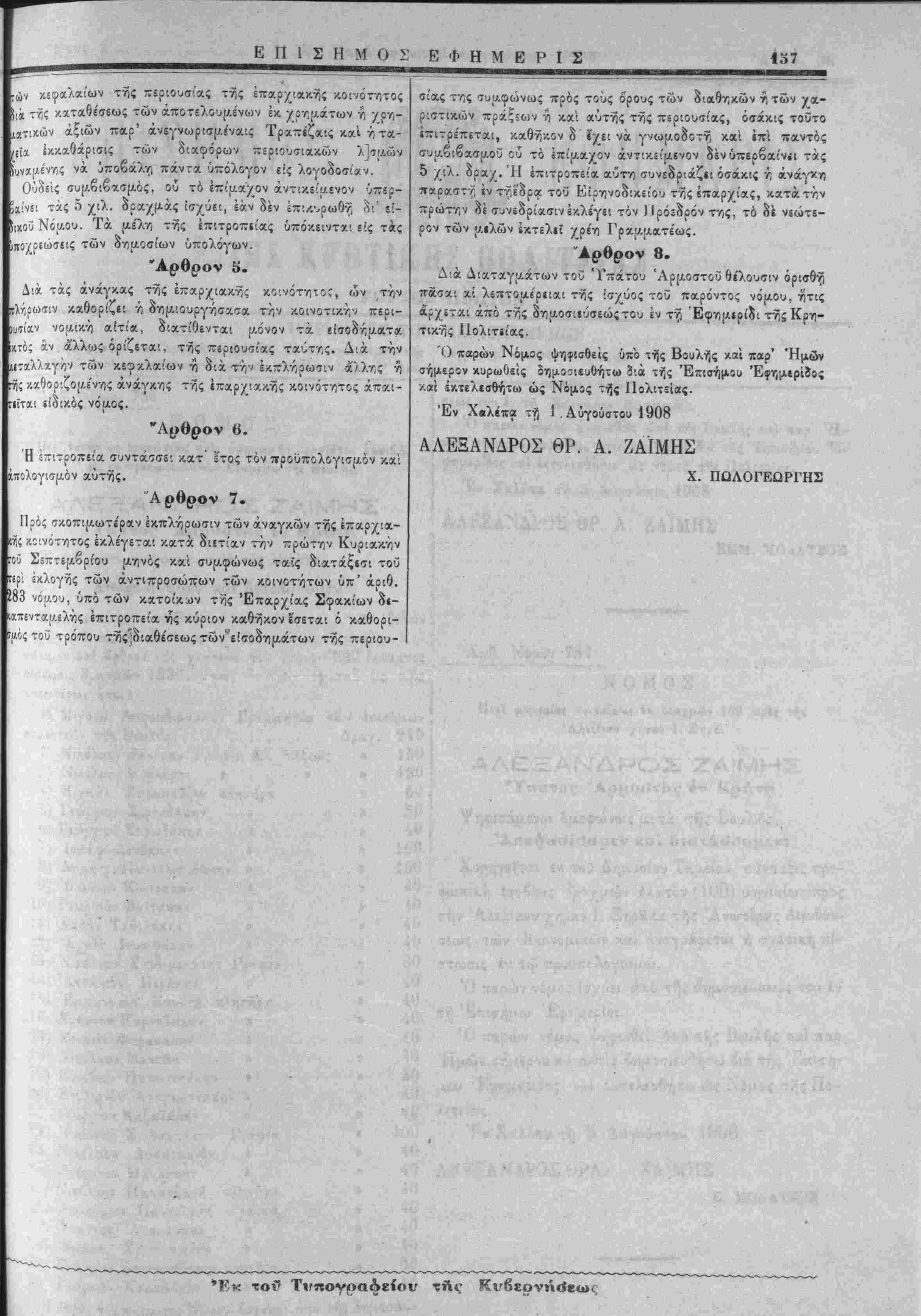 Διά Λιαταγμάτων τοθ Τ—άτου Άρμοστοΰ θέλουσιν ορισθή