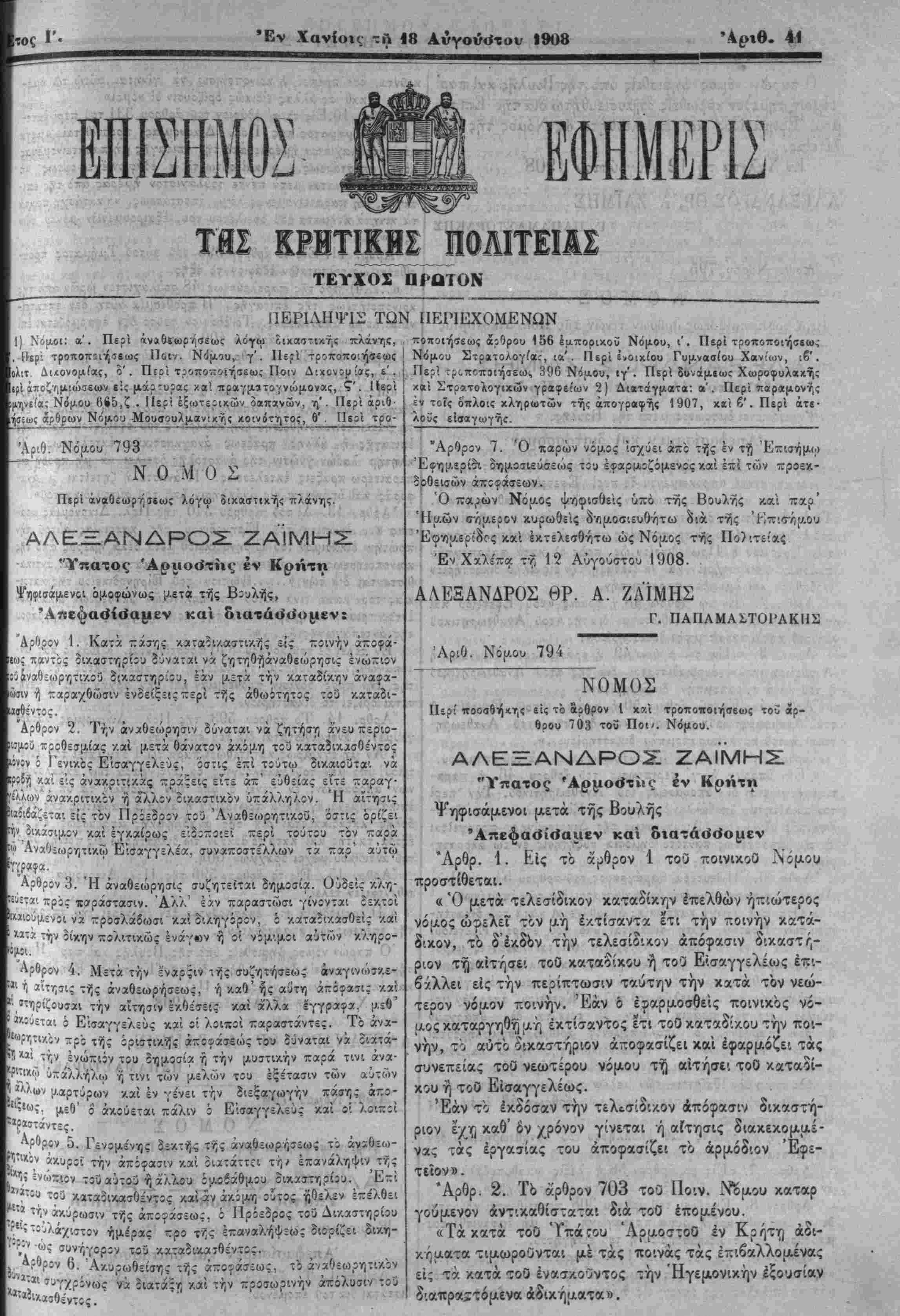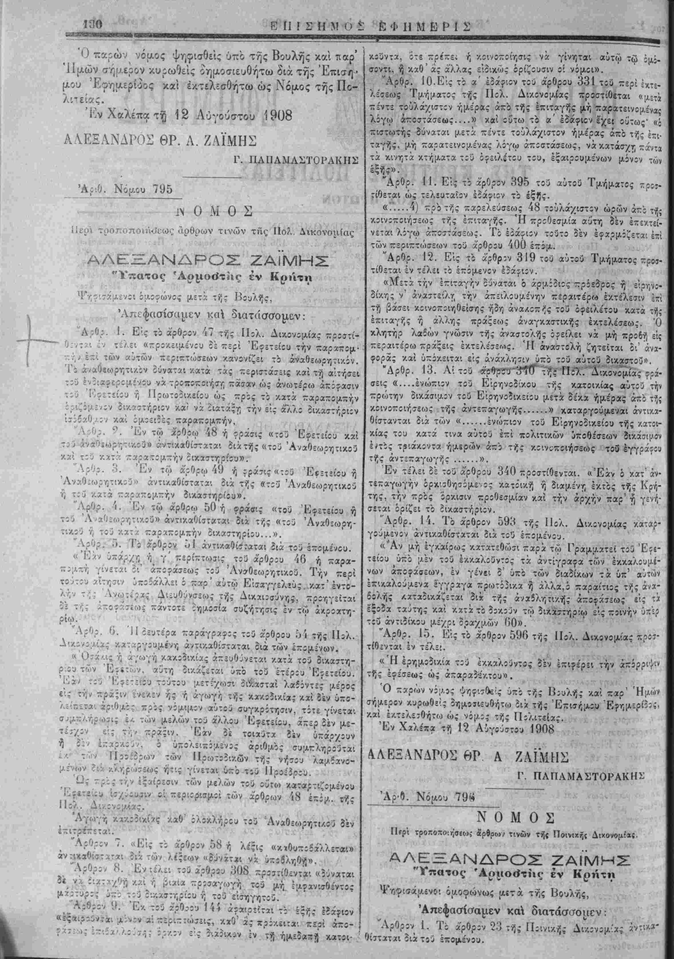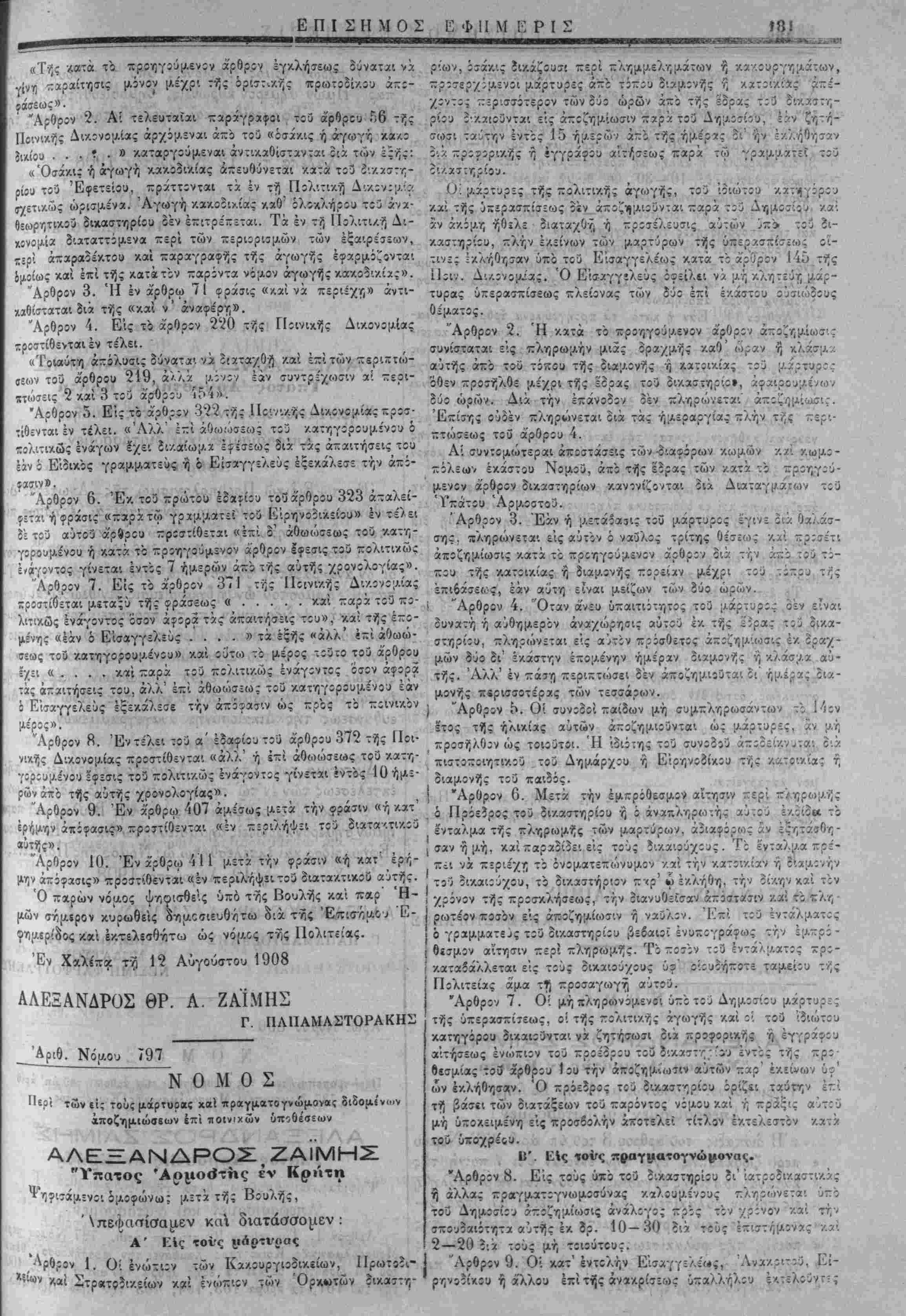 ΈφημερίθΓς κκι βκ-ίλεσθήτω ώς Νόμος τής Πο>ιτεία< Έν Χχλέπα τγ, 12 Αϋγούστου 1908. ΑΐΥΕΞΑΝΔΡΟΣ ΘΡ. Α. ΖΑΙΜΗΣ Γ. ΠΑΠΑΜΑΣΤΟΙΆΚΙϋΙ Αριθ. Νόμου 794 ΝΟΜΟΣ ΙΙερί ποοσβήχτ,ί εις τ'ο άρθρον 1 χ?.ΐ τροΐΓοποιήσβω; τοϋ άρ- θίθυ 703 τοΰ Ποκ. Νόμου. ΑΛΕΞΞΑΝΔΡΟΝ ΖΑΙΜΗΣ "Υπατος *Αρμο«ίτΐις· έν Κ^τίτη Υηφισάμενοι μετά τής Βουλής Άπε^α<ϊί<1αιιεν καί διατάόόομεν Άρθρ. 1. Είς το άρθρον 1 τοθ ποινικοθ Νόμου προστίθεται. « Ό μετά τελεσίδικον καταδίκην έπελθών ήπιώτερος νόμος ώφελεΤ τον μή έ/τίσαντα ετι τήν ποινήν κατά- δικον, το δ'έ-λδον τήν τελεσίοΐΛον απόφασιν δικαστή¬ ριον τη αϊτήσει τοθ καταδίκου ή τοθ Εισαγγελέως επι¬ βάλλει είς την περίπτωσιν ταύτην τήν κατά τον νεώ¬ τερον νόμον ποινήν. Εάν δ έραρμοσθείς ποινικος νό¬ μος καταργηθή μή έκτίσαντος ετι τοθ καταδίκου τήν ποι¬ νήν, τ'ο αύτο δικαστήριον άποφασίζει καί έφαρμόζει τάς συνεπείας τοθ νεωτέρου νόμου τη αίτήσε». τοθ καταοί- κου ή τοθ Εισαγγελέως. Εάν το έκδόσαν τήν τελασίδικον απόφασιν δικαστή¬ ριον έ·/Ί() καθ* δν χρόνον γίνεται ή αίτησις διακεκομμέ- νας τάς εργασίας τού άποφασίζει το αρμόδιον 'Εφε- τεΐον». Άρθρ. 2. Το άρθρον 703 τοθ Ποιν. Νδμου καταρ γούμενον άντικαθίσταται διά τοθ έπομένου. «Τα κατά τοθ Τπάςου Άρμοστ,οΟ έν ΚρΓ|τη άδι- κτ,ματα τιμωροθνται μέ τάς ποινάς τάς επιβαλλομένας εί; τ-), κατά τοθ ένατκοΰντος την Ήγεμονικήν εξουσίαν διαπραίτόμενα άδικήματα».