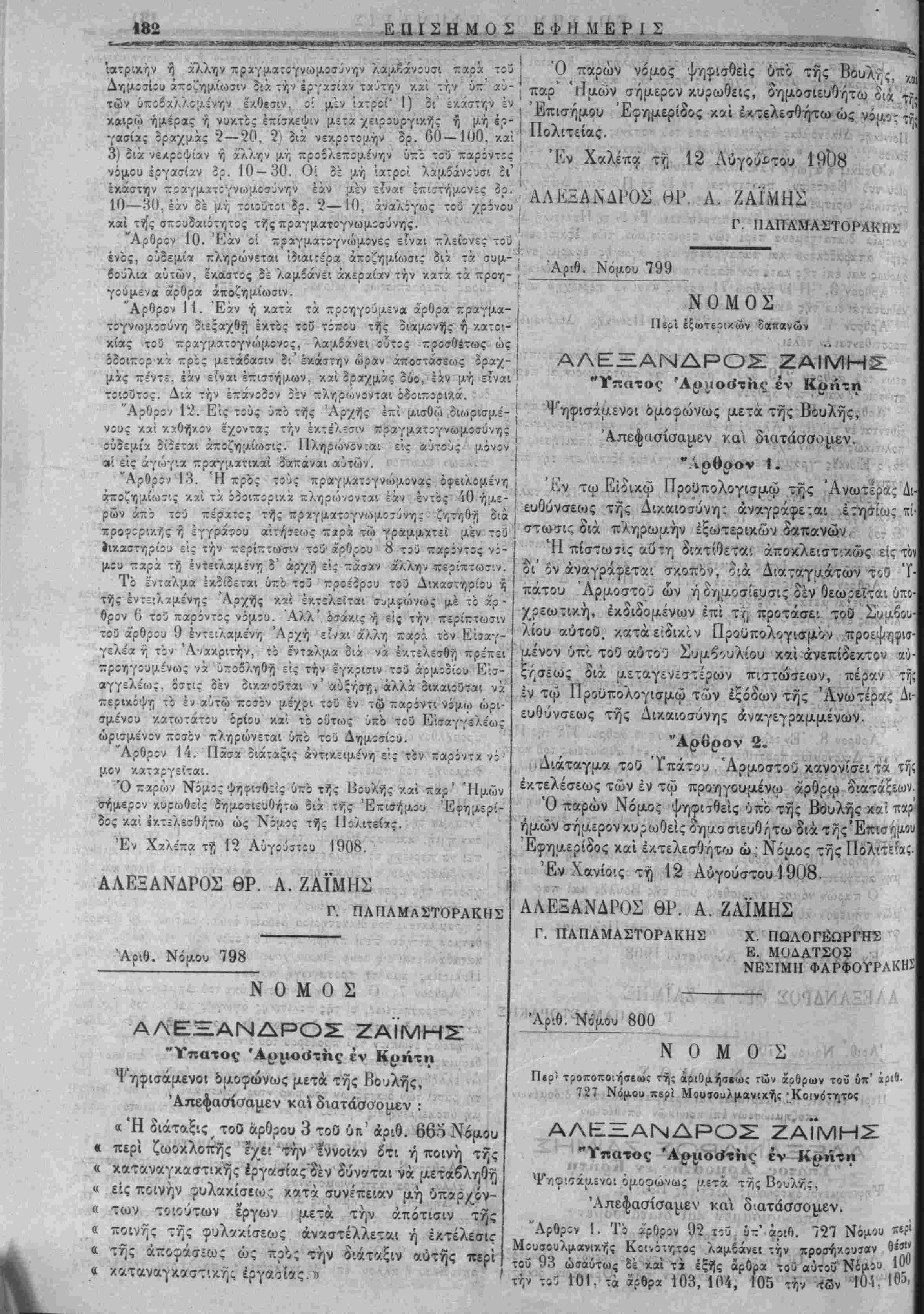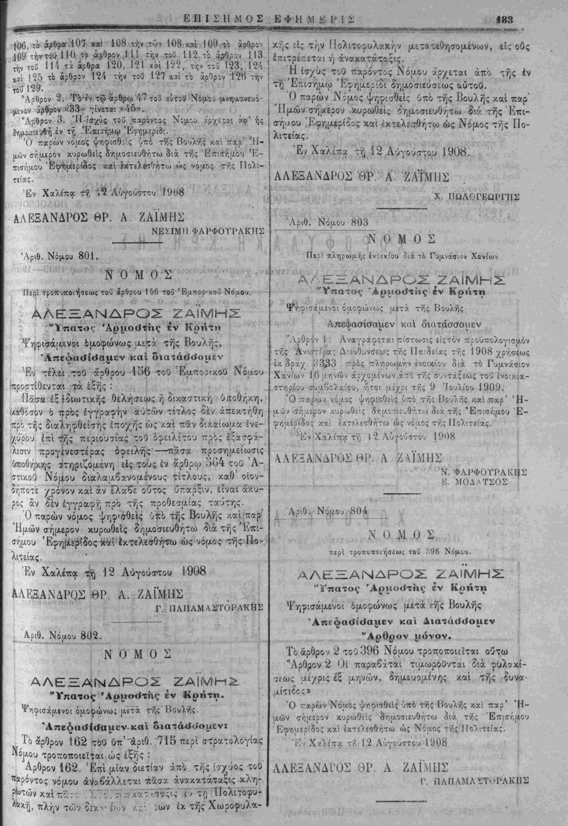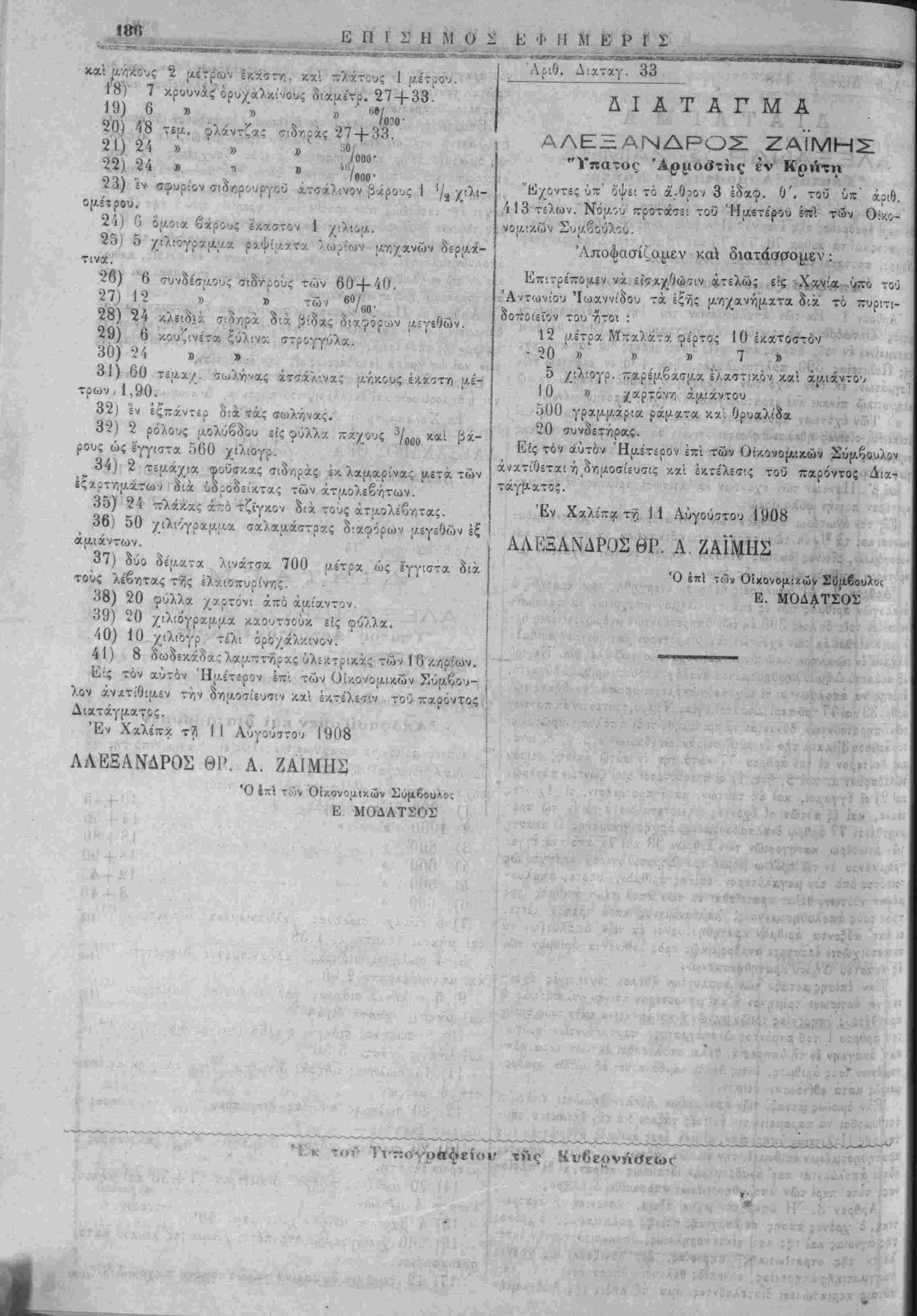 άνατιθεται ή^ημοσίίυιις χ.α'ι έ*τ·6λε<Τ'ς τού πα.ρόντος Δια- τάγματοί. Έν Χ-Λίπχ, τ-(ί 11 Αύγούστου 1908 ΑΑΚ5ΑΝΔΡΟΣΘΡ. Α ΖΑΙΜΗΣ Ό επ! των Οΐχθνομιχών Ε. ΜΟΔΑΤΣΟΣ Διατάγμχτος. ,, ^ „ Έν ΧχΚίπχ τ7ι 11 Αύγοϋττο·; 1908"""^ ' " * ΑΛΕ3ΑΝΔΡ0Σ ΘΡ. Α. ΖΑΙΜΗΣ "Ο έπϊ των θϊχονομιχών Συμβουλο; Ε ΜΟΔΑΤΣΟΣ .----------Λ . '■>