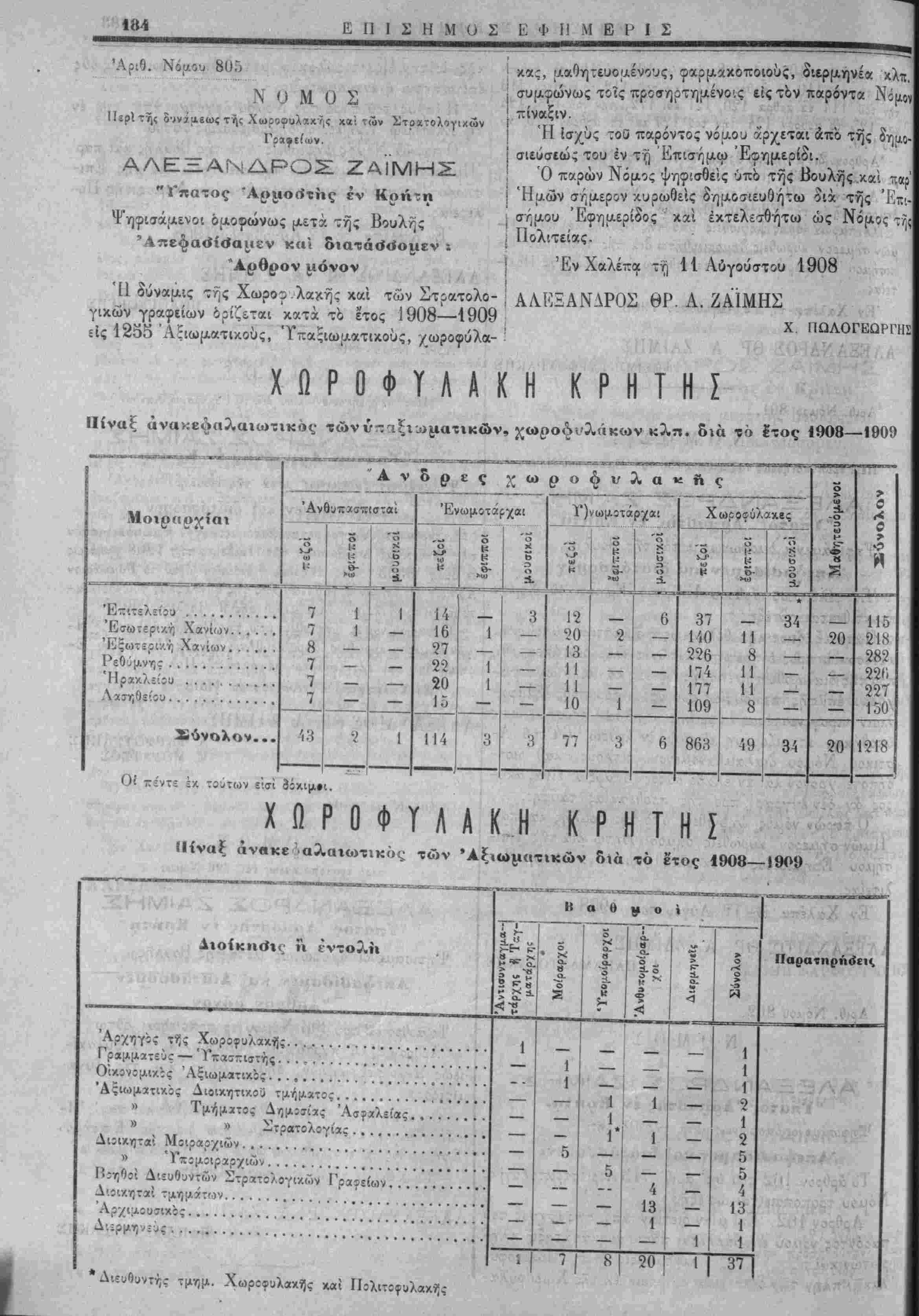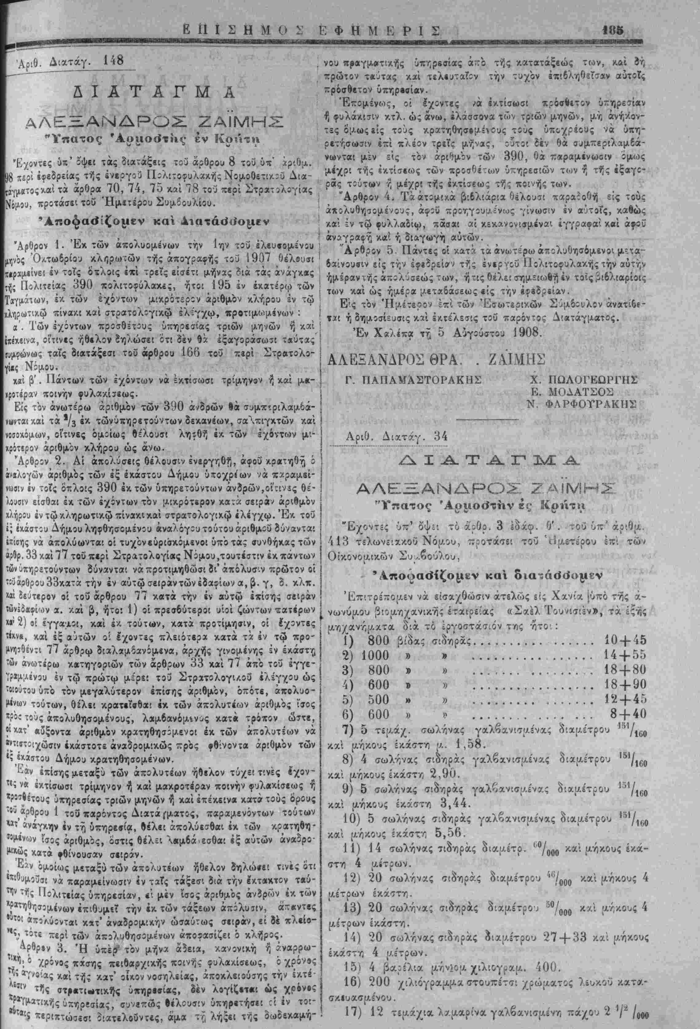 <αι Βεηερον οί τοΰ άρθρου 77 κατά την έν αύτω έπίσης σειράν ίνίδϊφίίον α. καί β, ήτο: 1) οί πρεσδυτεροι υίοί ζώντων ττατέρων ΐ' 2) οί ίίγγαΆθ!, καί έκ τούτων, χατά προτίμησιν, οί έχοντες *ν», καί έξ α'ηών ο; Ιχοντϊς πλειότερα χατά τα έν τώ προ- ■νηΐβίντι 77 άρθρω διαλϊμβανόμενα, άρχής γινομένης ΐν έκάστς ανωτέρω κατηγοριών των άρθρων 33 καί 77 άπό τοΰ έγγε- ι;·ιίνου έν τώ πρώτψ μί'ρε: τοΰ ΣτρατολογΐΑθΰ έλέγχου ώς υπό τόν μεγαλύτερον έπίσης αριθμόν, όπότε, άπολυο- |ΐινων τούτων, θίλίΐ κρατεϊβθαι έκ των άπολυτέων άριθμός ί'σος *ροί τούς άπολυθησομένους, λαμδανόμ'.ν^ς κατ« τρόπον ώττε, ιιχατ' «ύξοντα αριθμόν κρατηθησίμενοι έκ των άπολυτίων νά εκάστοτε άναδρομιχώς πρός φθίνονΐα αριθμόν των ί εκάστου Δήμου κρατηθησομένων. έπίσης μεταξΰ των άπολυτέων ήθελον τύχει τινές ίχον- ■·ί ν« βκτίσωσι τρίμηνον ή καί μαχροτέραν ποινήν φυλαχίσεως ή" ς υπηρεσίας τριών μηνών ή καί έπέκειν* κατά τούς ό'ρους θϋ^αρθρου 1 τοΰ παρόντος Διατά^ματος, παραμ,ενόντων τούτων ΰϊ *νϊγχην »ν τη ΰπηρεσία, θέλει άπολύεσθαι έκ των κρατηθή- "μ«νων ίσος άριθμός, όστις θέλει λαμδά-εσθαι έξ αυτών άναδρο· ιι"'3ς χατά φθίνουσαν σειράν. ^ν ομοίως μεταξϋ των άπολυτέων ήθελον ίηλώίϋ τινές ότι 'ψοΰσι νά παραμείνωσιν έν ταίς τάξίσι διά την έκτακτον ταύ- ;1ί; Πολιτείας υπηρεσίαν, «1 μέν ϊσος άριθμός άνϊρών έκ των «Ρϊτηθησομένων έπιθυμιΐ την έκ των τάξεων άπόλυκν, ά-«ντες '! «ποΛύονται χ*τ' άναδρομΐχήν ωσαύτως σειράν, εί δέ πλείο- περί των άπολυθοσομένων «πθίασίζει ό κλήρος. , νού πεαγμβτιχής υπηρεσίας άιτό τής κατατάξεώς των, /.αι δή πρώτον τ*ύτο<ς αϊΊ τελευταίον την τυχόν έπιδληθεΐσαν αυτοίς πρόσθετον υπηρεσίαν. Έχομένως, οί Ιχιντες ^ά έν.τίσωσι πρόσίιτον ύ~ηρετίαν τ) φυλά/ιτιν ν.τλ. ώς άνω, έλάσσονα των τριών μηνών, μ.ή ανήκον¬ τες δμως.ΐς τοός κρατηθησεμ·5ους τους ΰπο-/ρέους νά ύπη- ρετήσωσιν επί πλέον τρείς μήνας, ;ότθ! δέν θά σομπεριλαμβά- νωνται μίν είς τόν αριθμόν των 390, Οά ταραμΐνωσιν όμως μέχρι τής έκτίσβως των προσβέ~ων ·!ι~ηρεσιών των ή τής έξαγο- ρας τούτων η μί/χρι τής έκτίσίως τής ποινής των. Άρθρον 4. Τάάτίμι/,ά β'.δλιάρια θέλουσι τταραίοθή είς τούς ««ολυθησομένους, ά<ρ;ΰ προτ,γουκ,ένιος γίνωσιν έν αυτοίς, καθώς καί ίν τω φυλλαδίψ, πάσαι αί κεκανονισμίνα'- έγγραβαί καί άφοΰ ι ανεγράφη κ«ί ή διαγωγή αυτών. ι Αρθρον 5 Πάντες οί κατ!« τα ανωτέρω άπϊλυθησόμενοι μ;·:α- βαίνουβιν είς την έφιϊρείαν τής ένερνοϋ' Πολίτοφυλακήςτήν αυτήν ήμέρανχής απολύσεως των, ήτις ©ϊ/εί σημειωβήέν τοίςβιδλίαρίοις των καί ώς ήμέρα μ.εταδάβεως είς την έφιδρείαν. Ι Ε'ς τόν Ημέτερον επί των Έσωτερικών Σ^μδίΐ'λον άνατι6ί- | ιχι ή δημοσίευσις καί εκτέλεσις τοϋ παρόντος Διατάγματος. Έν Χαλέπα τη 5 Αΰγούστου 1908. ! ΑΑΕΞΑΝΔΡΟΣ ΘΡΑ. . ΖλΙΜΗΣ Γ. ΠΑΠΑΜΑΣΤΟΡΑΚΗΣ Χ. ΠΩΛΟΓΚΩΡΓΗΣ Ε. ΜΟΔΑΤΣΟΣ Ν. ΦΛΡΦΟΤΡΑΚΗΧ Αριθ. Διαταγ. 34 "ί« ΑΛΕΞΑΝΔΡΟΣ ΖΑΜΗΈ "νπατος Άριιοίίτην έ*ς Κρήτη "Εχοντίς ύπ' δψΐΐ το άρθο. 3 έδά,ο. θ'. τοΰ ϋπ' άριθμ. 413 τελωνειχκοΰ Νόμου, προτάιει τοΰ ΊΙ[/.ετέρου επι των Οικονομικήν Συ^.οούλου, ■ 'ίΙποόαΛίζομεν καί δια-άο"ο"υμεν Έχιτρέποΐλεν νά εισαχθώσιν άτελώς είς Χχνία. |ΰπό της ά- νωνύμου ^'.οιχηχανικης έταιρείας «Σαέλ Τουνισΐβν», τα εξής μηχανηι/.ατα διά το ΐργοστάΐιόν της ητο' : 1) 800 βίδας <ΓΐοΎ>ρ«ς................ 10 + 45