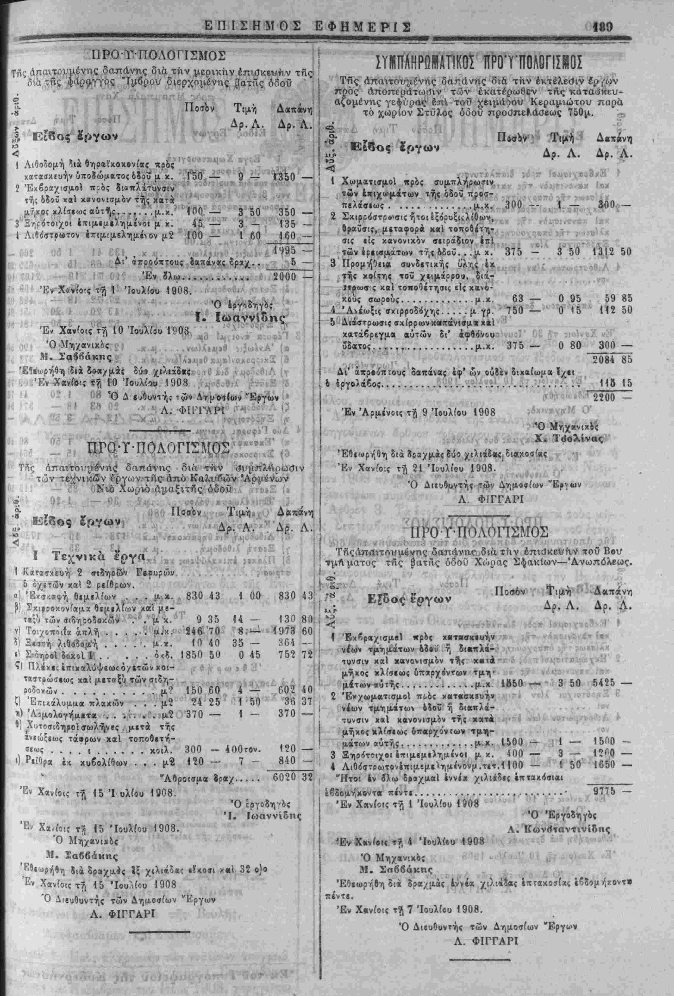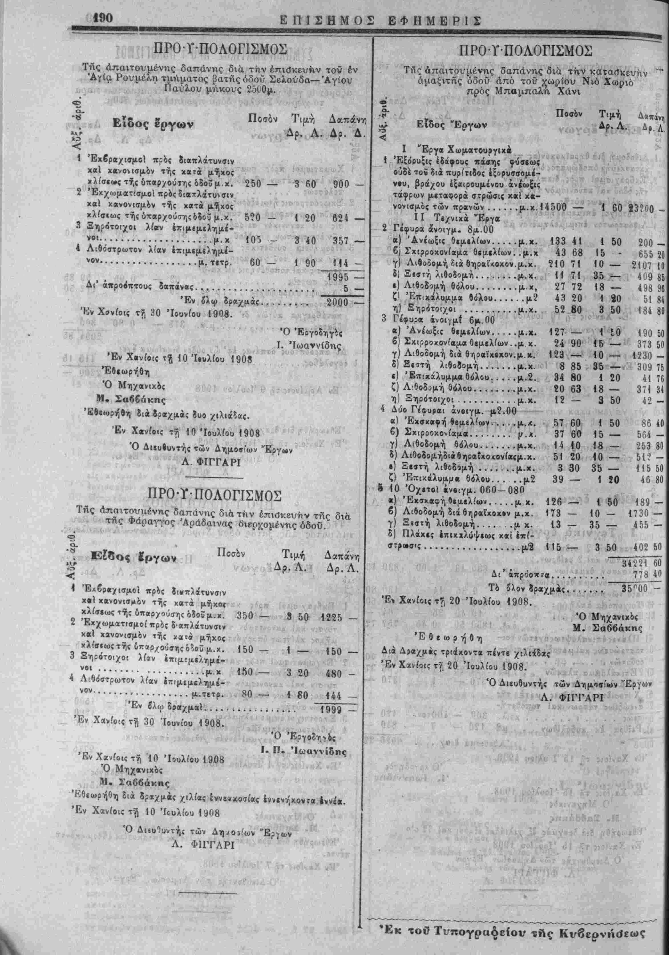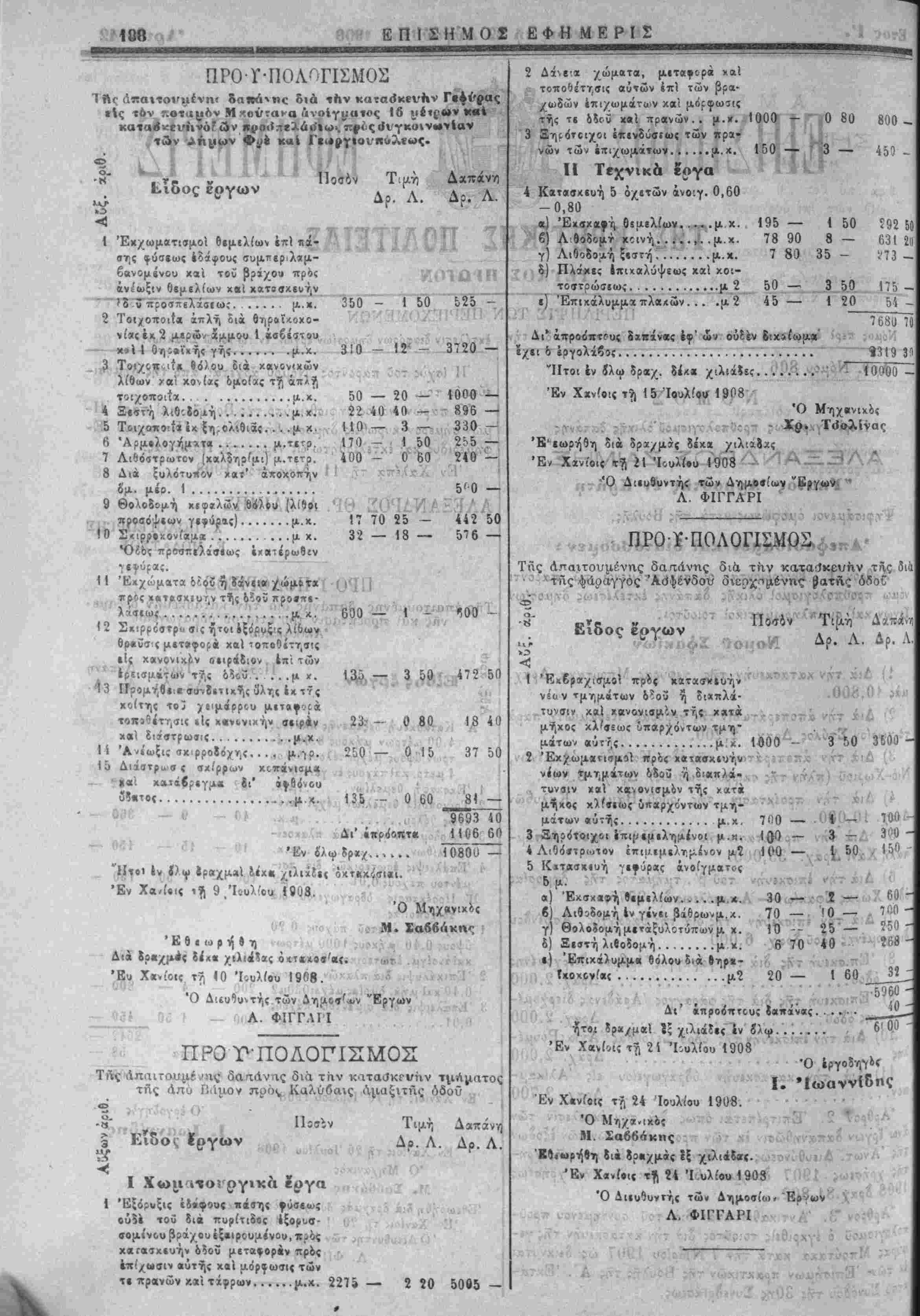νομώ προϋ7Γθλογι<τμοί όλικης δαπάνης ίκτιλίσιως δημοσίων ϊργων καί βυμττληρωματικοι τοιούτοι. Νοτίου Σφακίων ι) Διχ την κατασκίυήν της γιφύρας Μπούτακκ Δραχ. ώ« (0,800. 2) Διά την άποπεράτθιθ-ιν της γίφΰρας Κβραμιώτη «αρά τ4 χωρίον Στύλος Δραχ. 2,200. 3) Διά την αποπεράτωσιν της όδοΰ Καλυβών, Άρμίνων, ιό-Χωριοϋ (πλήν τής (τκιρροστρώσεως) Δραχ. 6.062. 4) Διά. την προΐκτασιν της όδοθ Βάμίυ Καλυβών V*· 10,000. 5) Διά την προέκταοΊν τηί όδοΰ Νιό-ΧωριβΟ Μι»αμ- κχλή Χάνι Δραχ. 35,000. 6) Δια την ΐπισκευην τοΰ β'. τμ<ίμ*τος τί!ς δημοσίας όοοθ Χώρας Σφακίων—Άνωπόλίως δρ. 9775. 7) Δια την επισκευήν της διά της φάραγγος Άβ-φένδου «'ίρχομενγς όδοΰ δραχ. 6,000 ο) Έπ;σκιυή της διά της φάραγγος "Ιμβρου διερχομ^νης όδοϋ........................ Δραχ."2.000 ") Επισκ,ευή της δια της φάραγγος Άράδινας διεεχομί- 'ΐς όδοϋ..................... Δραχ. 2.000 'Ο) Δια την επισκευήν της όδοϋ Σίλούδας Άγί*;Ρουμ6- Ή Ισγύς τοΰ παρόντος Νόμου άρχεται άπο τη"ς οημοσι- εώς τού. Ό παρών νόμος ψηφισθείς υπό της Βουλης καί παρ' Η¬ μών σημερον κυρωθείς δημοοΊΐυθήτω διά της Επισήμου Έ- φημερίδυς καί έκτίλίΐθήτω ώς νόμος της Πολιτειας. Έν Χαλεπα τη 11 Αύγουστον 1908 ΑΛΕΞΑΝΔΡΟΝ ΘΡ. Α. ΖΑΪΜΗΣ Χ. ΠΩΛΟΓΕΩΡΓΗΣ Ε. ΜΟΔΑΤΣΟΣ ΠΡΟ-Γ-ΠΟΛΟΓΙΣΟΣ Τίϊς απαιτουμένης δαπάνης διά την ·κατα(}κευην δεξαμβ· νης κα/ι προέκτασχν τού κτιστοϋ ύδραγωγεΐου Άλικάμπου Έίδος έργων Ποσόν Τιμή Δρ. Λ. Δαπάνη Δρ. Λ. Α' Κατασχιοή διξαμινής πλάτιυ; 4.00 μετρων μήχους 8.00 μί- τρων ίίψους μίχρι τελους Θ6λου 4 μετρ. χαΐπάχους έν γίνειθ.80 1 Έχσκβφή θεμελ(α>ν.....μ.κ.