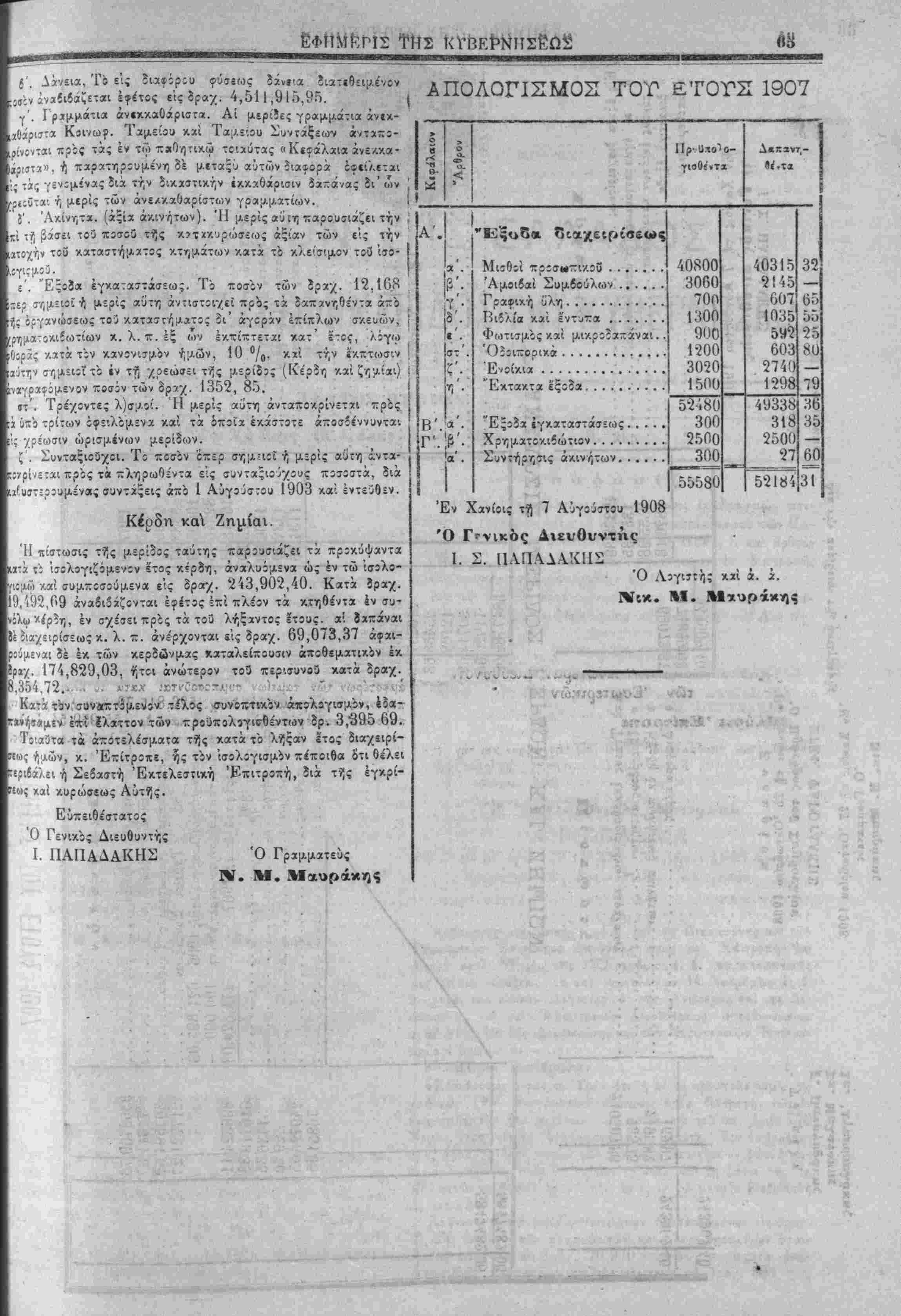 (ί συμποσούμενα εις $ρ<χ'/,· '243,902,40. Κατά !ραχ. 19,49*2,09 άναβιβίζονται εφέτος επί πλέον τα κτηθέντα έν συ- «ίλω^έρΐη, έν σχέσει πρός τα τού λήξαντος ϊτους. αί δαπάναι 9έ διαχειρίσεως κ. λ. π. άνί'ρχονται είς 8ραχ. 69,073,37 άφαι- ρμναι δέ έκ των κερδώνμας καταλείπουσιν άττοθεματικόν έκ ίραχ. 174,829,03, ήτοι ανώτερον τοθ περισυνοϋ κατά δραχ. 8,354,72.- . .- >.5ϊχ .'κτΐ'ίοίΓ^ι··" ' -■·':■·'<.»' Κατά Λν'σιίνϊίπτΊμίνΌ'νί τό,βς «αιινίΐίτικβν άπολογισμϊν, εϊ«- χνήυ,μιν. έ·πί ϊλαττον των -ρούπολογιο-θέντων δρ. 3,"395 69. Τ:αθτα τα άκοτελέσματα τής κατά τό λήξαν Ιτος διαχίΐρί- «ως ημών, κ. Έπίτροπε, ής τίν ισολογισμόν πέποιθα ό'τι θέλει :ιριίά/ει ή Σεδαστή Έκτελεστική Έπιτροπή, διά τής έγκρί- «ος χοιί χυρώσεως Αυτής. Εύπειθέστατος Ο Γενιχός Διευθυντάς Ι. ΠΑΠΑΔΑΚΗΣ Ό Γραμματεύς Ν. Μ. Μαυράκης ΑΠΟΛΟΓΙ2ΜΟ2 ΤΟΓ ΕΤΟΓΣ 1907 ο α ο β- α. Α'.Ι Β'.α γ,*; διαχειρίσεως Μιοθοί πρ;σ**τ:ι·/.οΰ....... Άμοιίαί Συμδούλων....., Γραφιχή ϋλη........... 1>ιίλίβ καί εντυπα......