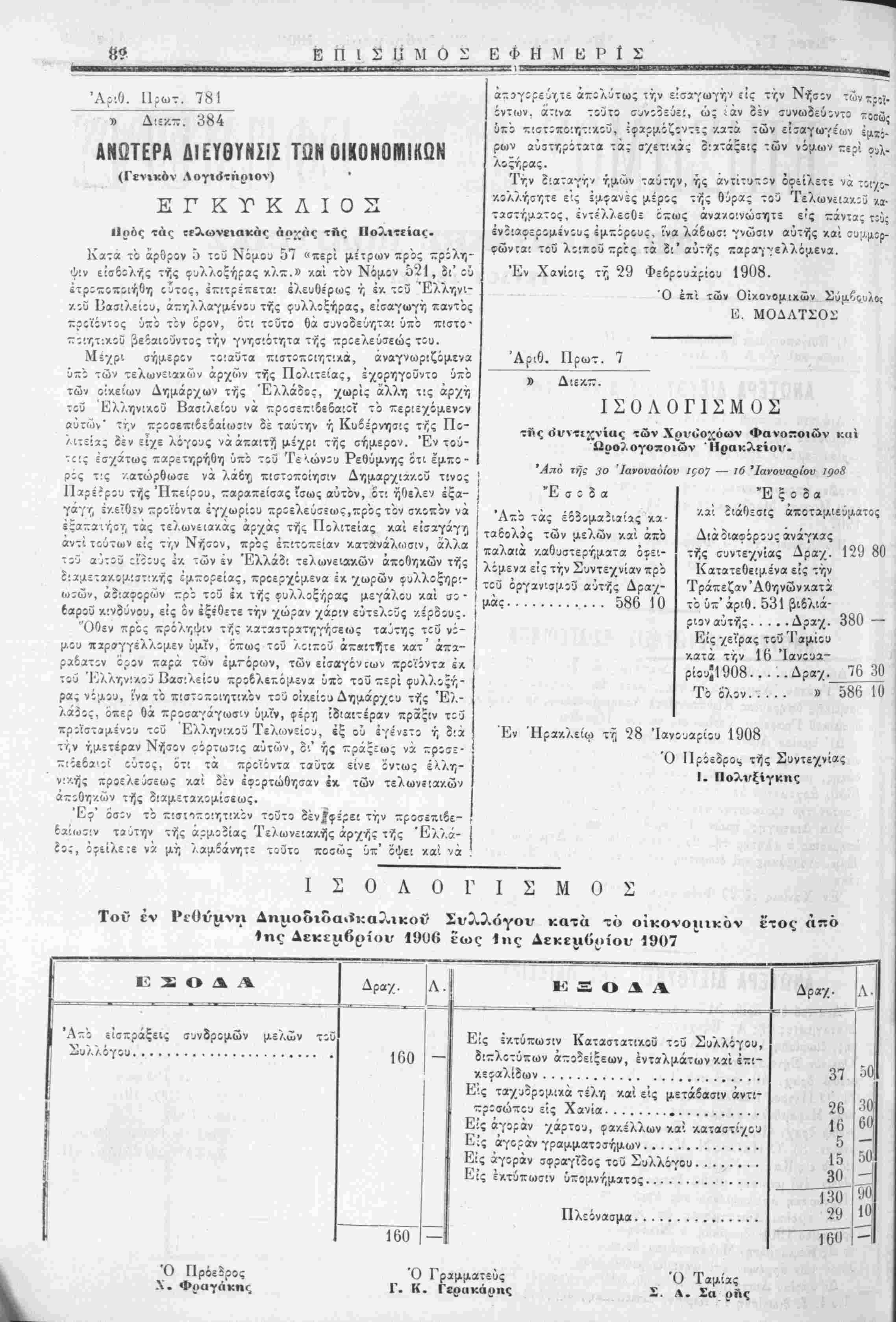 Τοϋ έν Ριθύμνη Δηποοιοα»ίι:αλικοίί Σνλλόγον κατά τ«ί οικονομικόν ετος· ατ.Ό