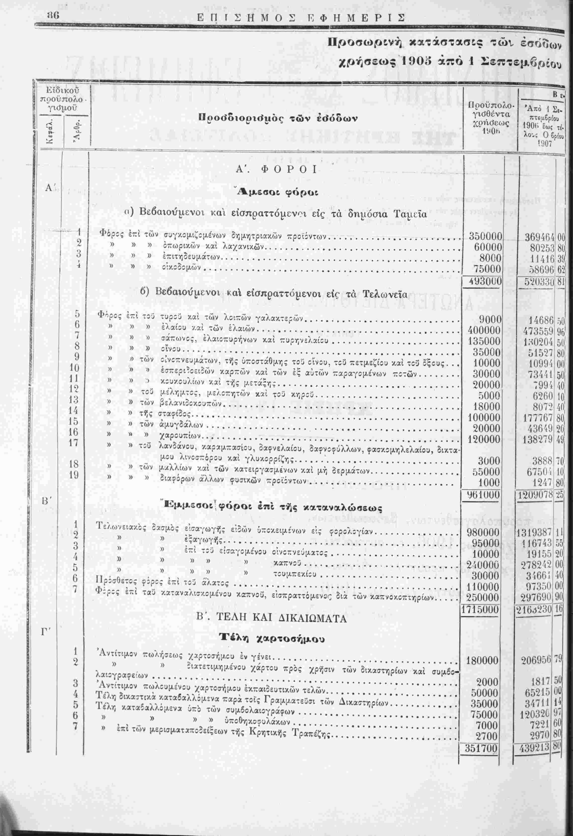 Προσωρινή κατάστασις των προϋπολογισθέντος, βίβαιωθέντων, είσπραχθέντων χά! ε'ισπραξίμων έσοδων τής χρήσεως 1906,
