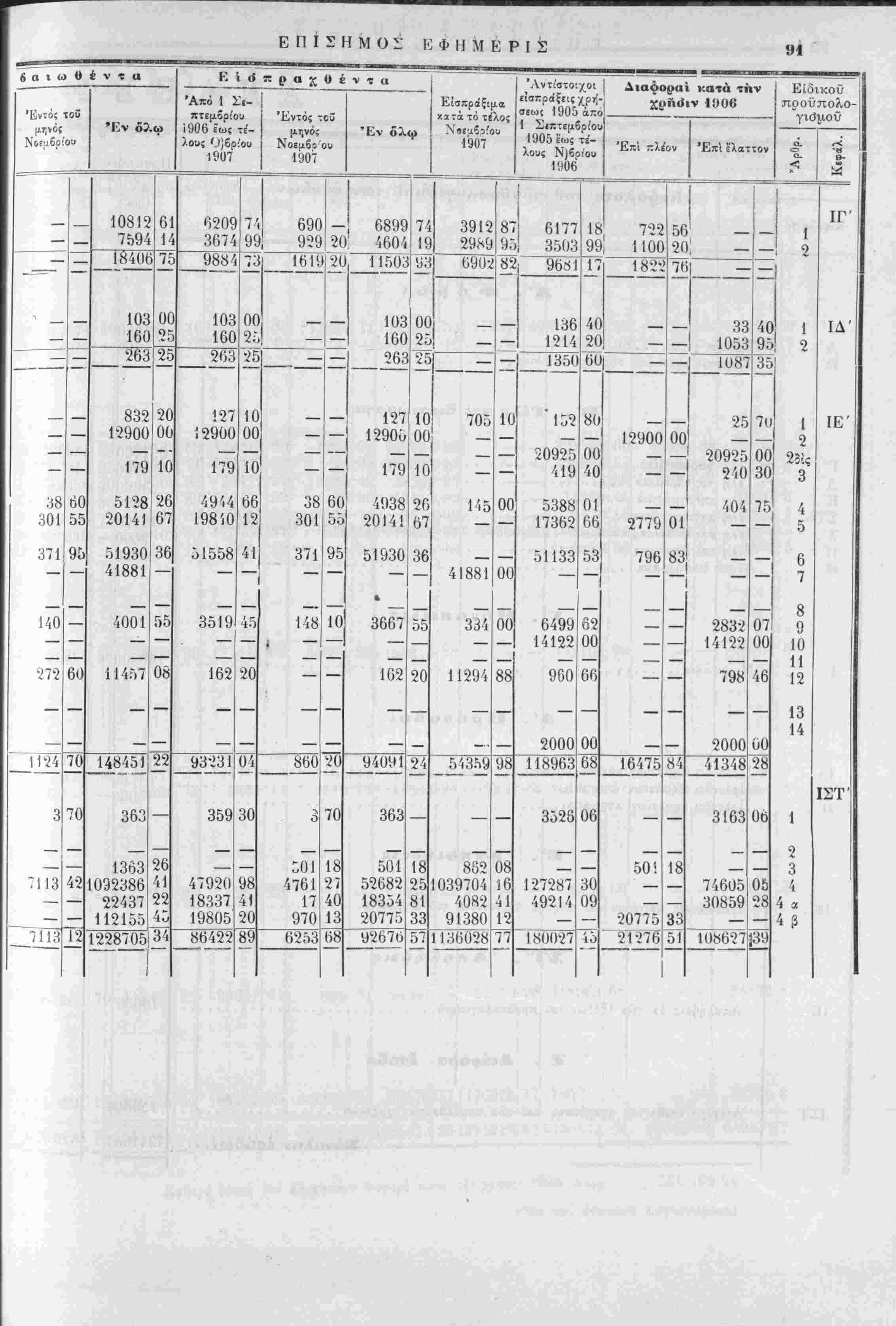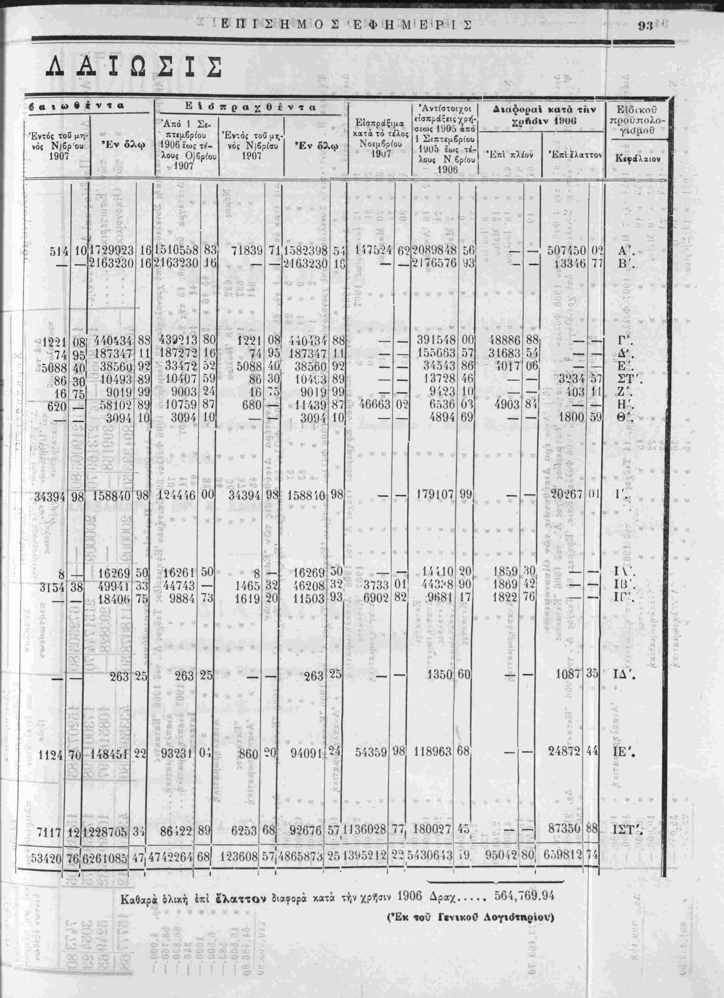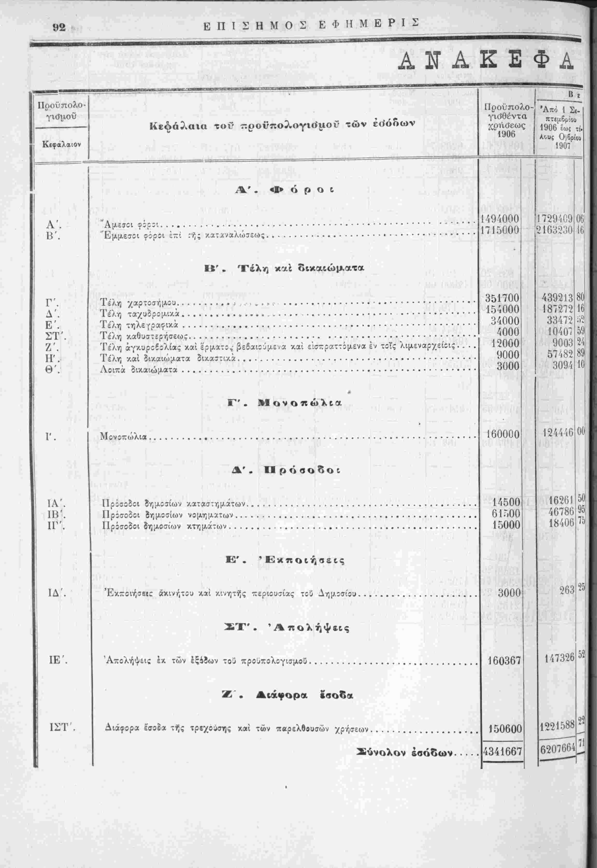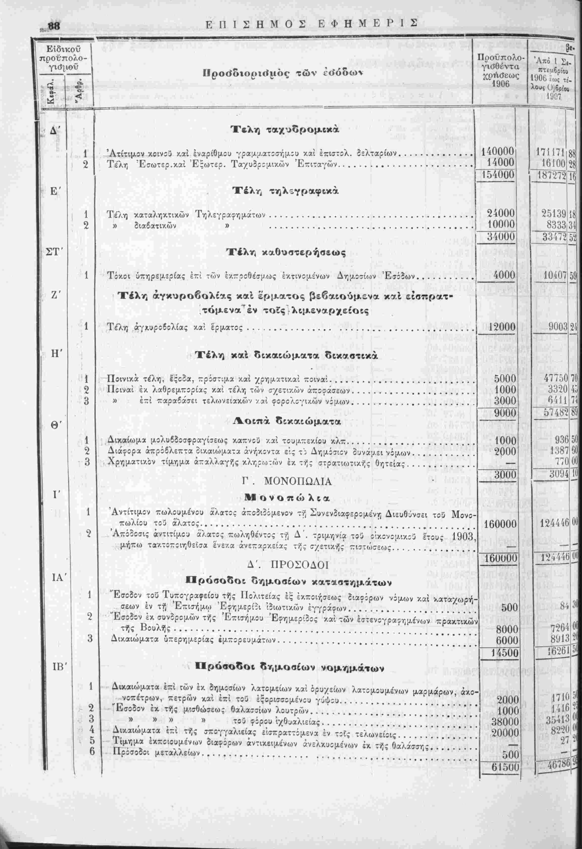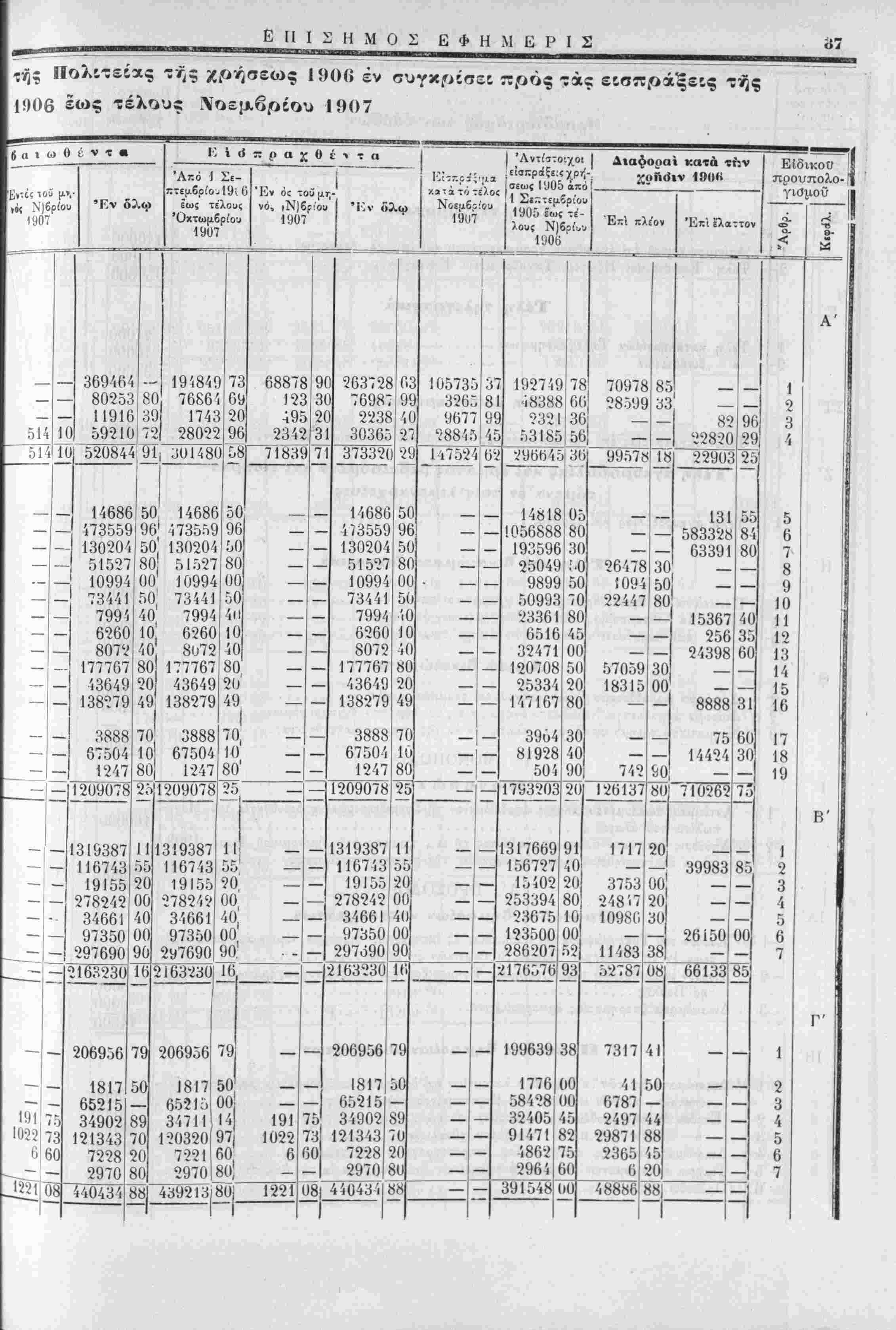 τής χρήσεως 1906, έν συγκρίσει πρός τάς είσπράξεις τής χρήσεως 1905