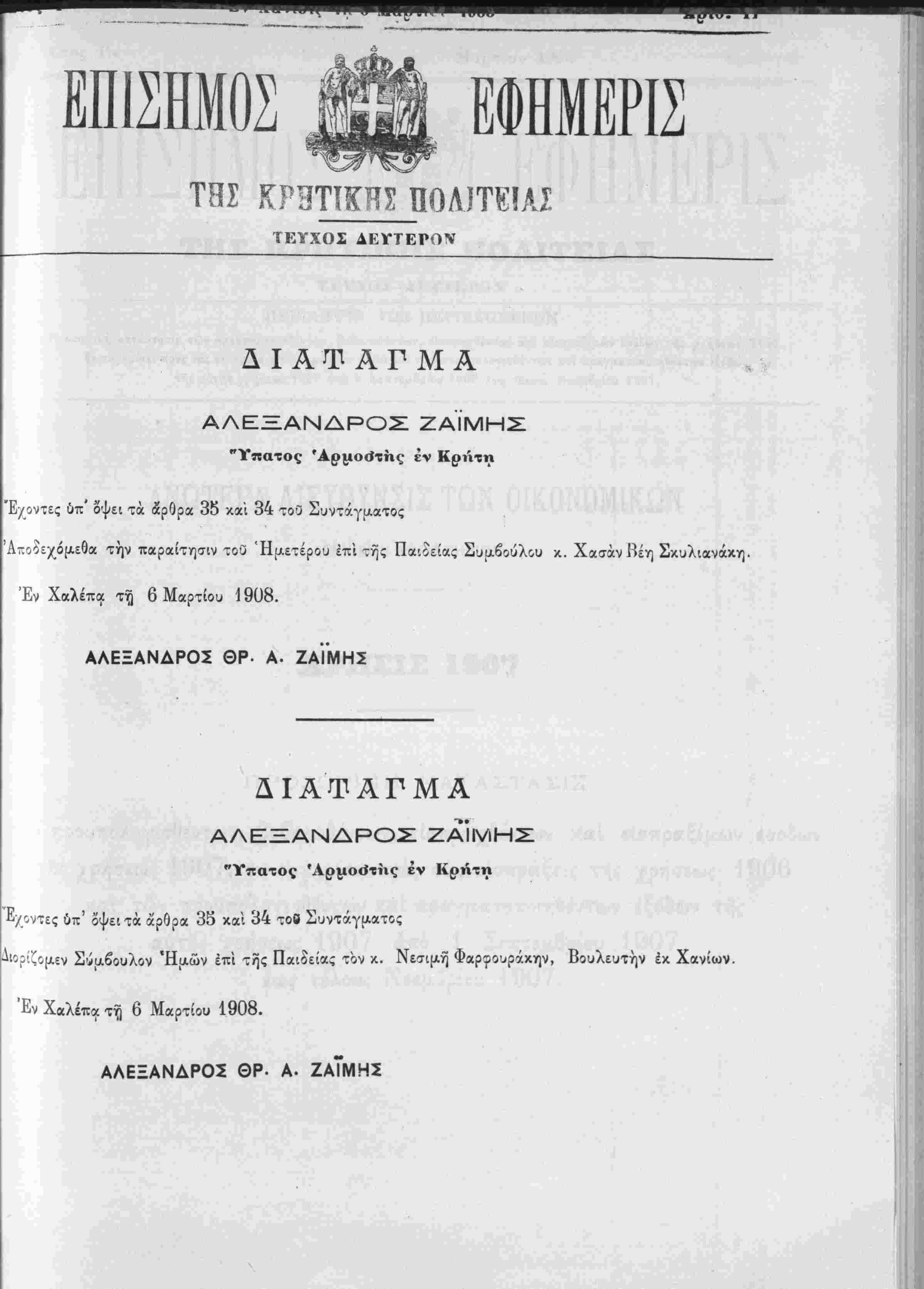 Αιορίζομεν Σύμ,βουλον Ημών επί της Παιδείας τον κ. Νεσιμή Φαρρουράκην, Βουλευτήν έκ Χανίων.