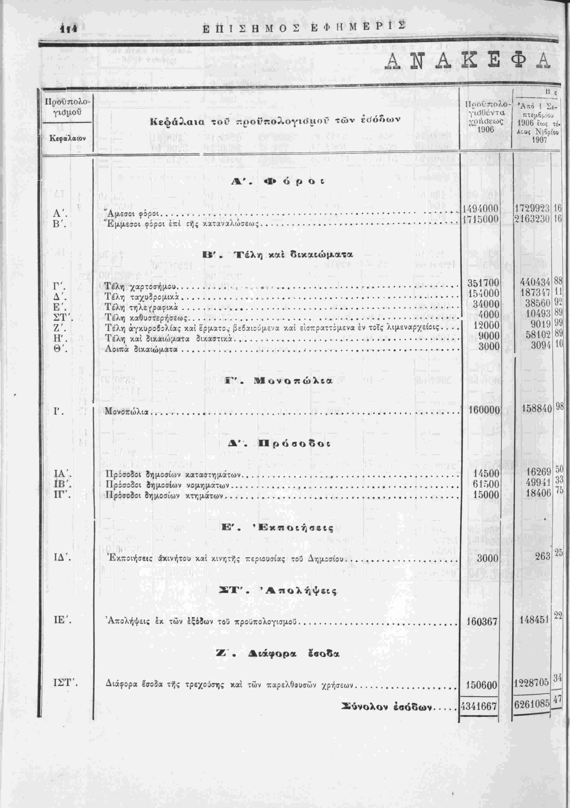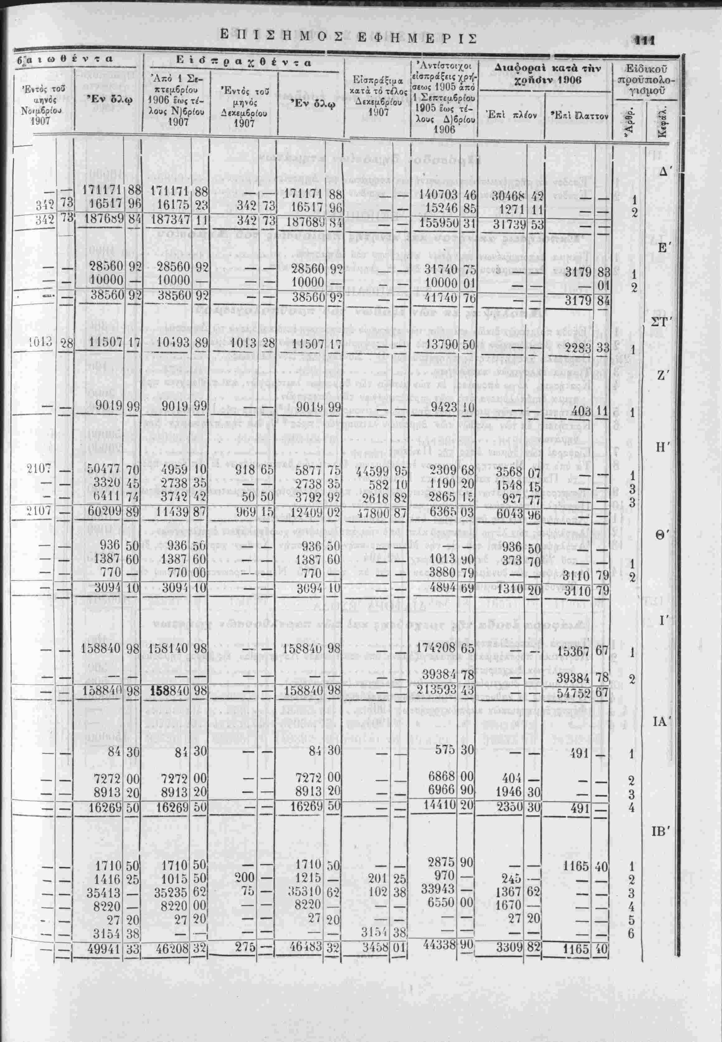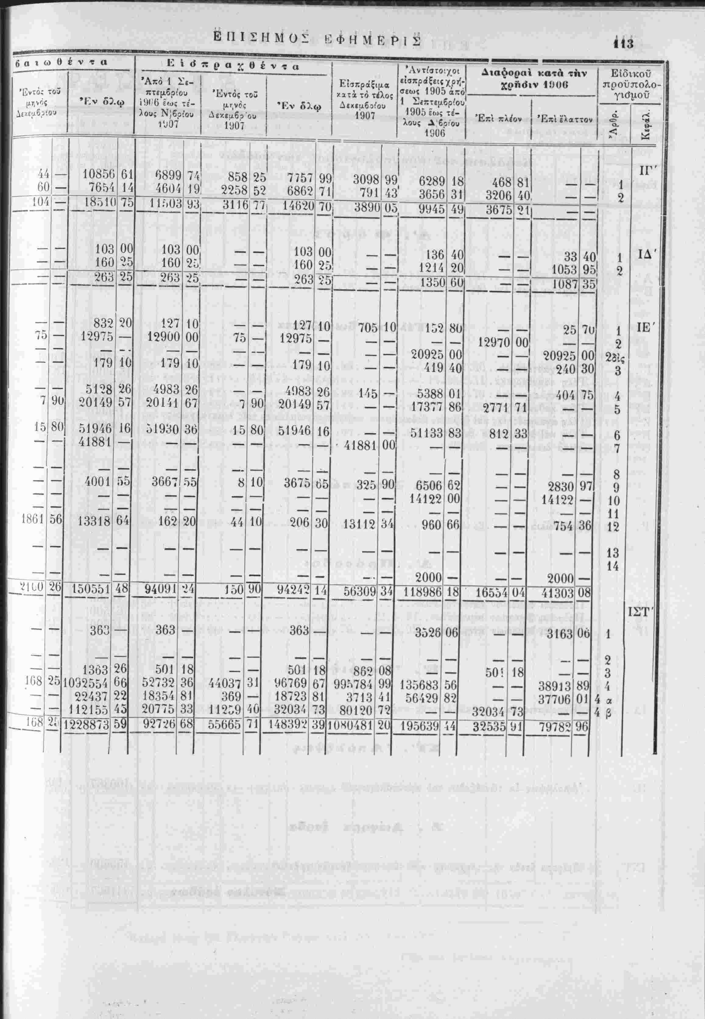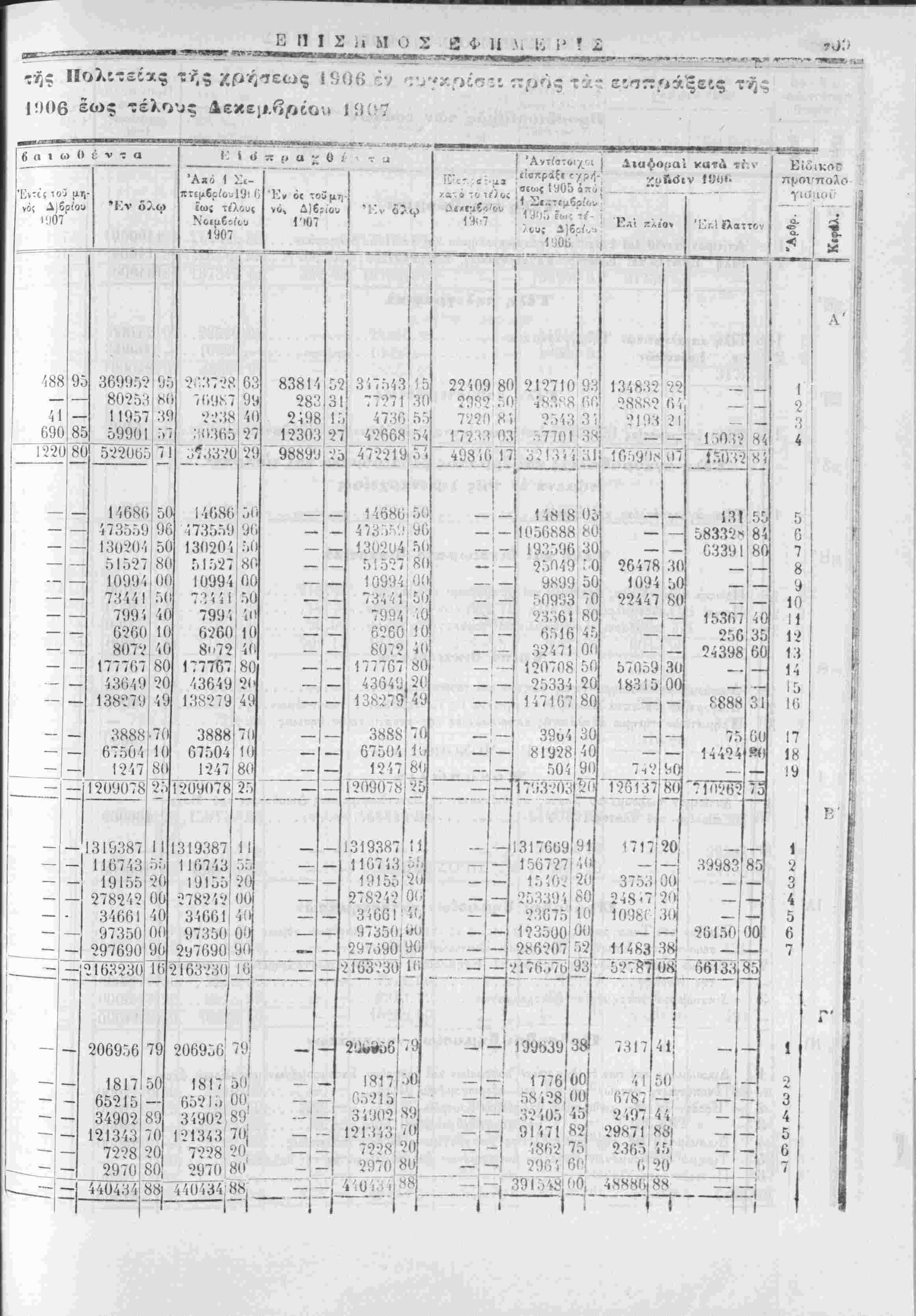 έν συγκρίσει πρός τά{ εΐσπράξεις τής χρήσεως 1905 χαί των προύπολογισθέντων καϊ πραγματοποιηθίντων έ;<ίδων τής αυτής χρήσεως 1906 άπό 1 Σεπτεμβρίου 1906 εως τέλους Δεκεμβριού 1907. ΑΝΩΤΕΡΑ ΔΙΕΥΘΥΝΣΙΣ ΤΩΝ ΟΙΚΟΝΟΜΙΚΌΝ ΓΕΝΙΚΟΝ ΛΟΓΙ2ΤΗΡΙΟΝ ΧΡΗΣΙΣ 1906 ΠΡΟΣΩΡΙΝΗ ΚΑΤΑΣΤΑΣΙΣ ν προϋπολογισθέντων, βεβαιωθέντων, εισπραχθέντων και είσπραξίμων έσόΒων τής χρήσεως 1906, έν συγκρίσει πρός τάς είσπράξεις τής χρήσεως 1905 καί των προϋπολογι τθε'ντων καί πραγματοποΐηθε'ντων έξόδων τής αυτής χρήσεως 1906 άπο 1 Σεπτεμβρίου 1906 εως τελους Δεκεμβριού 1906.