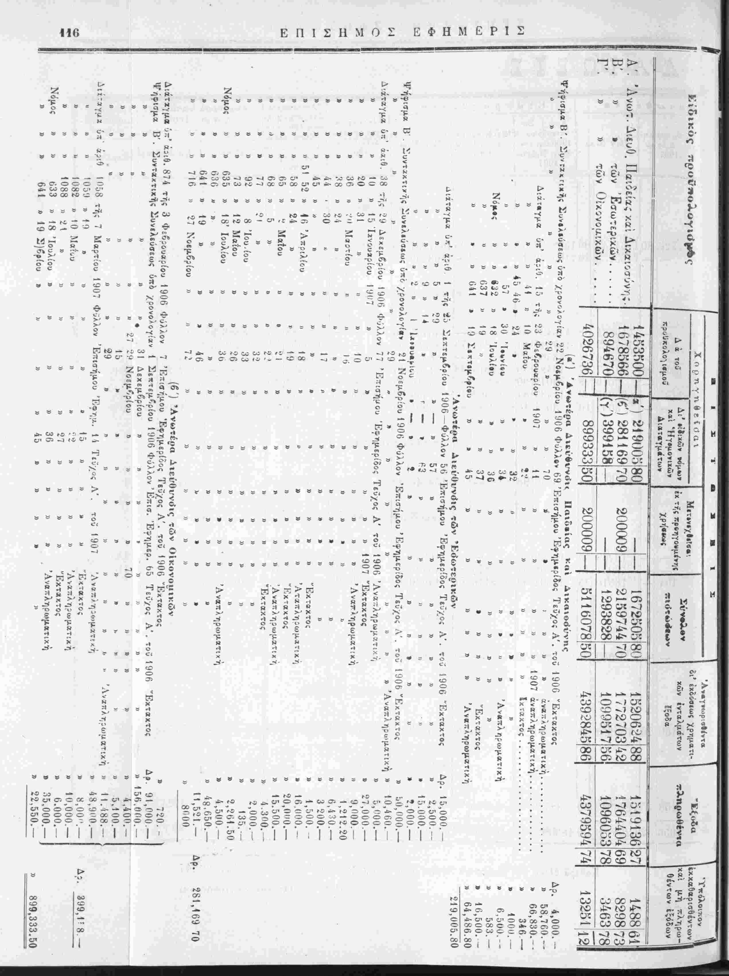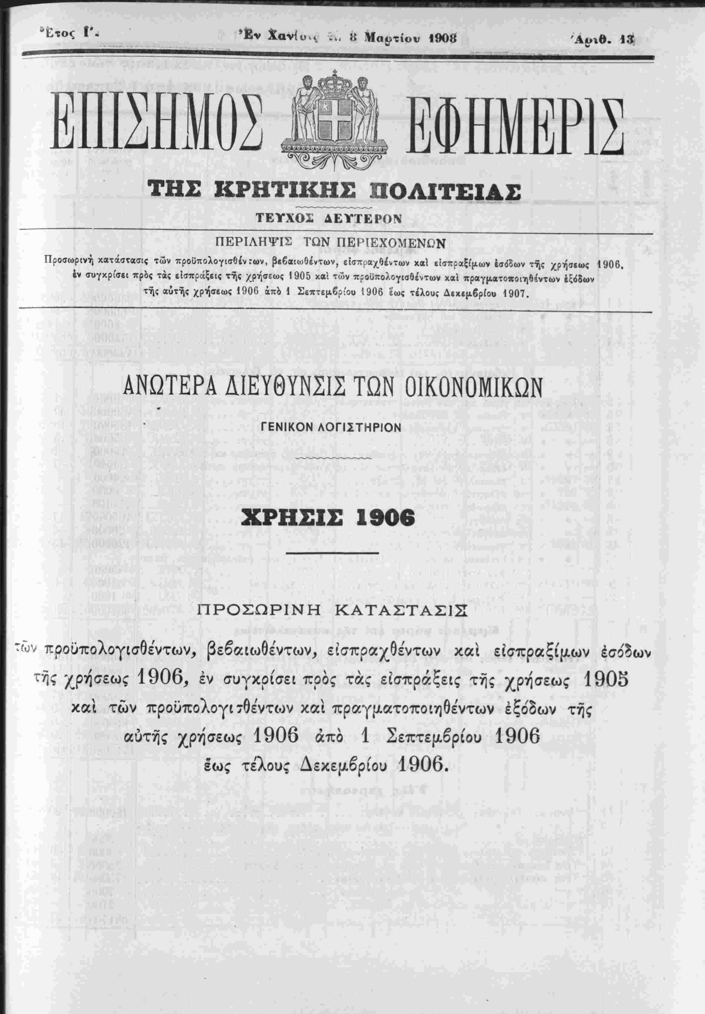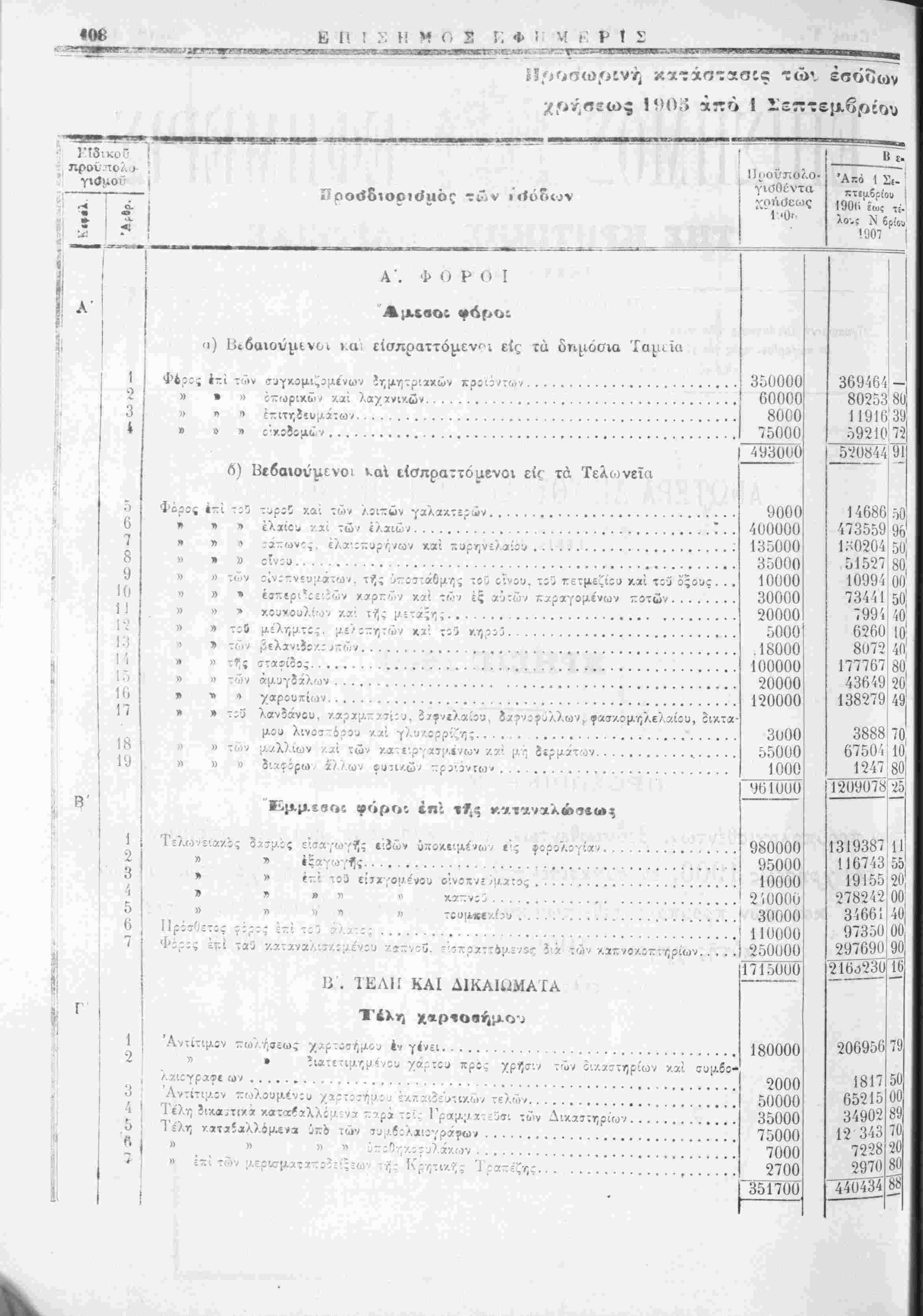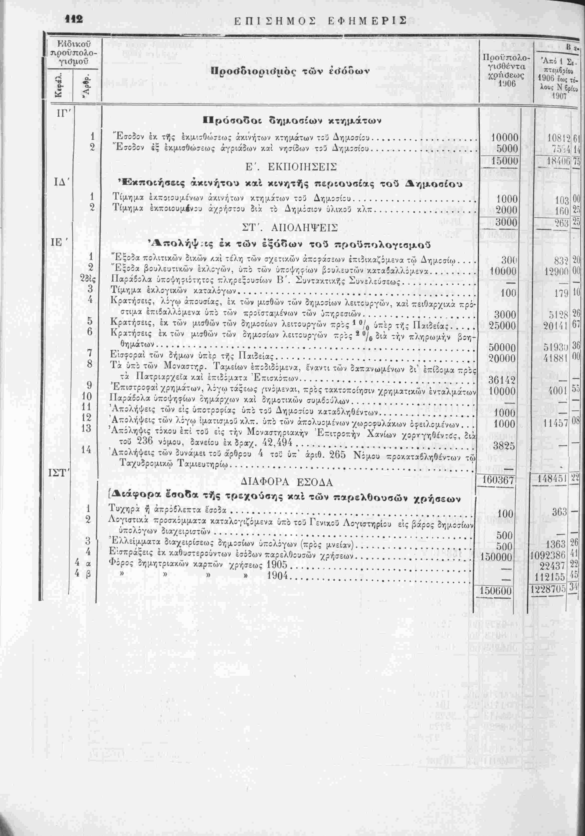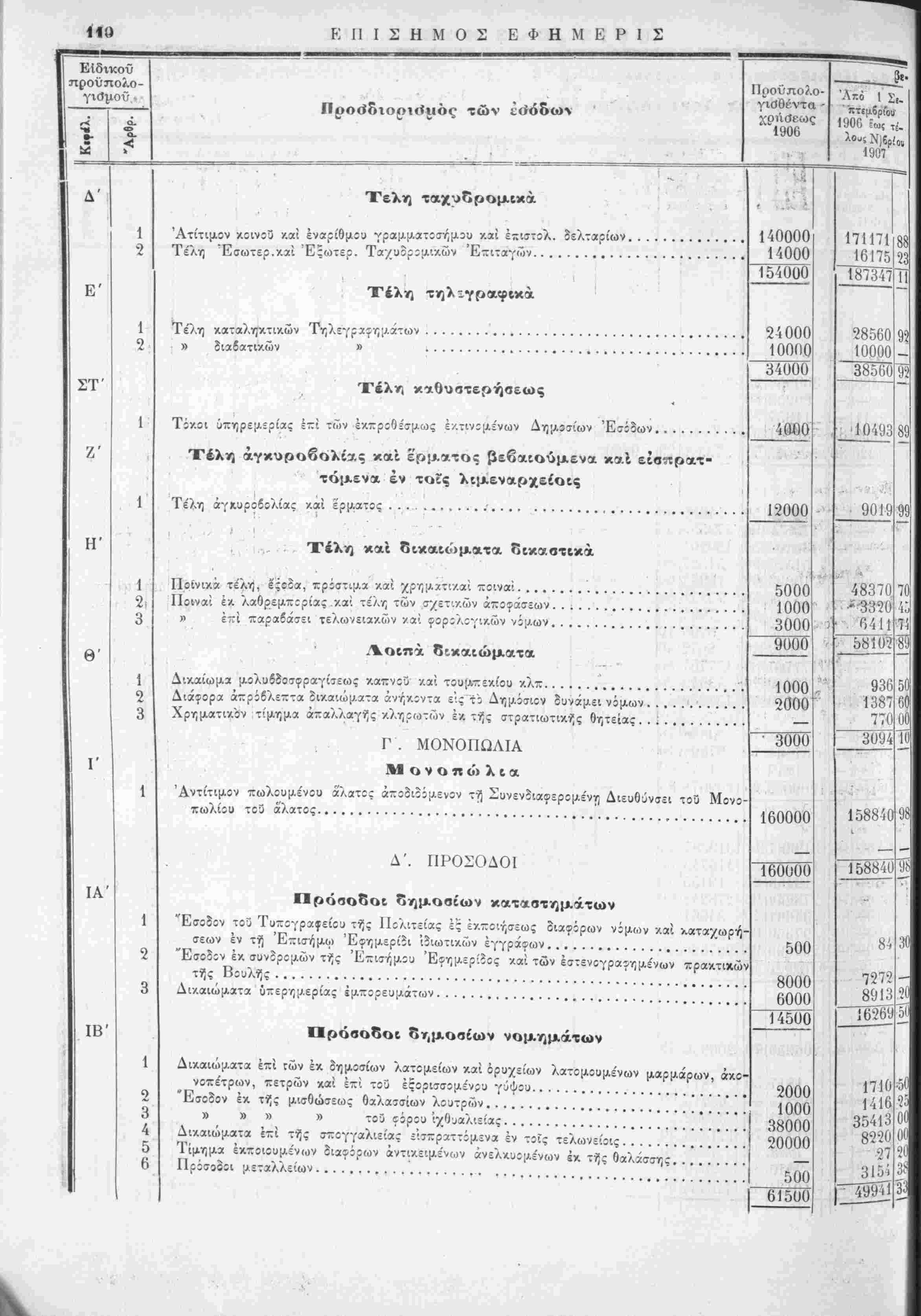 έν συγκρίσει πρός τά{ εΐσπράξεις τής χρήσεως 1905 χαί των προύπολογισθέντων καϊ πραγματοποιηθίντων έ;<ίδων τής αυτής χρήσεως 1906 άπό 1 Σεπτεμβρίου 1906 εως τέλους Δεκεμβριού 1907. ΑΝΩΤΕΡΑ ΔΙΕΥΘΥΝΣΙΣ ΤΩΝ ΟΙΚΟΝΟΜΙΚΌΝ ΓΕΝΙΚΟΝ ΛΟΓΙ2ΤΗΡΙΟΝ ΧΡΗΣΙΣ 1906 ΠΡΟΣΩΡΙΝΗ ΚΑΤΑΣΤΑΣΙΣ ν προϋπολογισθέντων, βεβαιωθέντων, εισπραχθέντων και είσπραξίμων έσόΒων τής χρήσεως 1906, έν συγκρίσει πρός τάς είσπράξεις τής χρήσεως 1905 καί των προϋπολογι τθε'ντων καί πραγματοποΐηθε'ντων έξόδων τής αυτής χρήσεως 1906 άπο 1 Σεπτεμβρίου 1906 εως τελους Δεκεμβριού 1906.