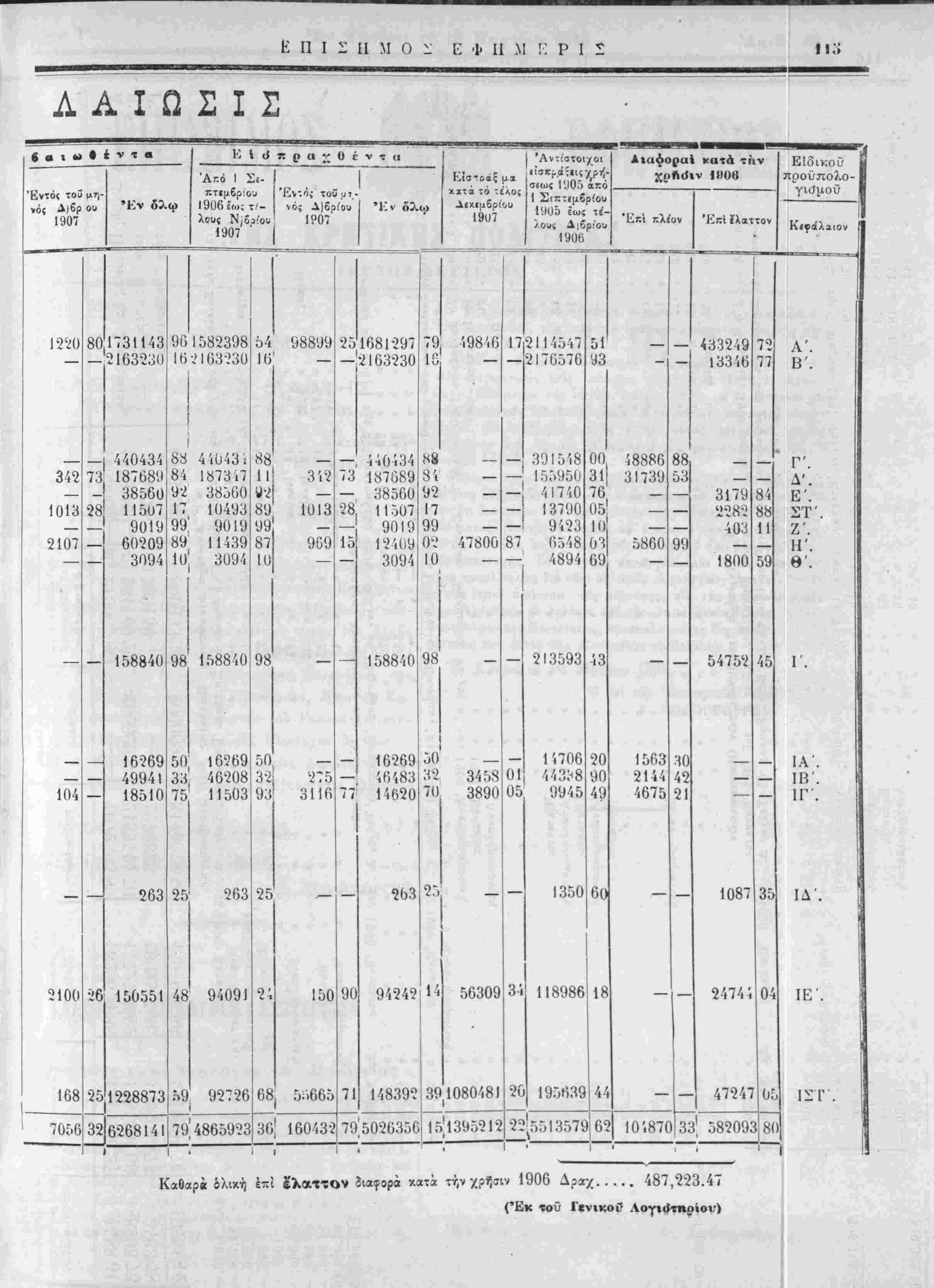 1905 Ιως ΐ<-| ρ 1906 Λιαψοραι κατά την 1»0β Επι κλίον 'ΚπΙ ϊλαττον ΕΙδιε.οΟ προυπολο¬ γισμόν Ι2'20 342 1013 2107 104 2100 168 7056! 801731143 — 21632^0 —ι 440434 73 187089 - 38560 28 11507 9019 60209 3094 158840 16269 49941 18510 263 150551 251228873 32 6268141 96 1582398 16 2163-230 83 84 92 17 99' 89 ιο' 4Ί043ι 1873 ι7 38560 10493 9019 11439 3094 98 158840 16269 46208 11503 25' 263 48 94091 59 92726 ι 79 4865923 54 98899 Ιο' - 88" 11; 342 8ϋ' 99! 87 ιο! 50 3-2, 931 25' 24 1013 969 98 - 275 3116 150 68, 5·»66ο 36 16Ο43-; 25Ί68Ι297 —!·2163230 —, 440434 73 187689 — 38560 28 11507 —1 9019 9, Ί9846 84 - 92 - Π - 99 — 1ο 12.09 02 3094 10 158840 - 16269 — 46483 77 14620 90 71 263 94242 98 50 32 71) 14 ι78ΟΟ 3458 3890 56309 148392!39 108048) 79'5Ο26356|1ρ 1395212 17 2Ι145'*7 2176576 87 391348 Ι55950 41740 13790 9423 6 Γ) 4 8 4894 213593 34 14706 443:^8 9945 1350 00 48886 31 31739 76 05 - 10 03 5860 69 118986 20 195639 18; 44 1563 2144 4675 433249 13346 531 99 10Ί870 3179 2282 1800 54752 1087 24744 — 47247 331 58209 45 Α' Β' Γ'. Δ'. Ε'. ΣΤ' Ζ'. Η'. θ'. Γ. ΙΑ' ΙΒ' ΙΓ' ΙΔ' ΙΕ' ΙΣΓ Καβαρβ όλική επί έλαττον διαφορά κατά την χρήσιν 1906 Δραχ..... 487,223.47 (Έκ τοϋ Γ«νι»;οί?