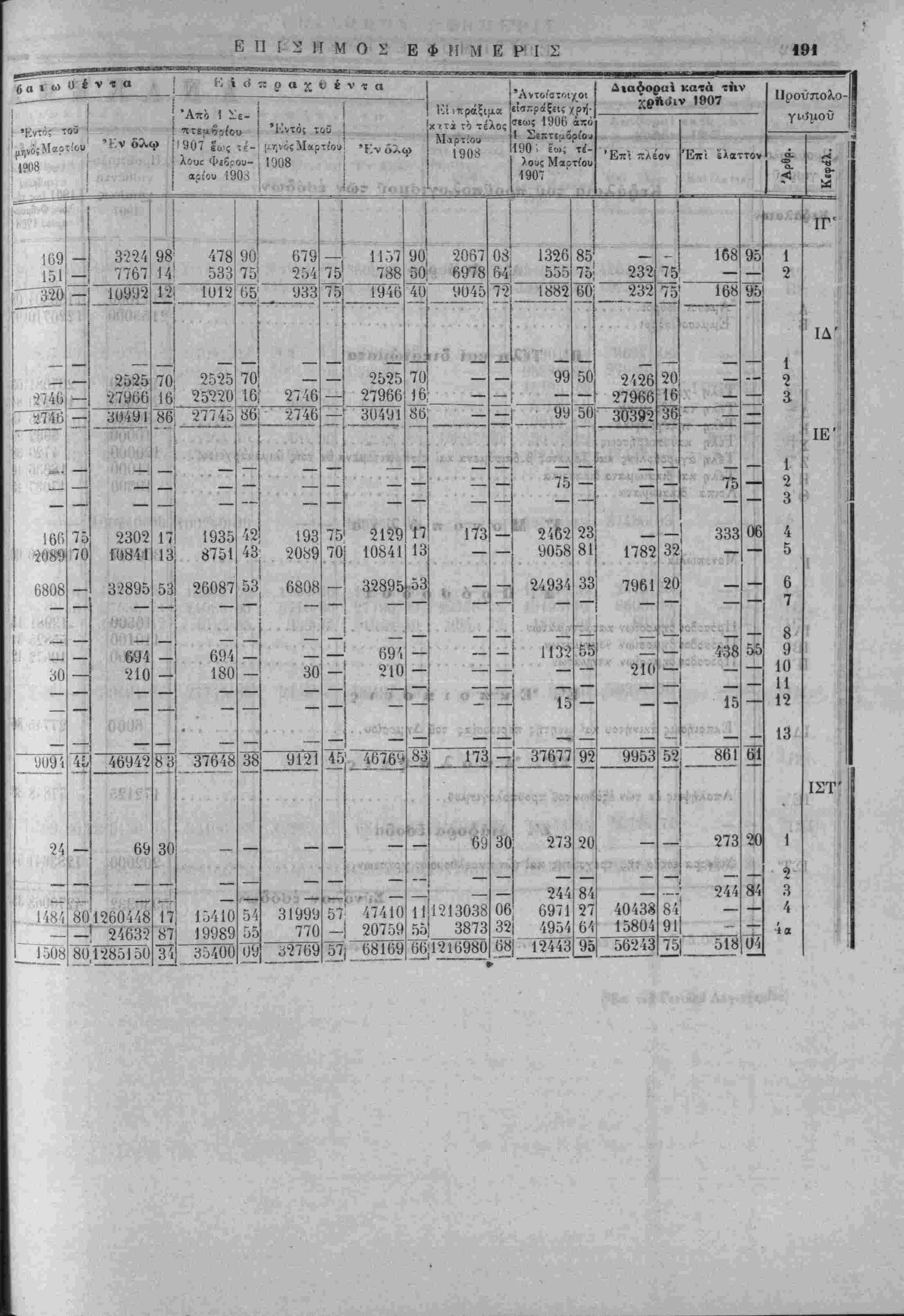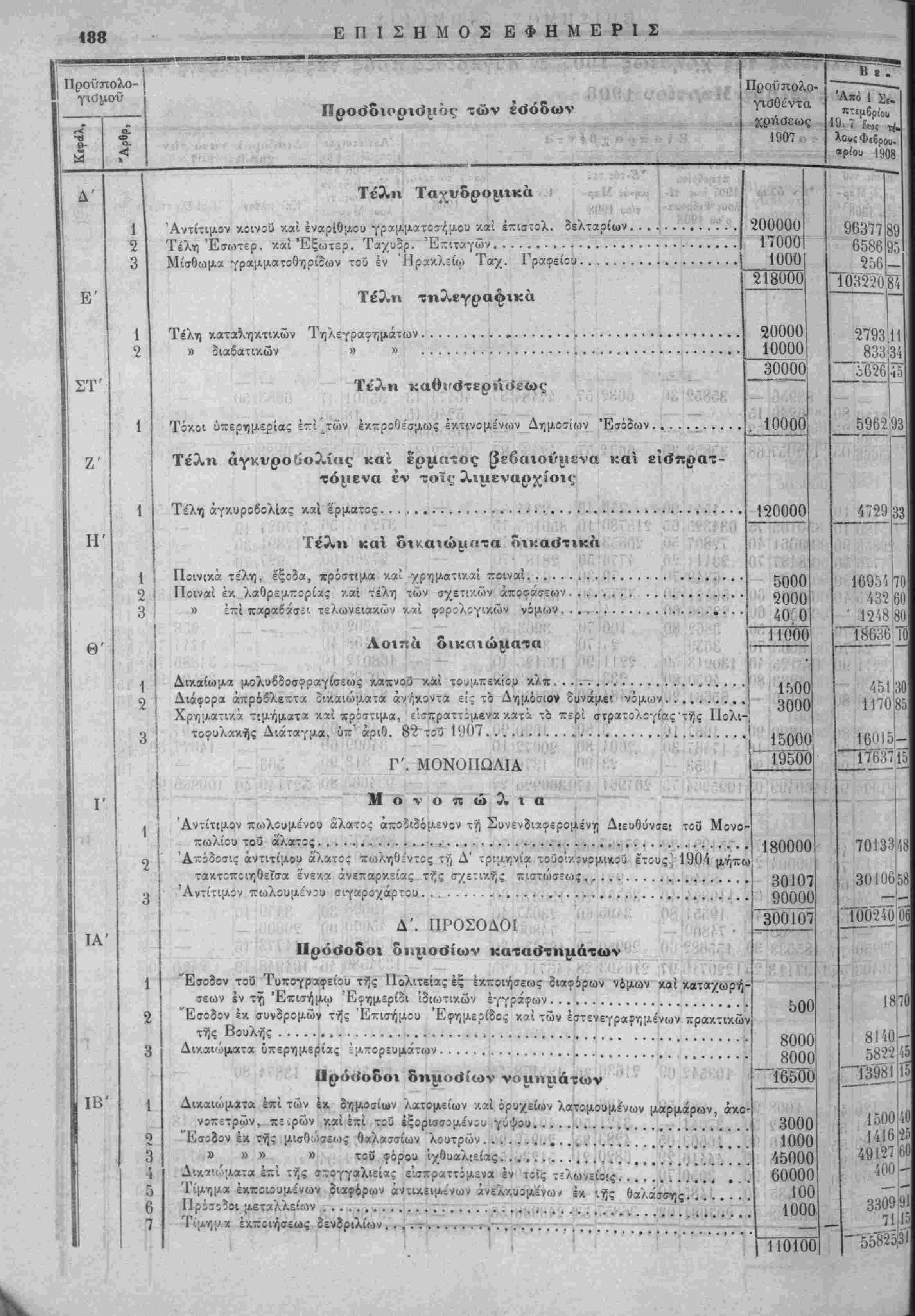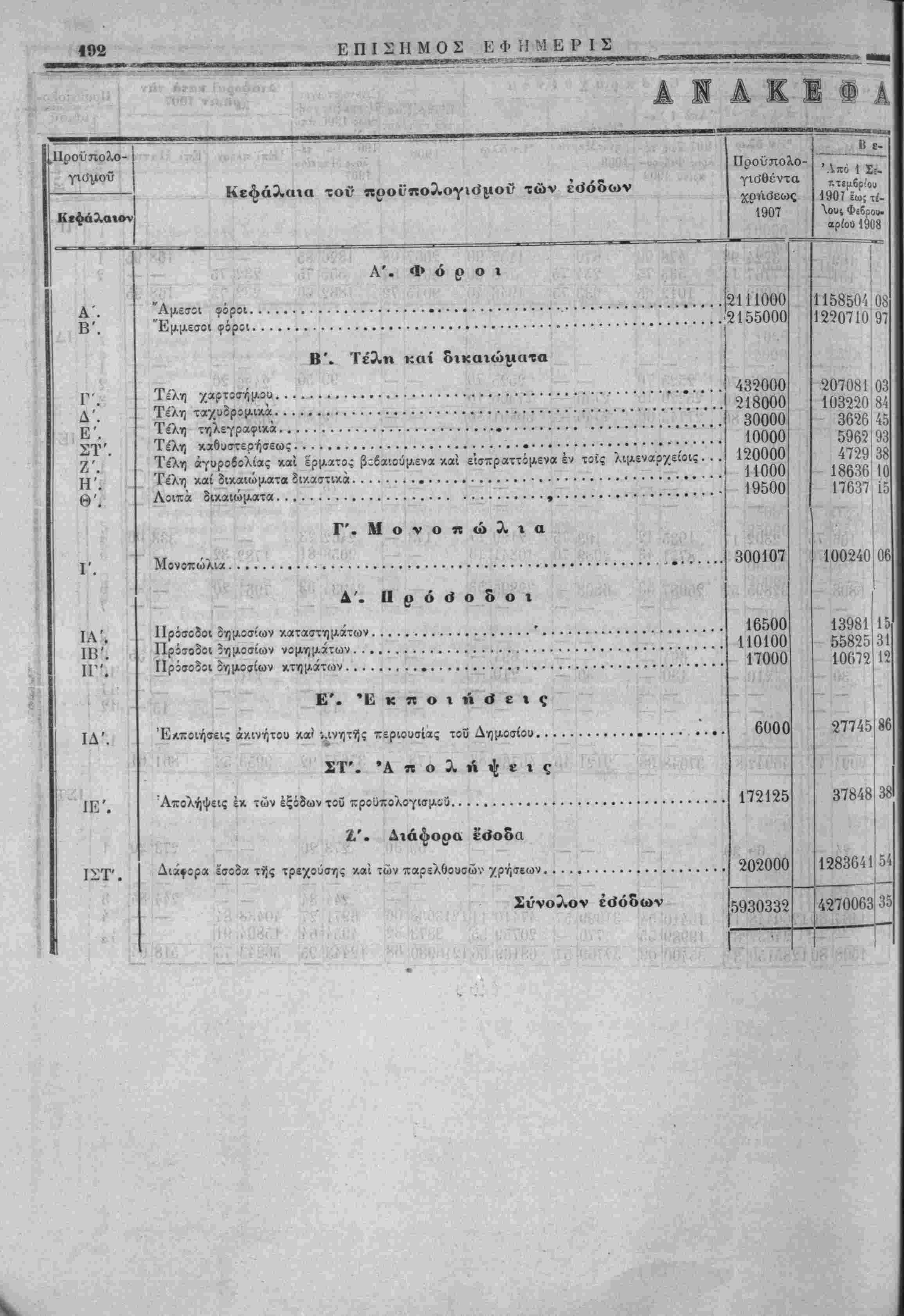 Προβωρινή κατάστασις των προϋπολογισθή των, ρΊβαιωδέντων, είσπραχθέ'ντων καΐ βίσπραξίμων έσόδων τϊ^ς χρήσεως 1907,