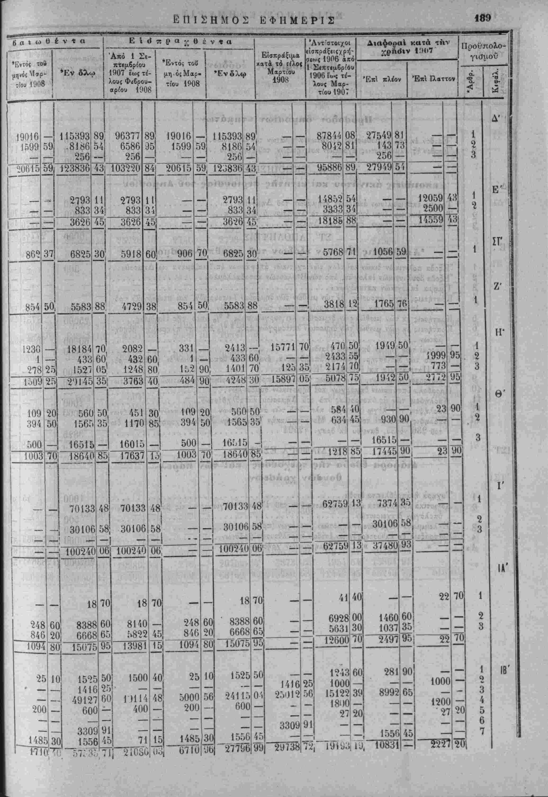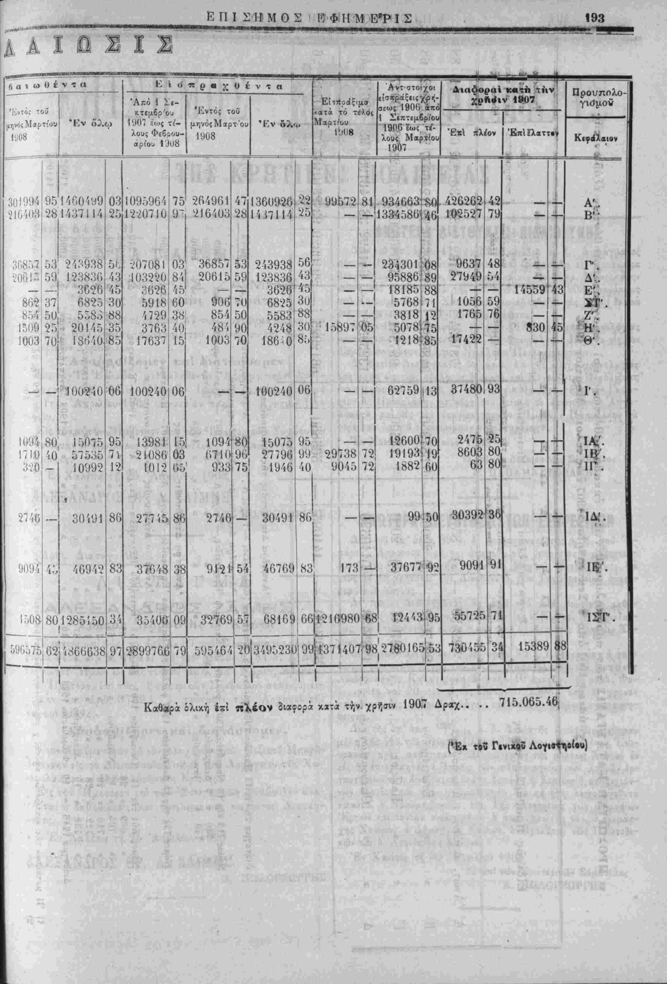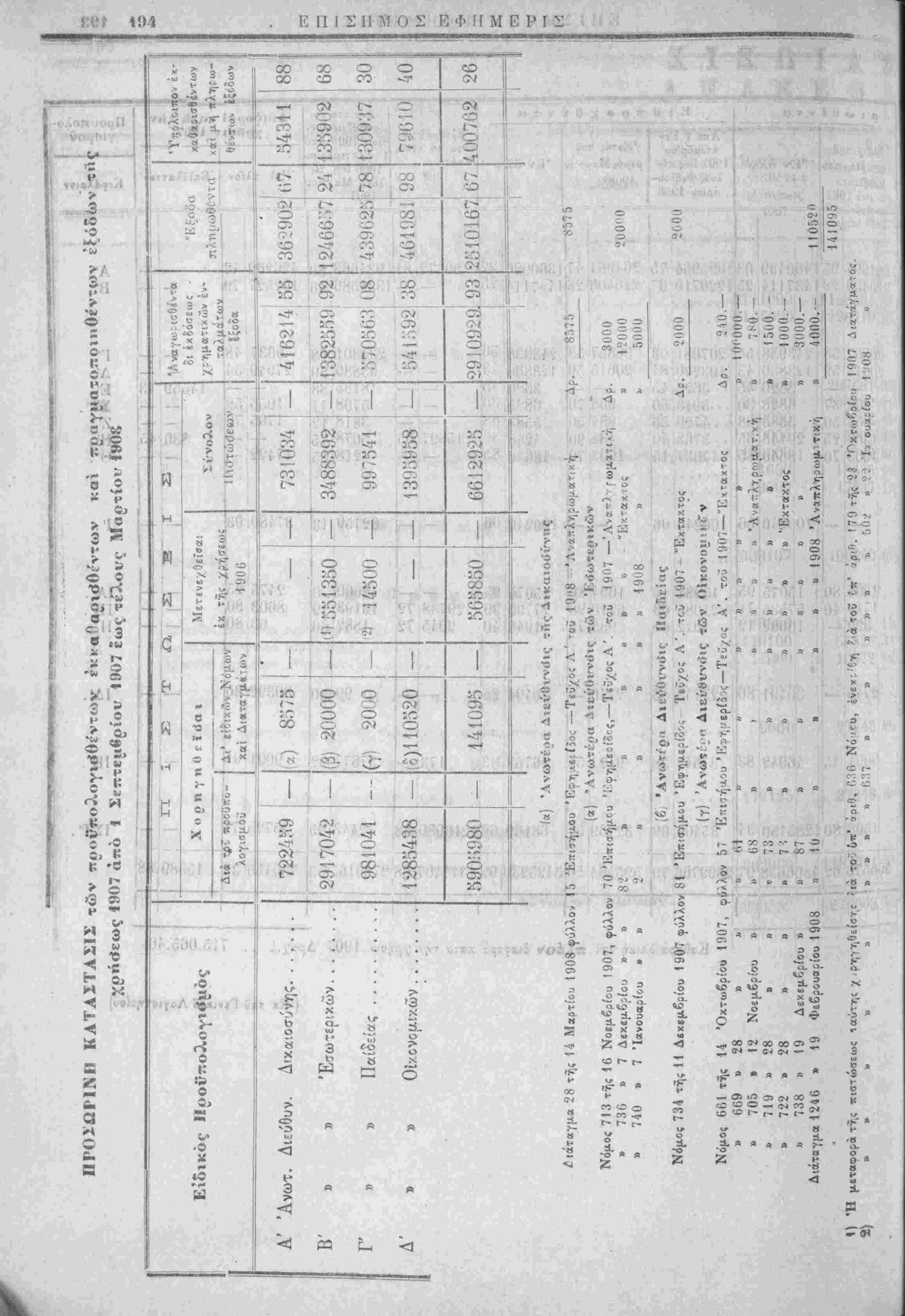 Κ ι <ί Ο ί ν τ α Άπό 1 1ί- τ.τεμ6ρ'ου 1907 εως τί- λους Φεδοου- αρίου Έντός τοΰ [χηνόςΜαρτ'ου 1908 Έν όλ<« ατά τό τελός Μαρΐ'Όυ Αντ στοιχοι »ροξ«ΐί χρή¬ σεως 1900 4» Ι ϋιπτεμβρίο 1900 εω< τί- λους Μαρτίοι 1907 κ«τη .την 1907 Ι Εχ πλεΌν 'ΕπΙ ϊλαττεγ Προνπολο γιΰμον ΚΐφάΧαιβν 3ι)ί')94 951400.99 ·2ΙΙ/ιΙ)3| 28 1437114 Γ.3 ?ί?938 59! 123830 —Ι 3026 6825 81)2137ί 854 50 1Γ.09 1003 10 25 70 20145 18640 100-ϊίΟ 80, 15075 ΊΟ 57535 ίνθ - 10992 40942 ·Ό8 801285150 06 86 83 34 1095964 12207)0 207081 103220 3626 5918 4729 3763 17637 100240 75 264961 9" 06 216403 36857 20615 906 854 484 1003 13981 15 21086 03 1012 ύο 27745 37648 3540(5 'ώΤο, 621Ί866638 97 289976.6 Ι 86 38 09 79 1095 671(1 933 2746 9121 32769 70 57 1360926 1437114 243938 123836 3626 6825 5583 4248 186 Ό 100240 15075 27796 1946 30491 46769 68169 99572 :15897 :ι 06 95 — Ι 29738 ) 9045 86 83 66 59546 Ι 20 349ο230|99 173 1216Κ)80 81 05 934663 1334586· 234301 95886 18185 5768 3818 5078 1218· 62759 ί371407 68 12600 19193 1882 80 46 08 89 88 71 12 75 85 13 99 50 37677 12443- •92 426262 102527 9637 27949 1056 1765 17422 37480 247'5 8603 63 30392 9091 14559 830 93 25 80 80 36 91 71 98 2780165,5; 35ιί 15389 43 Ιδ Α'. Β" Γ'. Δ'.. Ε-; ΪΤ' ν. τ. υ νΙΑ;'. ΙΒτ · ΙΓ. ΙΔί. ΊίΓ. » Καθαρά όλική ί-1 πϊ,έον διαοορα κατά την χρήσιν 1907 Δραχ.. .. 715.065.46; ._ ■ ,ι" "κ5§ί.: Α (*ΪΒκ τΐιϊ Γενιιιβί Αογι«τι>ο(·υ)