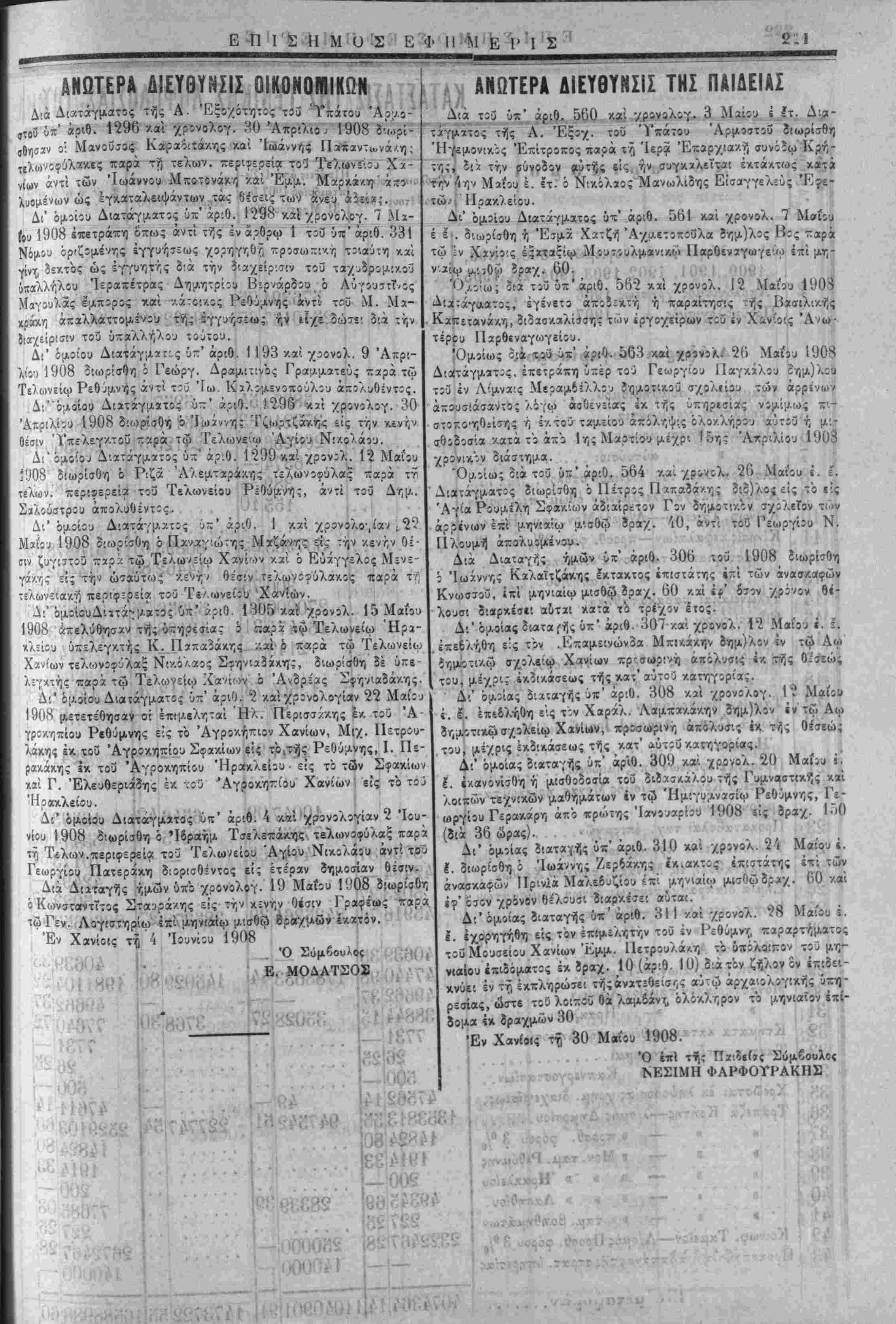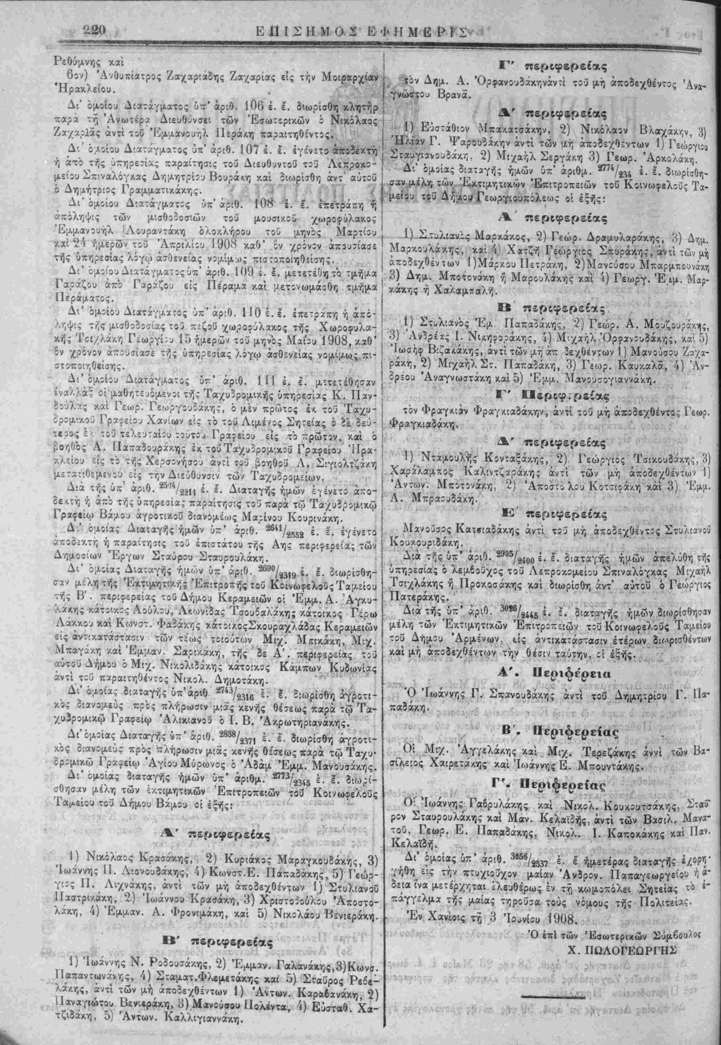 ίεσμοφΰλαξ τώ·< φ,ιλαλών Ρ-Ούμνης Κατήμ Χαροκοπά/.ης καί Χωρισθή άντ* αυτού ό Άλής Χατζή Όμεράχης. Δι' ομοίας ύ—" αριθ. 60 6'. τής 28 Μαίου έ. Ι. άπελύθη ό δικαστικ.ος κλητήρ τής περιφερείας τοΰ Πρωτοδιχείου Χανίων Ν. Φουράκης καί διωρίσθη άντ* αύτοΰ ώς τοιοΰτος ό Μιχ. Παντε¬ λάκη ς. Δι' ομοίας 5π' αριθ. 61 τής 2 Ίουνίου όιωρίτθηΐχν μίλη τοΰ ίκτά/,τΐυ Στρατολογικοΰ Συμδουλίου οί Πρωτοδίκαι τοθ Νομΐΰ Χανίων ό Ιωάν. Καταλαγαριανός, Σφακίων ό "Ιωάν. Δια- ινάκης, Ηρακλείου ό Κ. Τσαγκαράκης κα'ι Λασηθίου ό Ν. Τζωρτζακάκης. Έν Χανίοις τη 2 Ίουνίου 1908. Ό επί τής Δικαιασύνης ΐύ,αβουλο; Γ. ΠΑΠΑΜΑΣΤΟΡΑΚΗΣ ΑΝΩΤΕΡΑ ΔΙΕΥΘΥΝΣΙΣ ΕΣΩΤΕΡΙΚΟΝ Διά το3 ύπ' αριθ. 98 έ. έ*. Διατάγματος τής Α. Έξοχότητος τοΰ 'Υιΐάτου Άρμοοτοΰ Κρήτης, επετράπη ή άπόληψις τής μι- θοδοσίας τοΰ πεζοΰ ΰπενωμοτάρχου τής Χωροφυλακής Άλεΐαν- δράκη Γεωργίου 8 ήιιερών τοΰ μηνός Μαρτίου 1908, καθ" δν χρόνον άπουσίασε τής υπηρεσίας λόγω ασθενείας, νομίμως πιστο- ποιηθείσης. Διά όμοίου Διατάγματος ύχ' αριθ. 102 έ. έ. ίχορη^ήθη ή αίτουμένη αδεία υπό τοΰ πίζοΰ Ενωμοτάρχου τής Κρητικής Χω¬ ροφυλακής Κωνσταντίνου Παπαδαντωνάκη πρός σύναψιν γάμου μετά τής δεσποινίδος Μαρίας Άντων. Μάντακα. ΔΓ όμοίου Διατάγματες ϋπ' αριθ. 103 έ. ί. έχορηγί,θη ή αίτουμένη άϊεια Ιπό τοΰ πεζοΰ Ενωμοτάρχου τής Κρητικής Χω¬ ροφυλακής Αποστόλου Παττακοΰ πρός σύναψιν γάμου μετά τής δεσπονίδος Μαρίας Άντων. Γΐακουμάκη. Δι' όμοίου Διατάγματος ΰπ' αριθ. 104 έ. Ι. έχορηγήθη ή αίτουμένη αδεία υπό τοΰ πεζοΰ Ενωμοτάρχου τής Κρητικής Χω¬ ροφυλακής Μίνωος Παπαγρηγορίου πρός σύναψιν γάμου μετά τής δεσποινίδος Άννης Γεωργ. Άλεξάκη. ΔΓ όμοίου Διβτάγματος ΰπ' αριθ. 105 έ. Ι. ίτοποθετΓ,Οησαν ο] κάτωθι εξ Άνθυπίατροι τής Χωροφυλακής καί Πολιτοφυ- λακής ώς εξής: Ιον) Ανθυπίατρος Χαζιράκης Έμμ. είς τό Ιον Τάγμα 11ο- λιτοφυλακής. 2ον) Άνθυιιίατρος Μελισσείδης Άπολλάίωρος είς τό 2ον Τάγμα Πολιτοφυλαχής. 3ο) Ανθυπίατρος Βατσάκης Ευάγγελος είς την Έσωτερ'.χ,ήν Μοιραρχίαν Χανίων. 4ον) Ανθυπίατρος Βουλγαρίδης Δκ.μήτριος είς την Έξωτε- ρικήν Μουραρχίαν Χανίων. 5ον) Ανθυπίατρος Δημητριάδης Εύγένιος είς την Μΐιραρχίαν