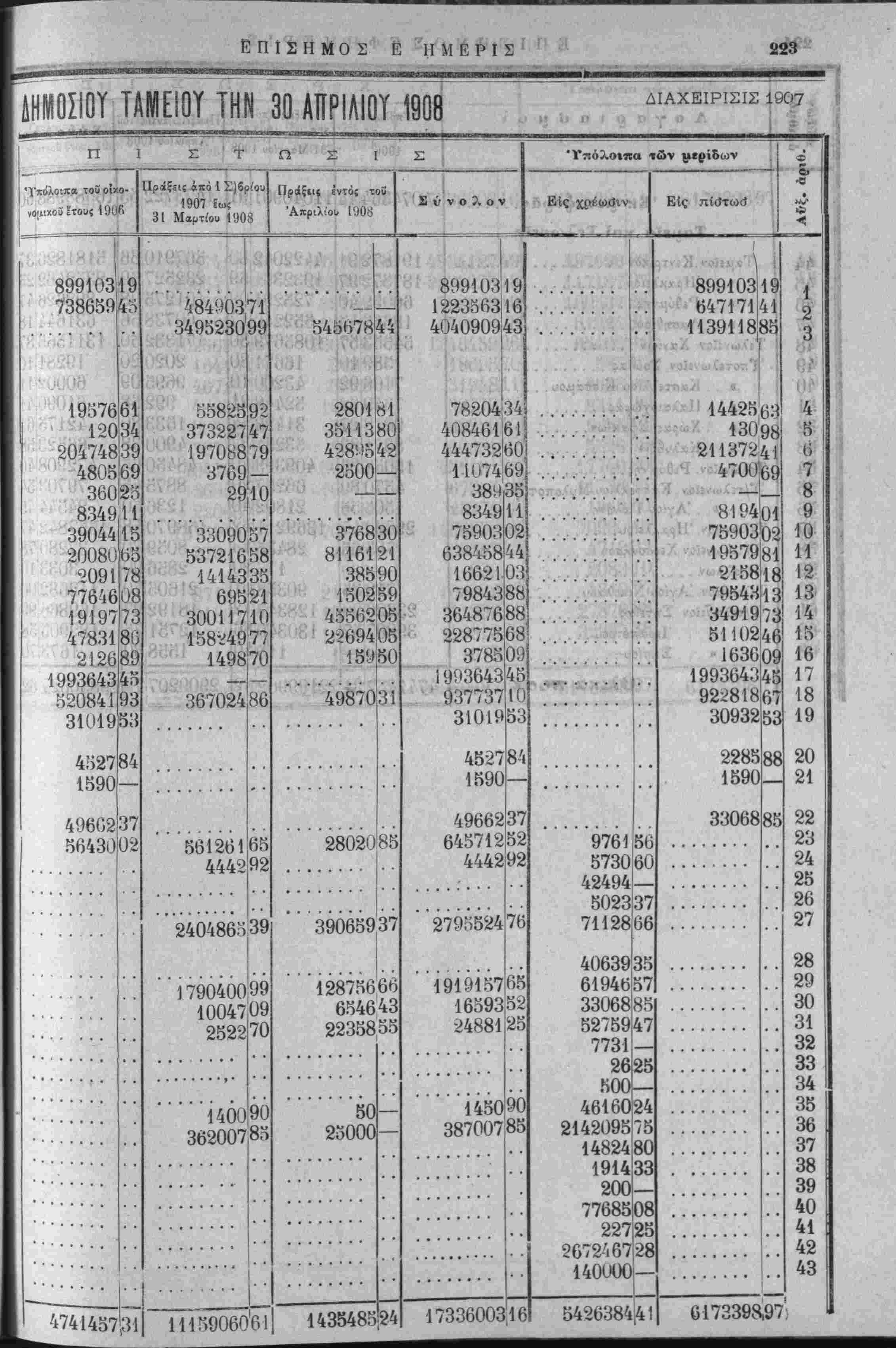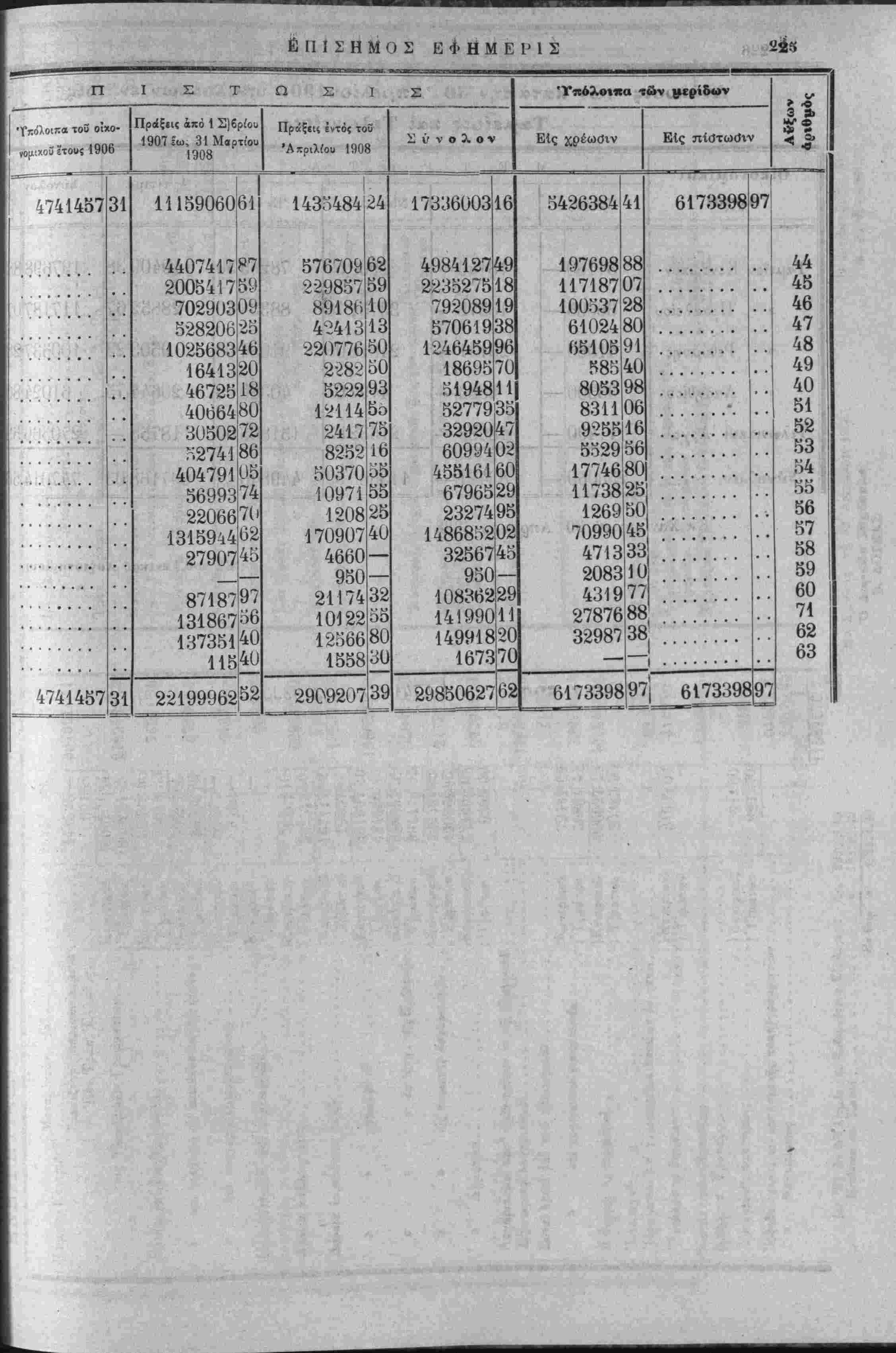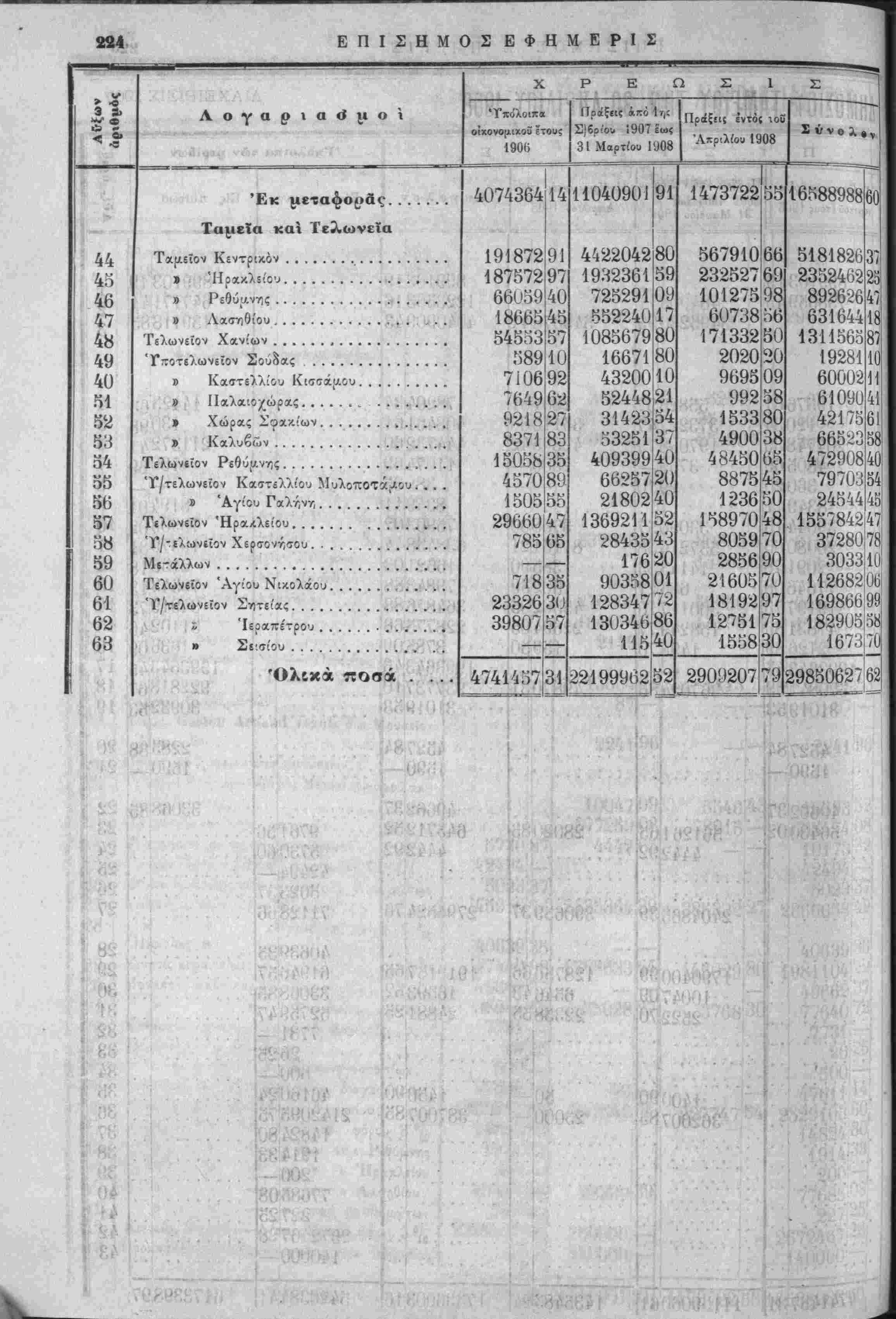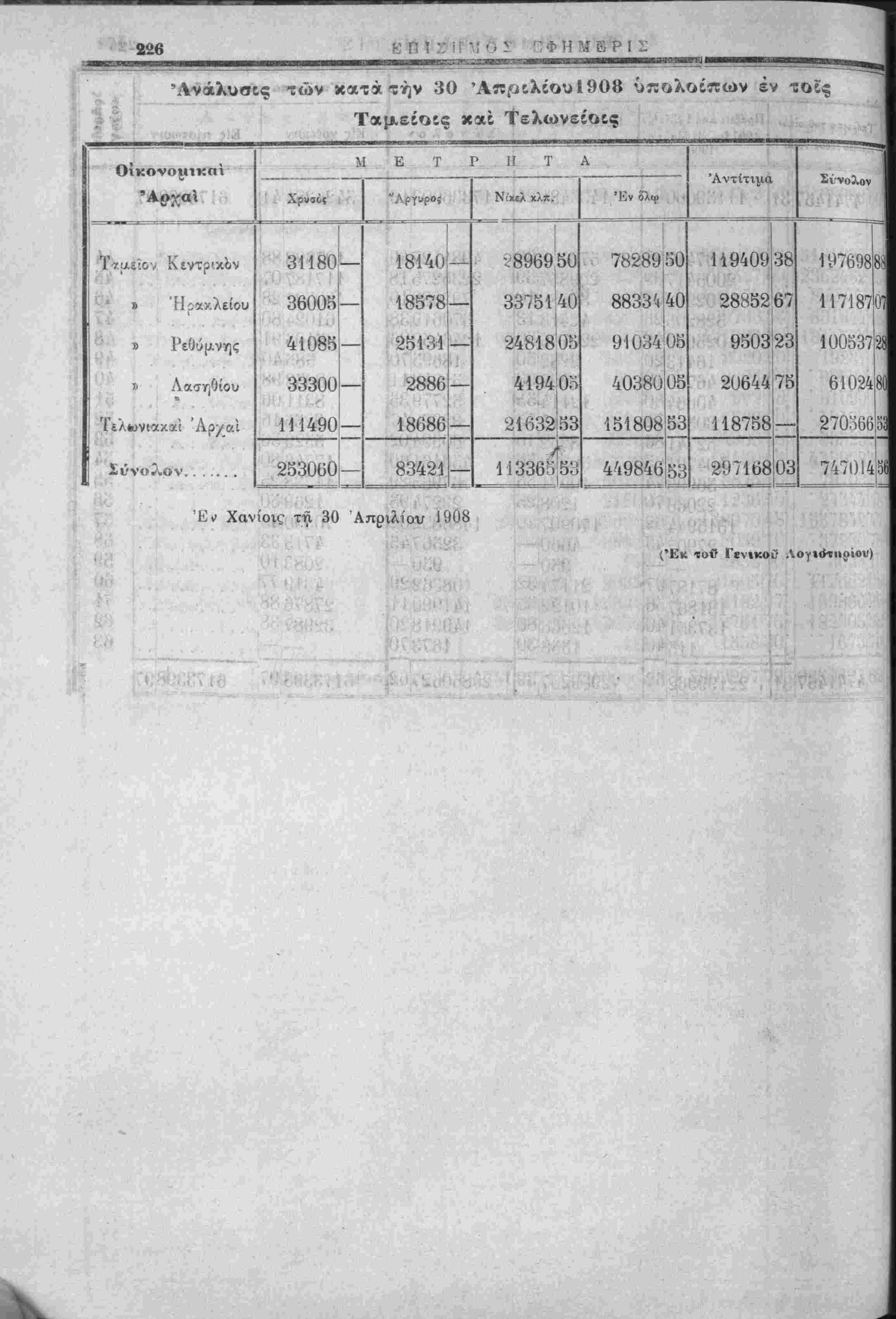 < 1 Ανάλυσις των κατά την 30 Άπριλίου1908 υπολοίπων έν τοις Ταμείοις καΐ Τελωνείοις Οικονομικαί "ΔφχφΙ Μ Ε Τ Ρ Η Τ Α Άντίτιμα Σι νολον Χ** Νιχελ χλπ. Έν δλφ ;)Ρ*μεΐον Κεντρικήν 31180 .— 18140 — -.8969 50 78289 50 119409 38 19769889 χ* » Ηρακλείου 36005 — 18578 — 33751 40 8833 40 28852 67 11718701 **·*_' » Ρεθύμνης 41085 ι- * — 28131 — 24818 05 91034 05 9503 23 1005372! ι> Λασηθίου
