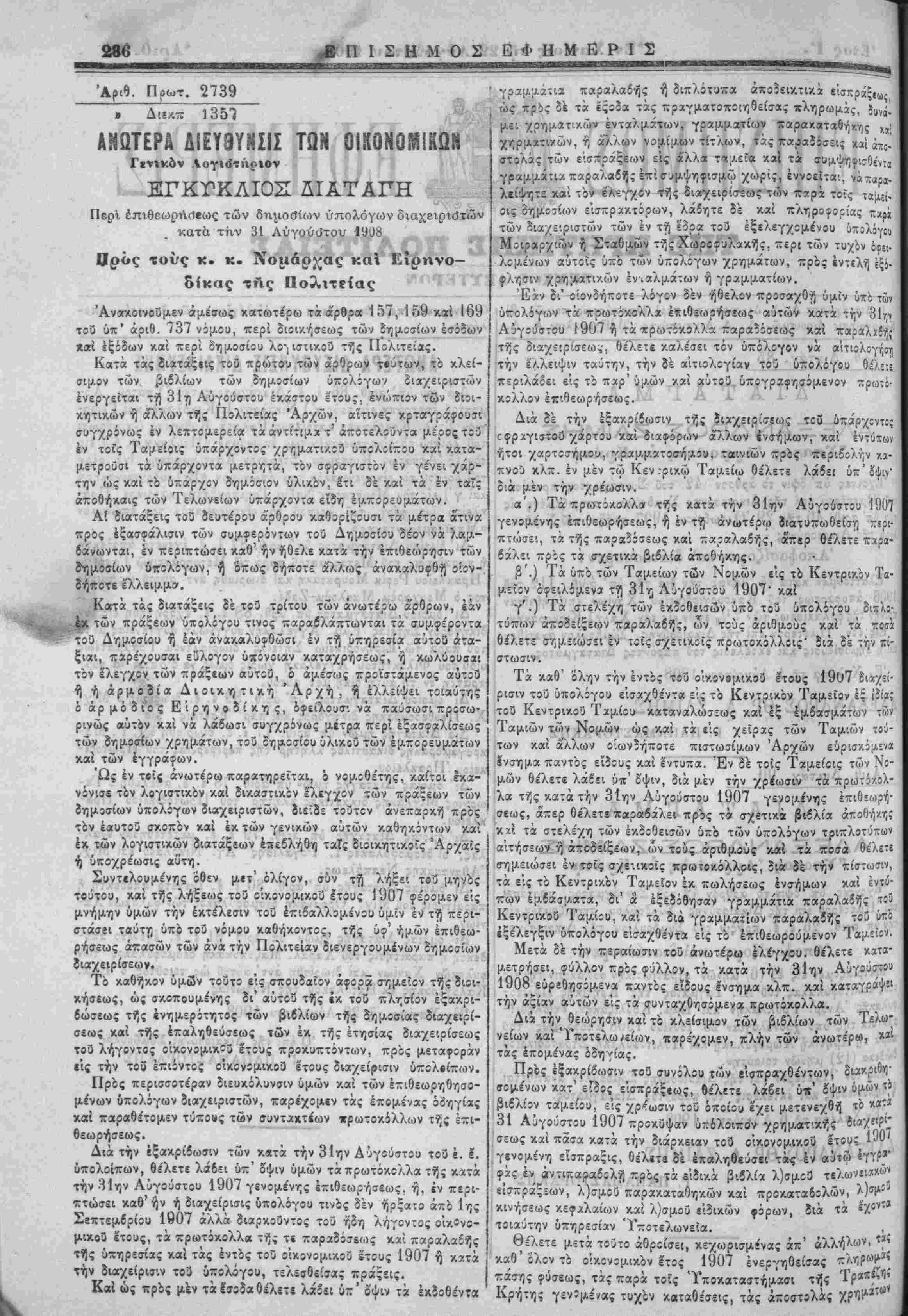 τού έ. έ'. Εγκυχλί:» τής Ανωτέρας επί των Οικον;μι/ών Δι-