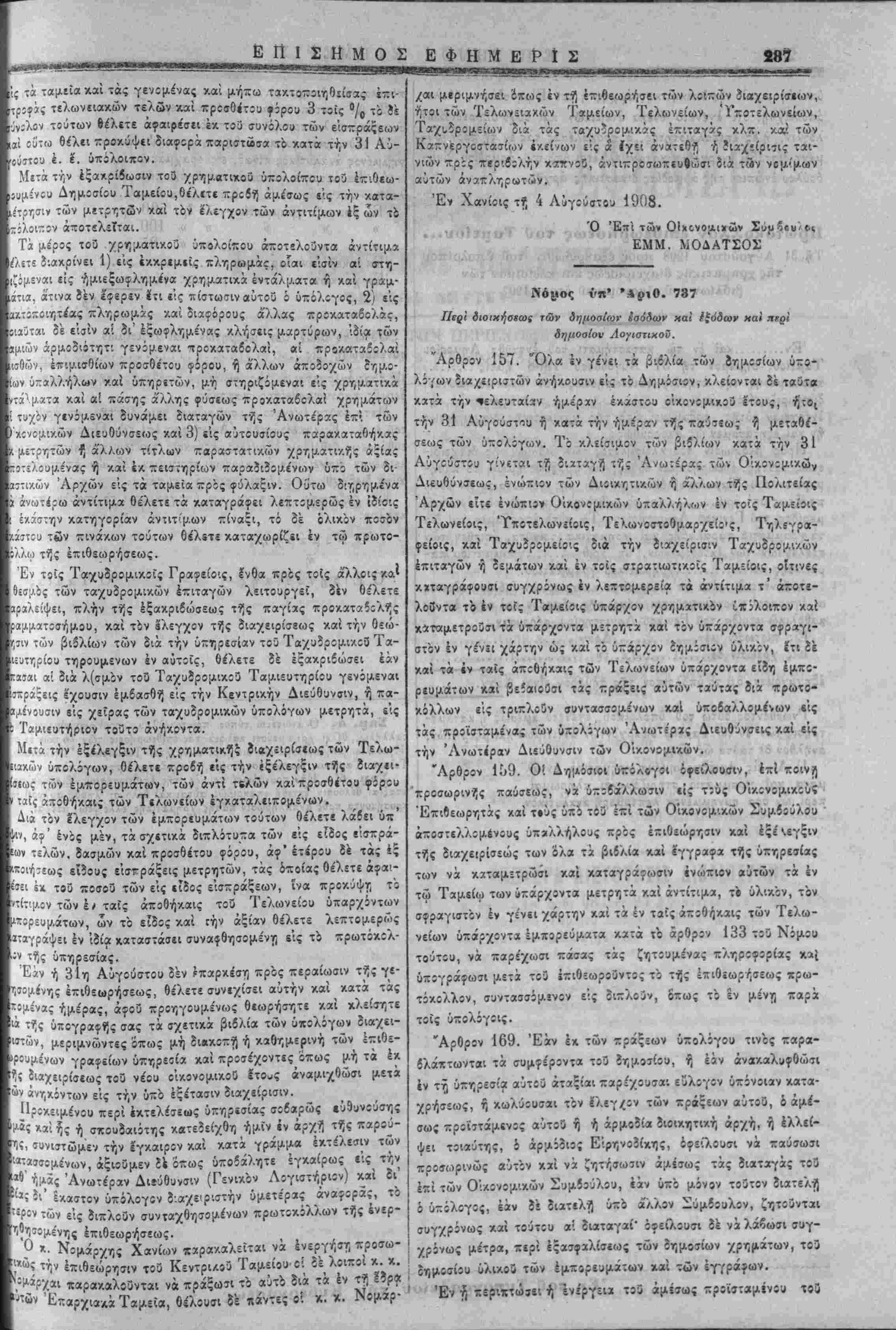 τού ϋπ' αριθ. 737 νόμου, περί διοικήσεως των δημοσίων έσόδων