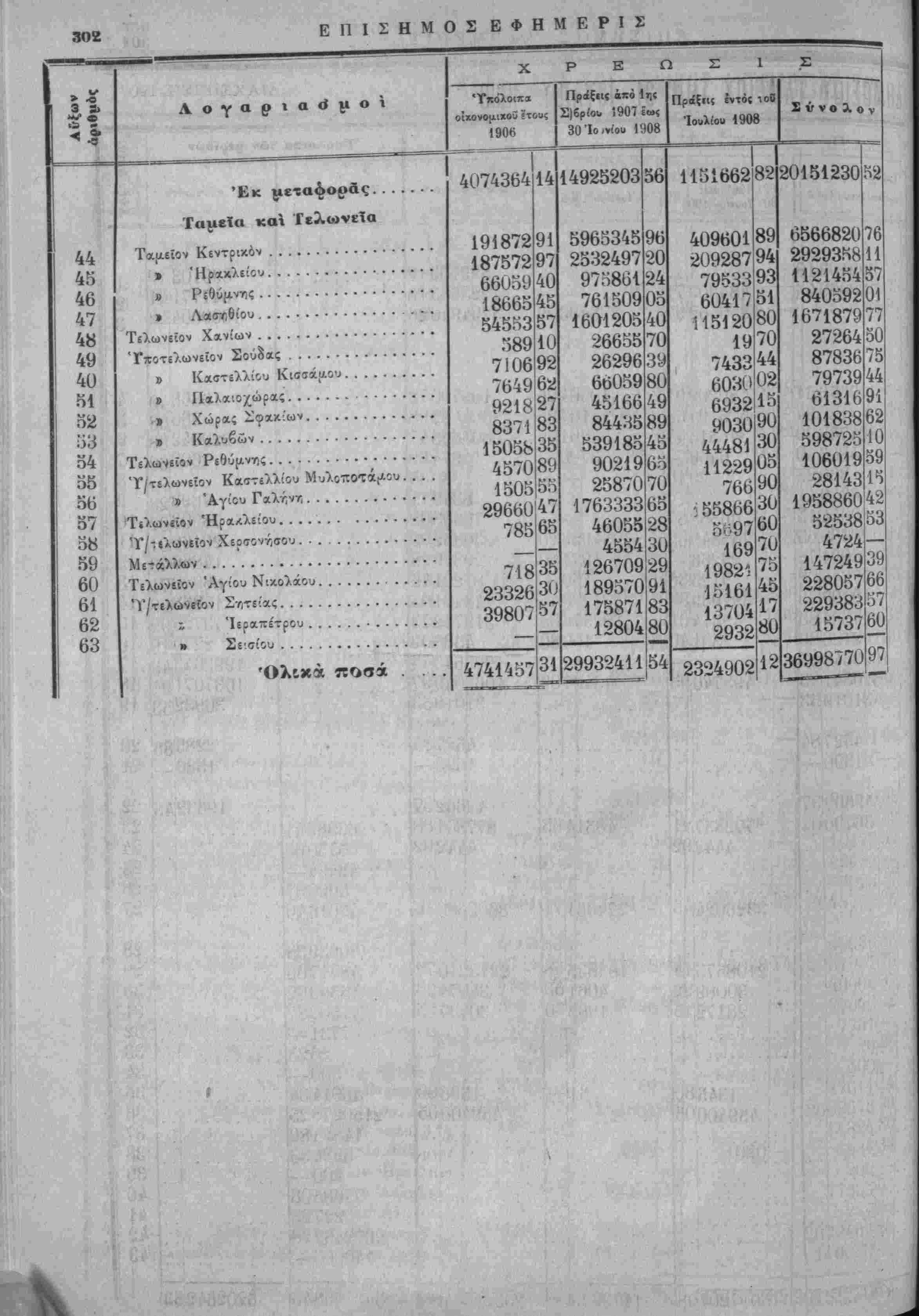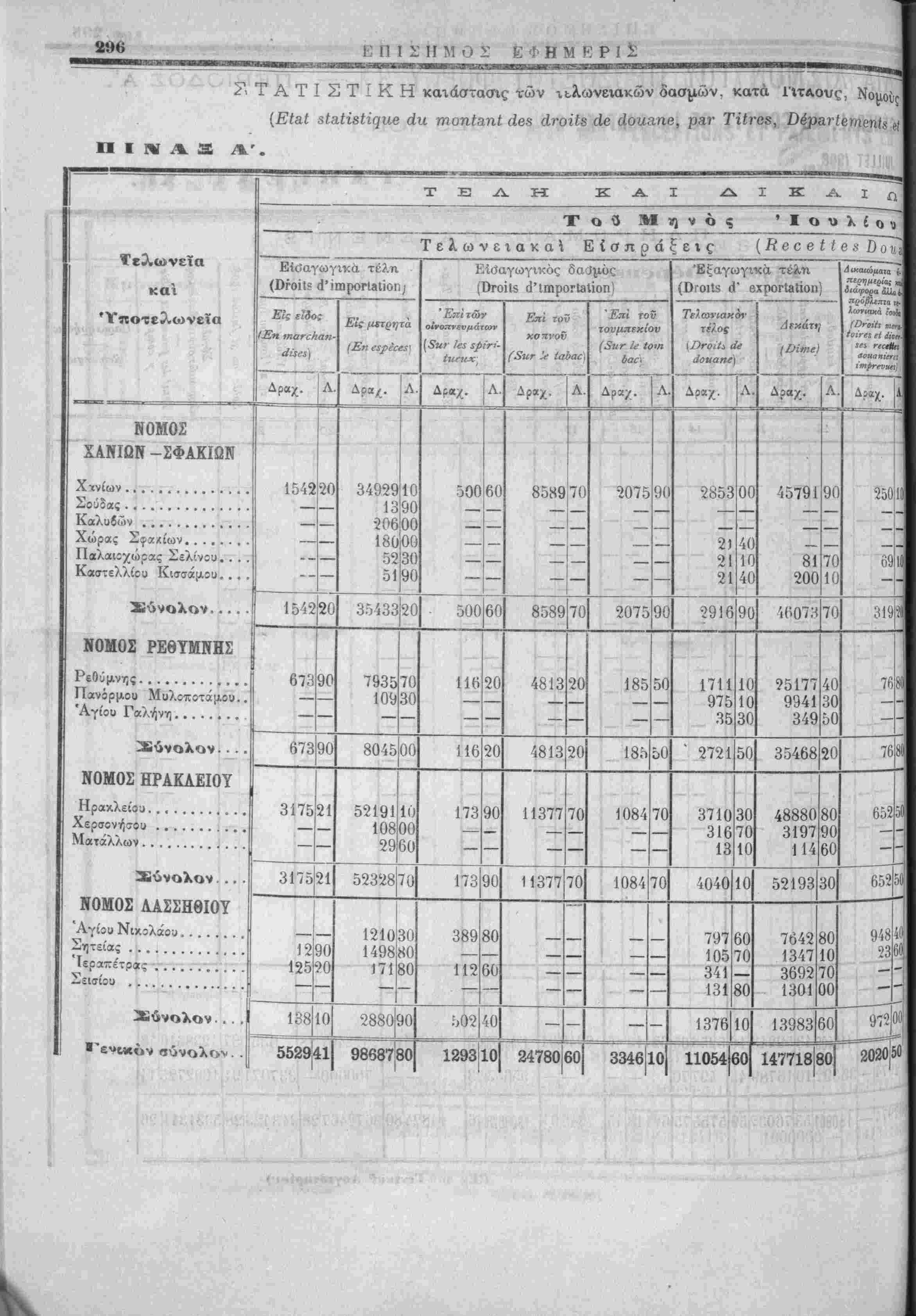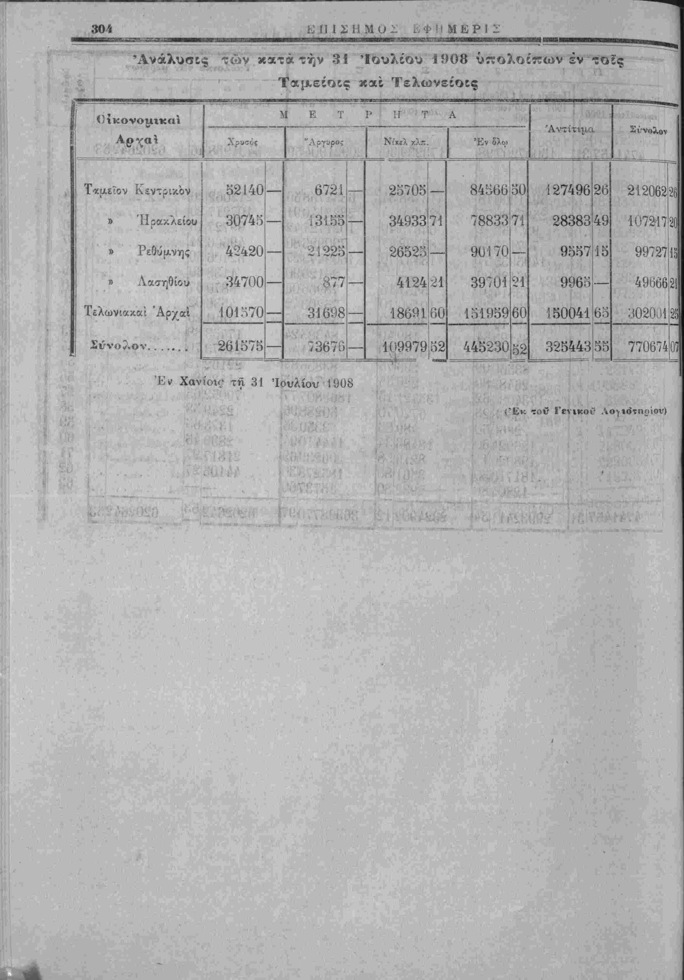 Έν δλ<ο ι Ταμείον Κεντρικόν 52140 — 6721 — 25705 — 84566 50 127496 26 212062 21) » Ηρακλείου 3074ο — ι 3155 — 34933 71 78833 71 28383 49 107217 20 » Ρεθύμνης 42^20 — 21225 — 26525 — 90170 — 9557 15 99727 1.) » Λασηθίου 34700 — 877 — 4124 21 39701 21 9965 — 49666 21 Τελωνιακαί 'Αρς/αί 101.Η70 — 31698 — 18691 60 151959 60 150041 65 ;>020ϋΐ