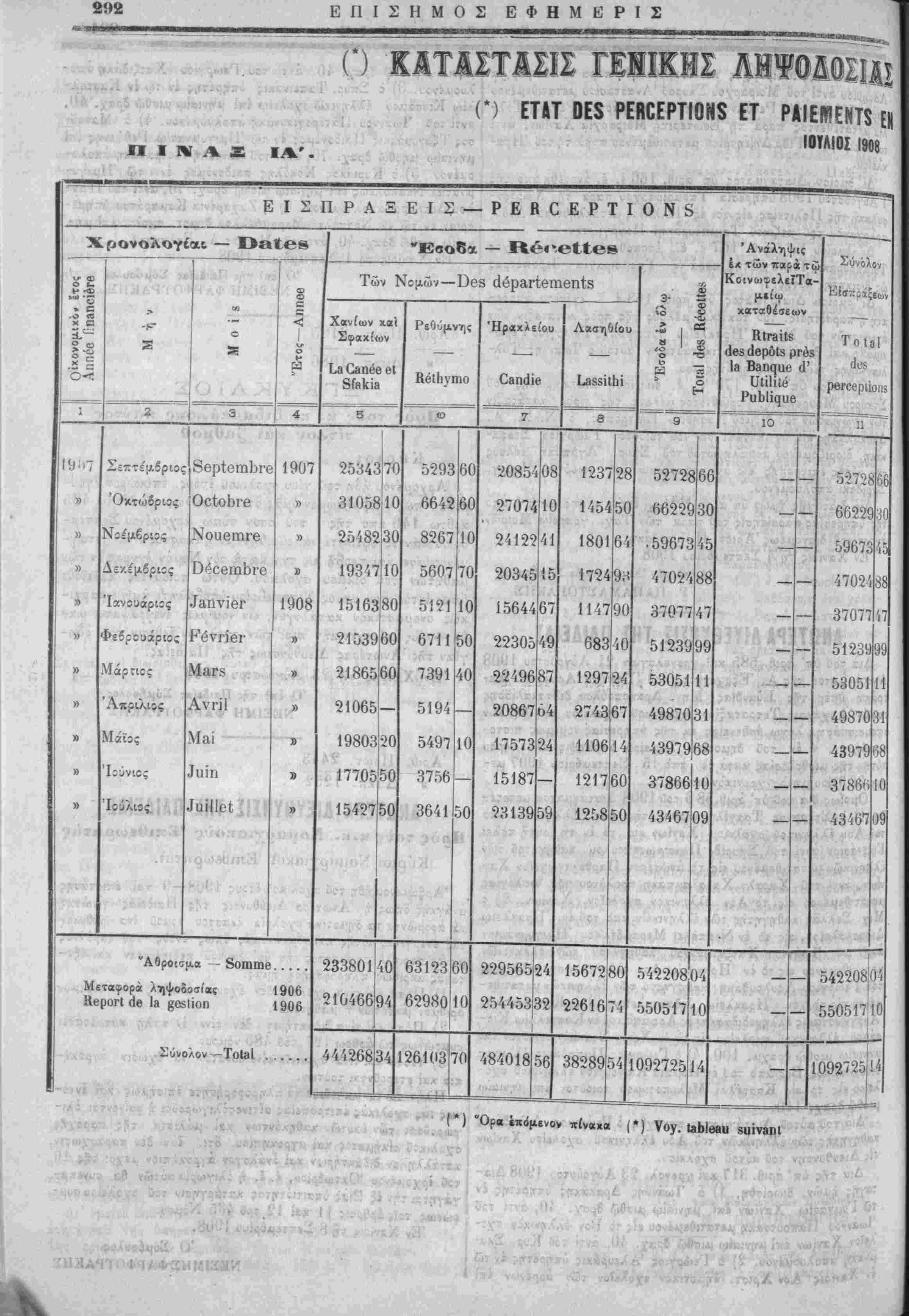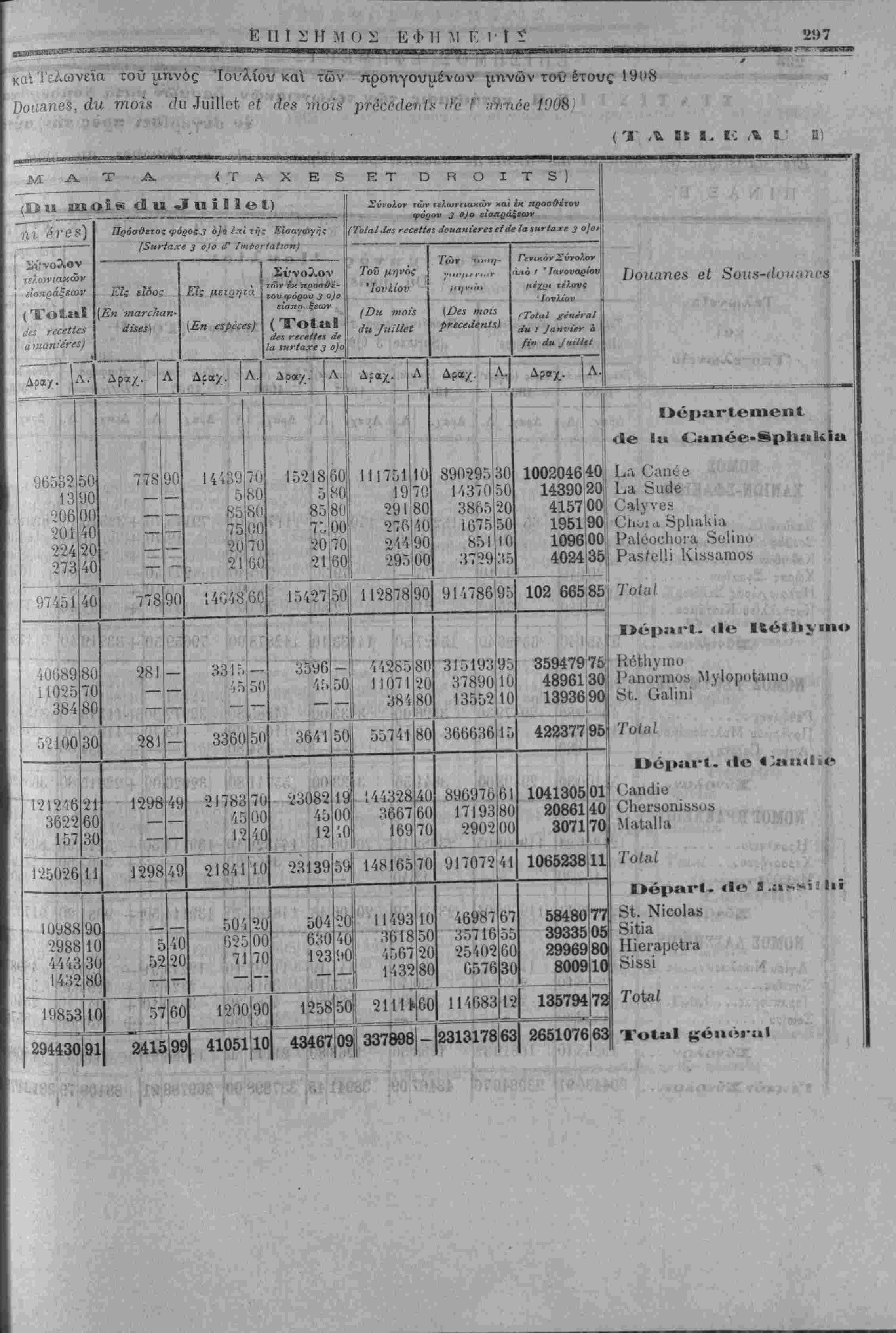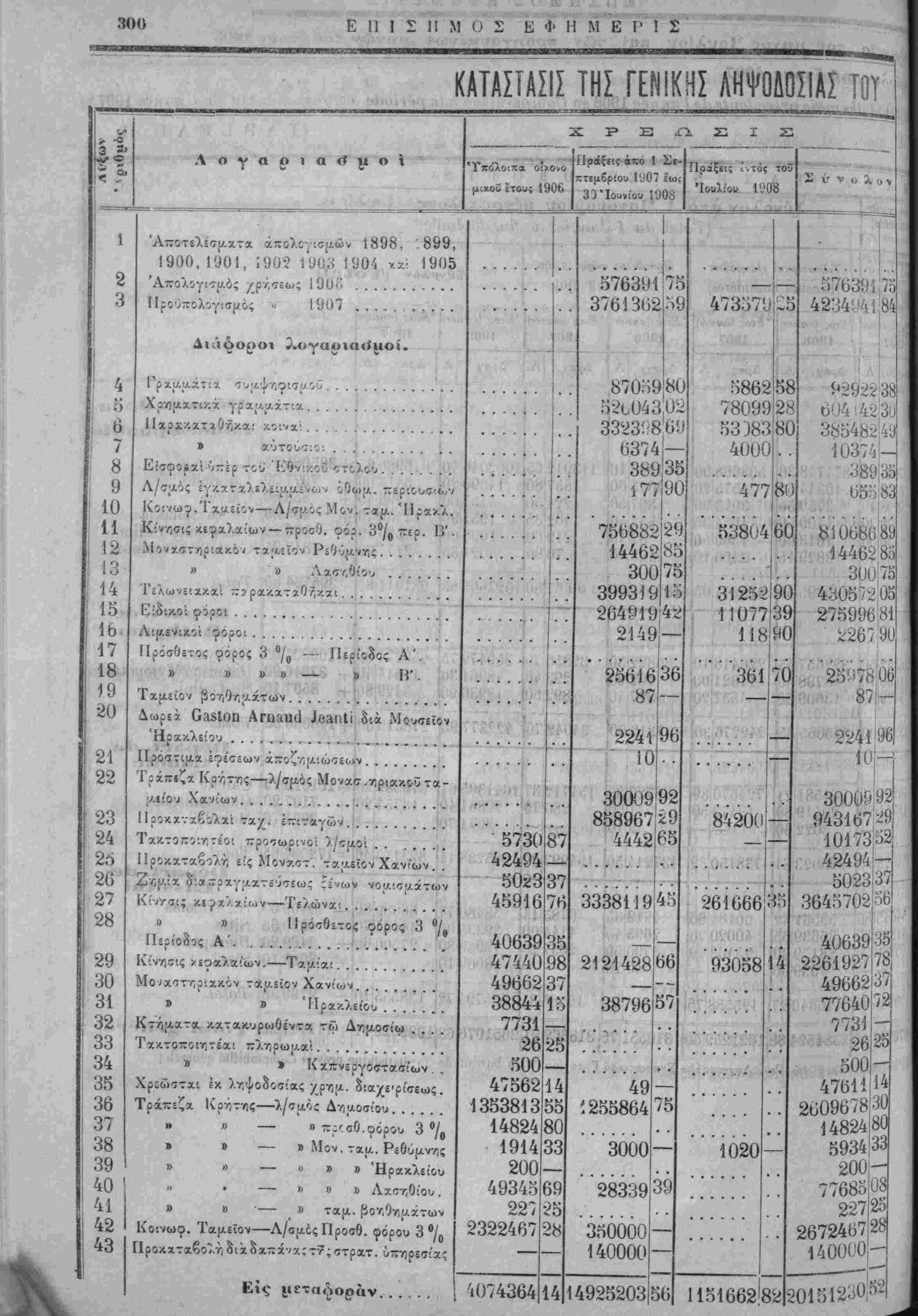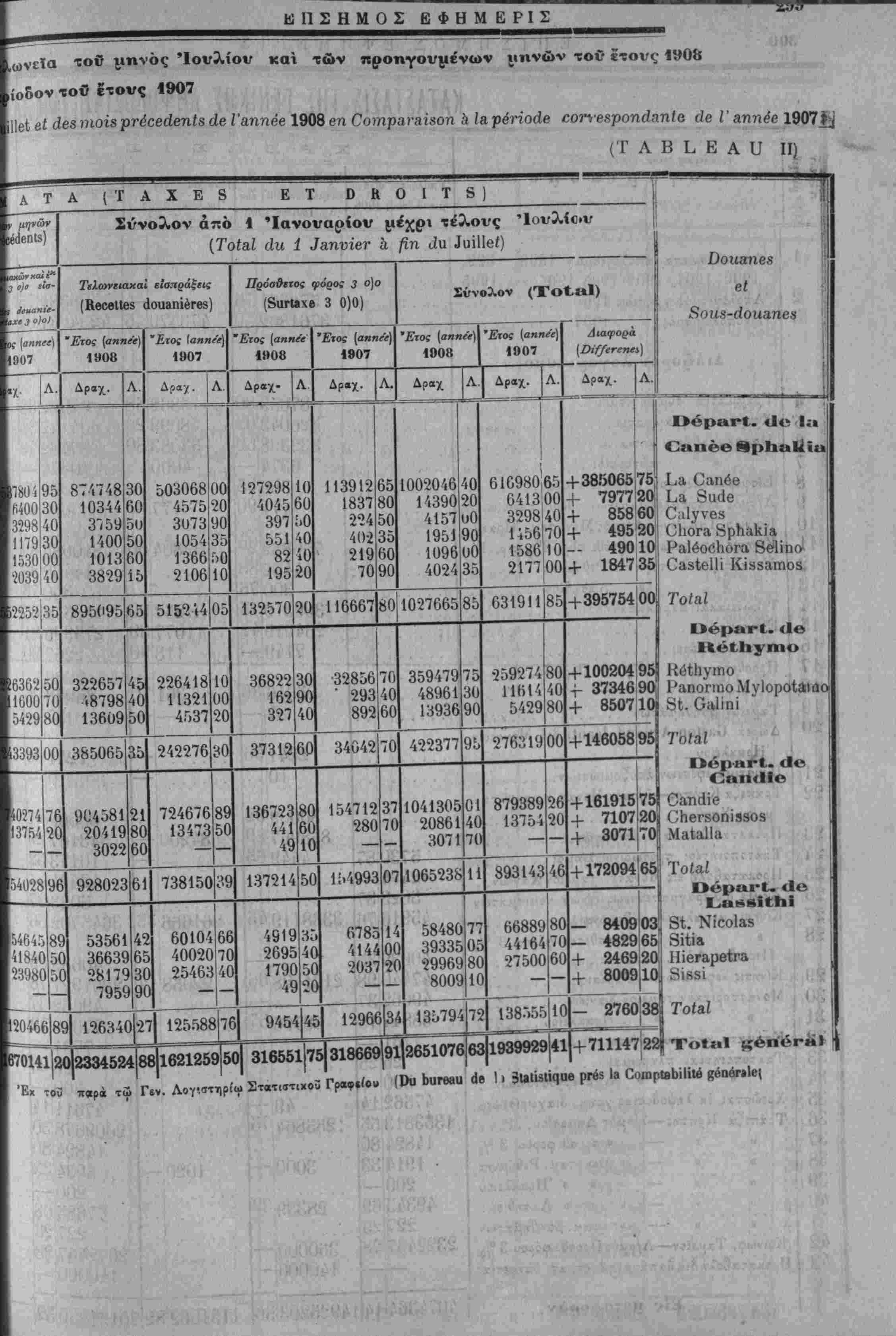 Έν δλ<ο ι Ταμείον Κεντρικόν 52140 — 6721 — 25705 — 84566 50 127496 26 212062 21) » Ηρακλείου 3074ο — ι 3155 — 34933 71 78833 71 28383 49 107217 20 » Ρεθύμνης 42^20 — 21225 — 26525 — 90170 — 9557 15 99727 1.) » Λασηθίου 34700 — 877 — 4124 21 39701 21 9965 — 49666 21 Τελωνιακαί 'Αρς/αί 101.Η70 — 31698 — 18691 60 151959 60 150041 65 ;>020ϋΐ