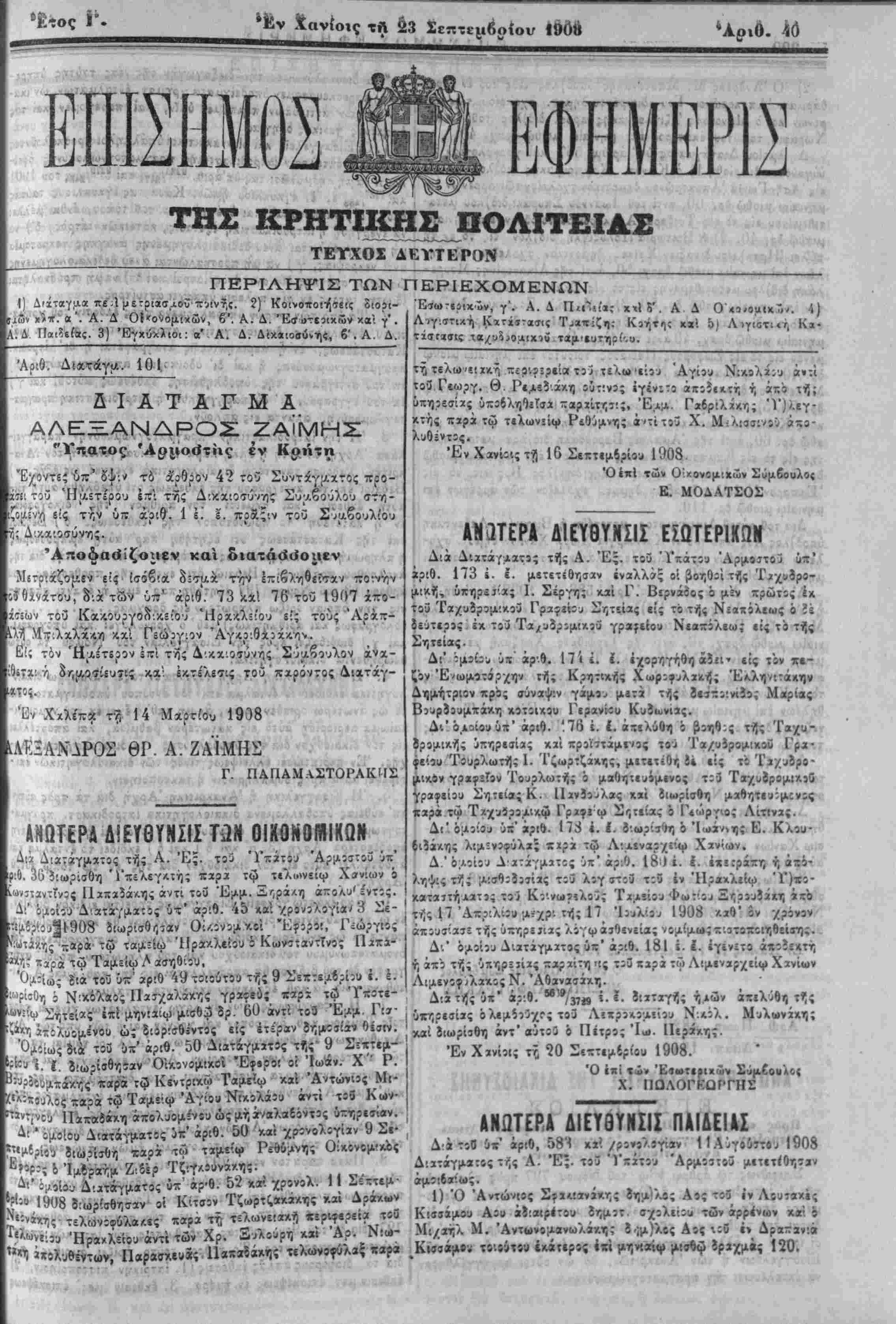 !. Δ ΠαΐίείΒς. 3) Ένχύχ)«π: «' Α. Δ. Διχ*ιοσύνη<, β'.Α. Δ. ΠΕΡΙΕΧΟΜΕΝΟΝ "Αριθ. 101 ·Ι Α Τ Α Γ Μ Α . ΑΛΕΕΑΝΔΡΟΣ ΖΑΪίνΙΗΣ "Υπατος Ά^μοότης έν Κοήτη Έχοντες ύπ' :* τό αρθρον 42 τοϋ Συντχγμχτος προ-