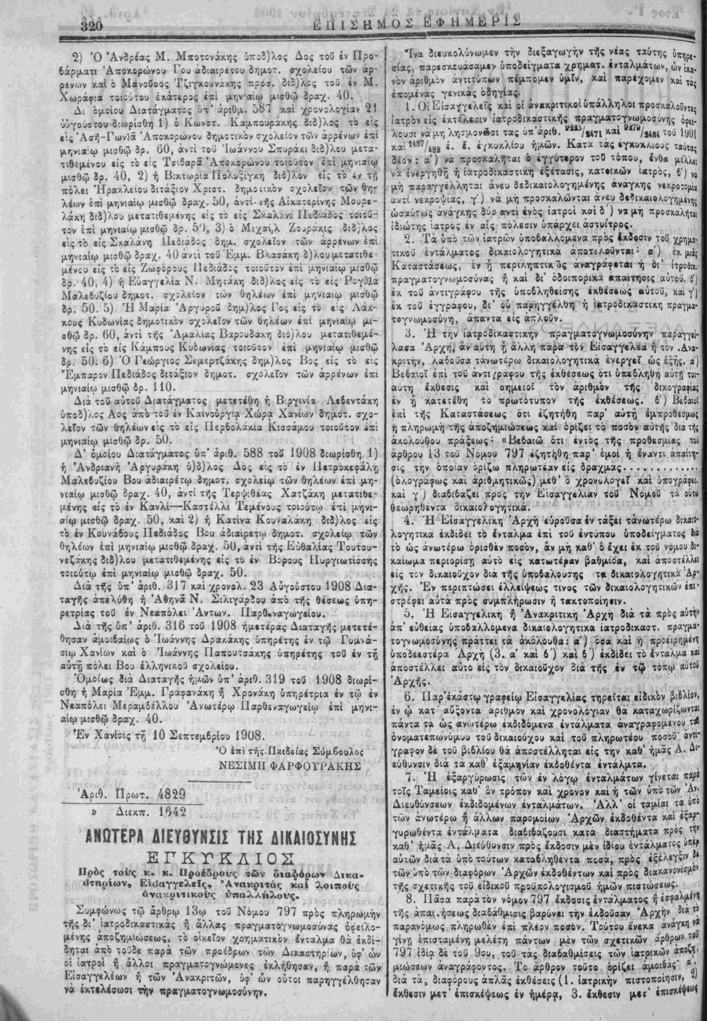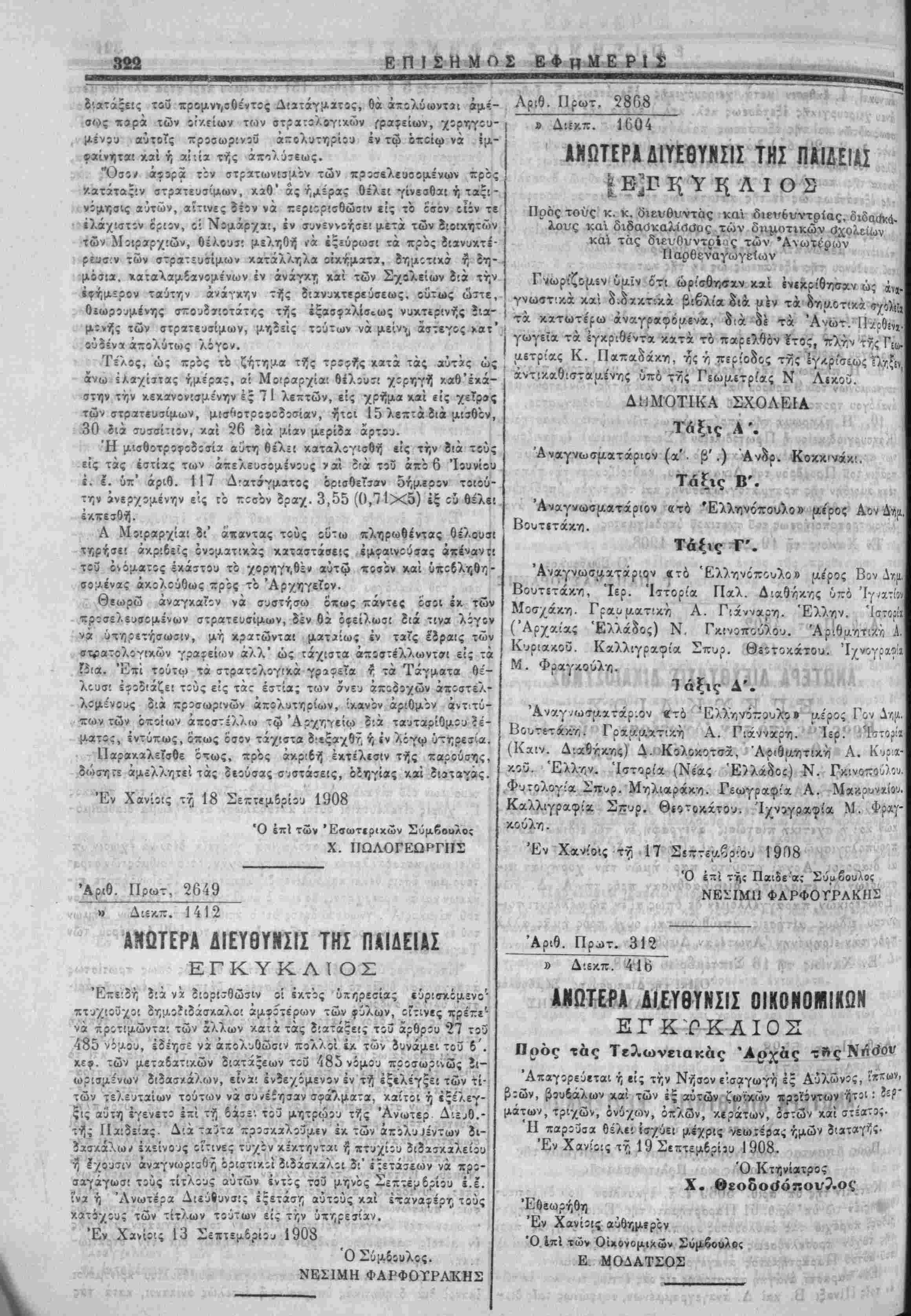 καταιτήχατος τοί Κ>'.νω5ϊλο3ς Τχ,Αϊίου Φω:'5^ Ξ<;?3υδάιιτ, ίϋ'ο ί τής 17 Άπρ:λ'.:υ μ;χρι τί{; 17 ΊΐΑίί.» 1908 νιαβ' όν χρόνον ί ίί ής ρ μχρ { άπ;υσ''ασε τής ύπηρεΐιας λίγψ ασθενείας νομίμωςπυ Δ'.' όμοίίυ Λιατάγμχτος ύπ'αριθ. 181 ϊ. Ι. ίγενίτο άπΐϊεκτη ή άπϊ τής ΊιπηρΞΐίΐς -ϊραίτη ΐις τ;ϋ καρά τω Λιμΐναρχιίψ Χανίων Λιμεν5φ^λακος Ν. Άθανασάκι;. Δ:ί τής ύχ' αριθ. ^^τ» »· '· ίι««γη*; ή.ιών ά ύκηρεσίας όλεμί^Οχρς τοϋ Λΐτρϊιΐονιιίΐ^ Ν:*:λ. καί διωρίσθη άντ* αυτού ό Ιΐίτρο;'1<ΐ>. Περάκης.