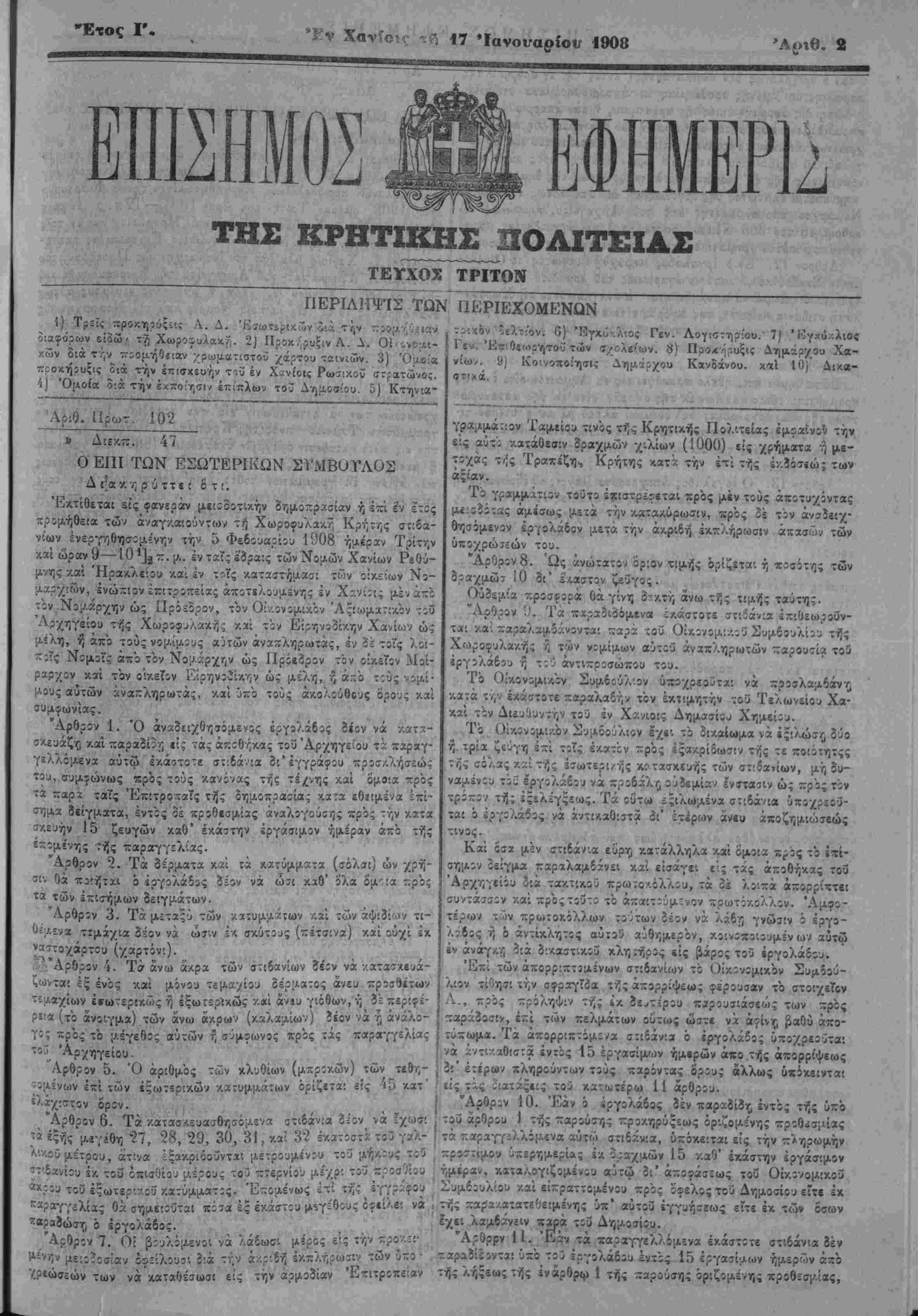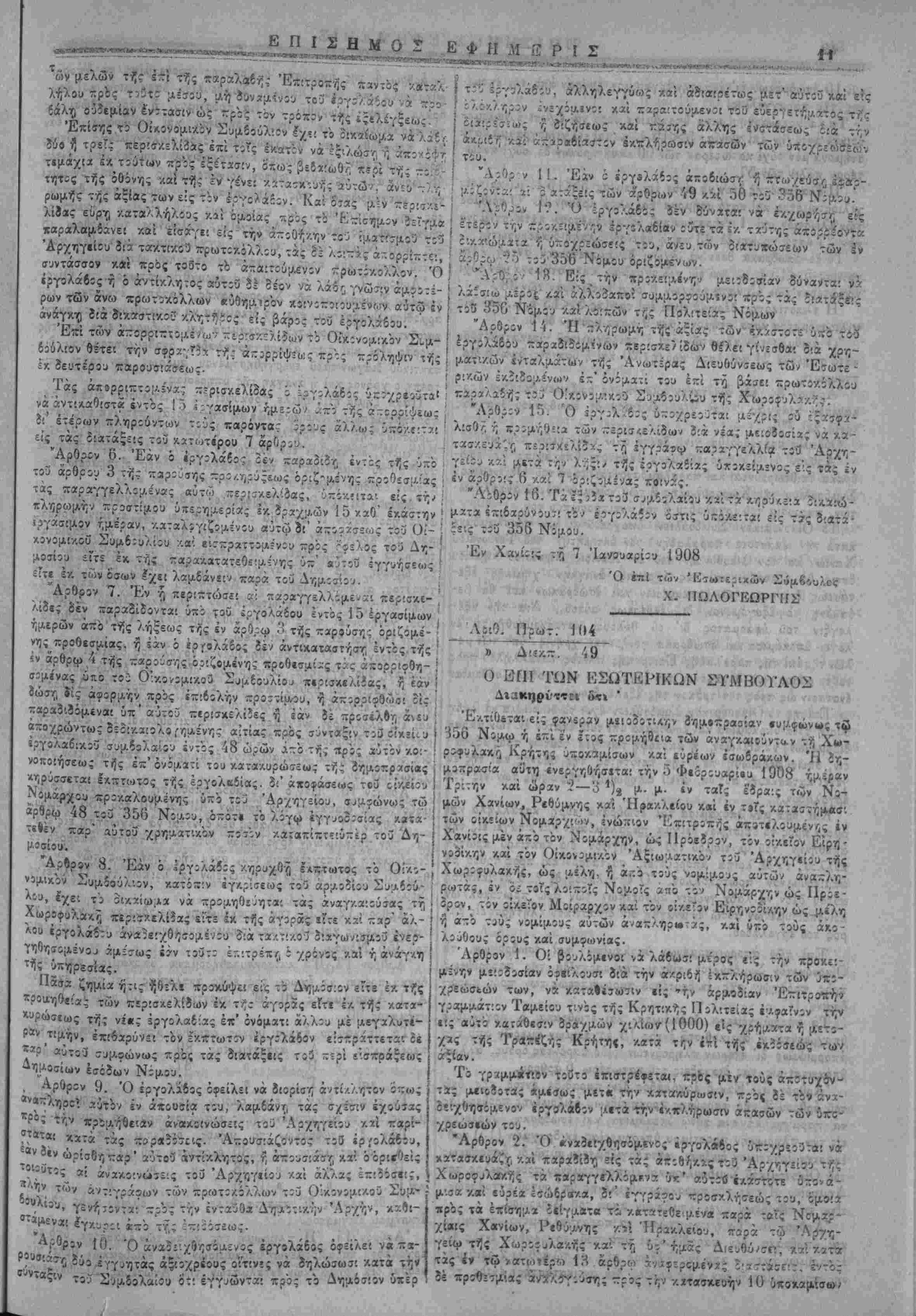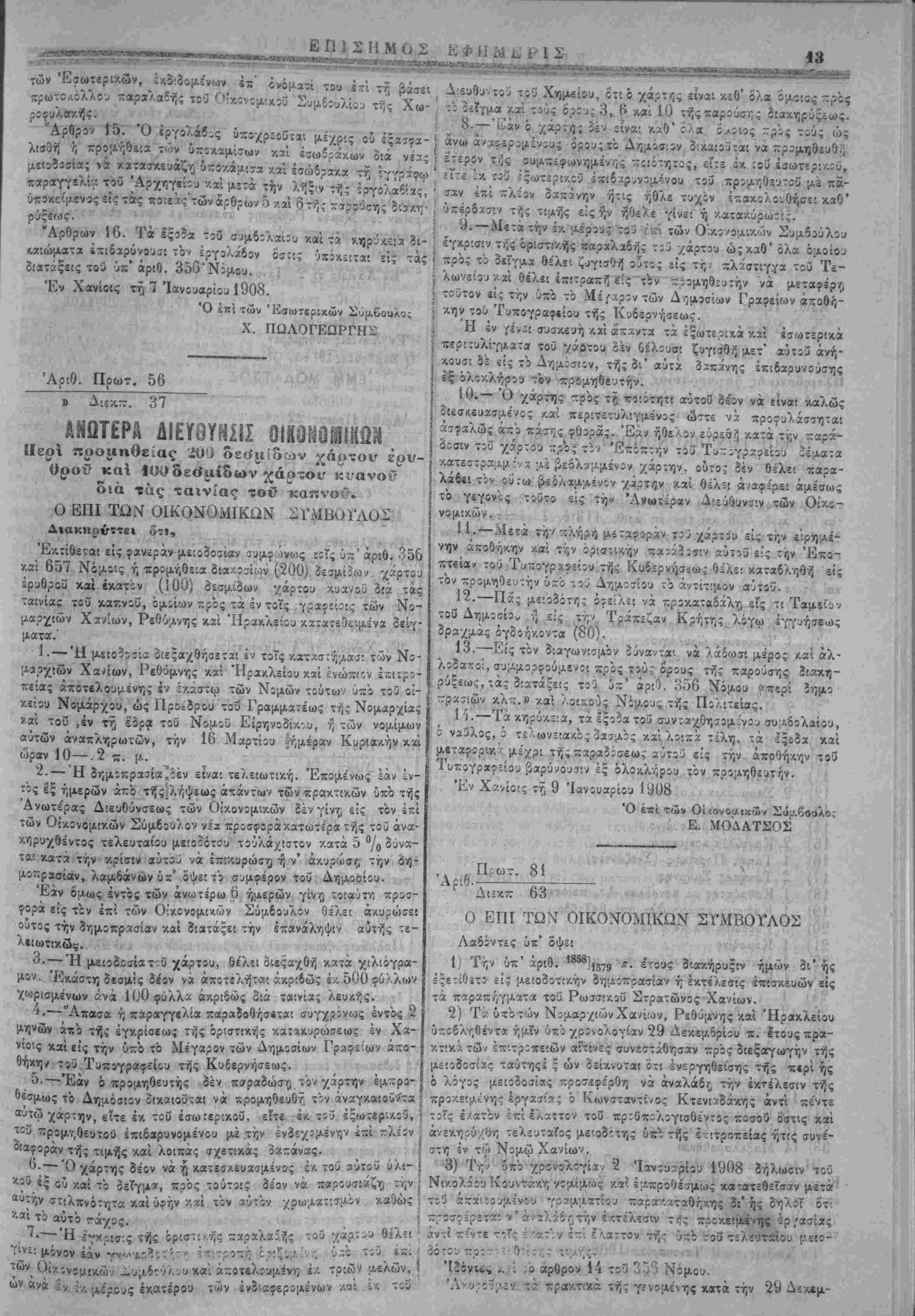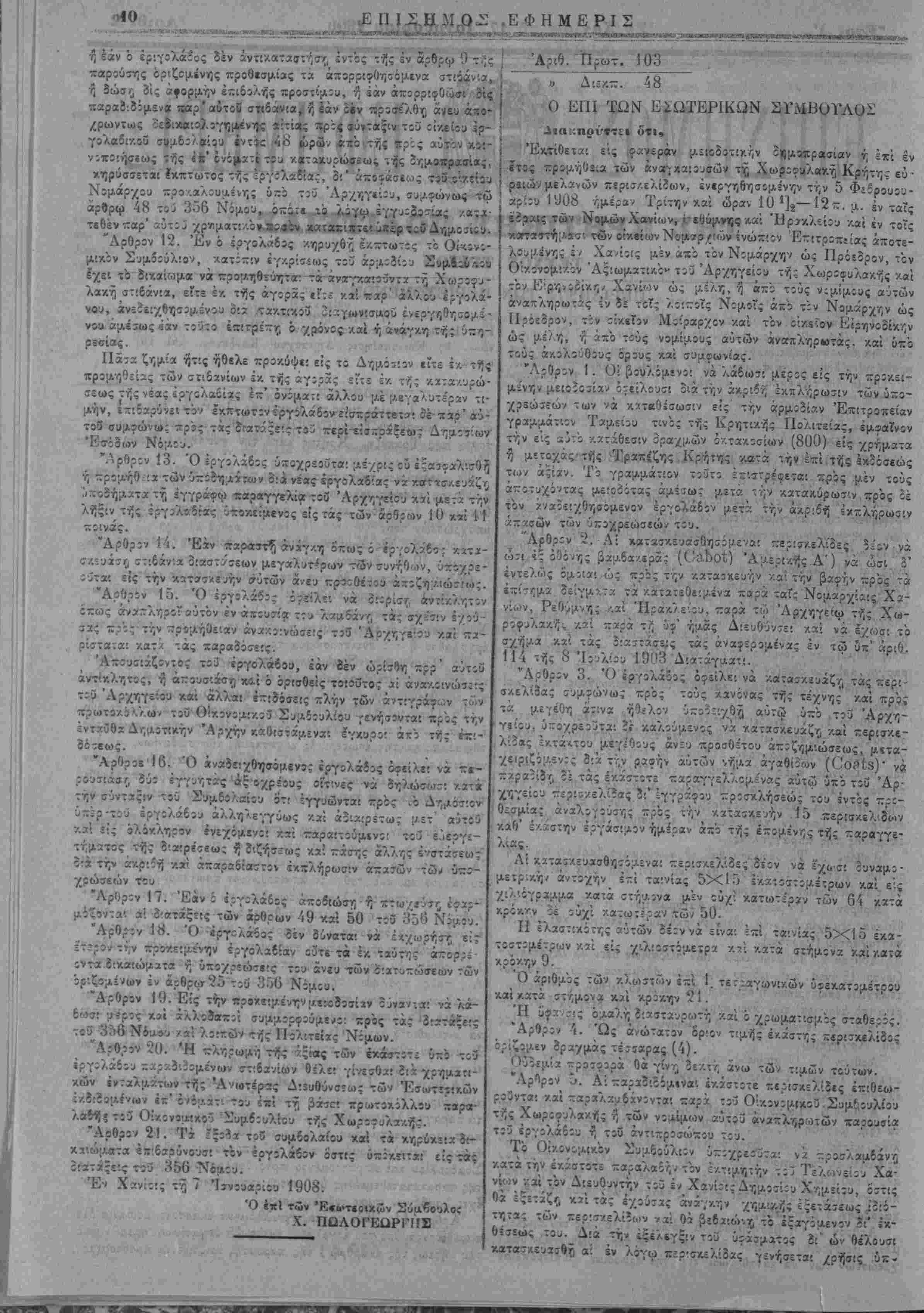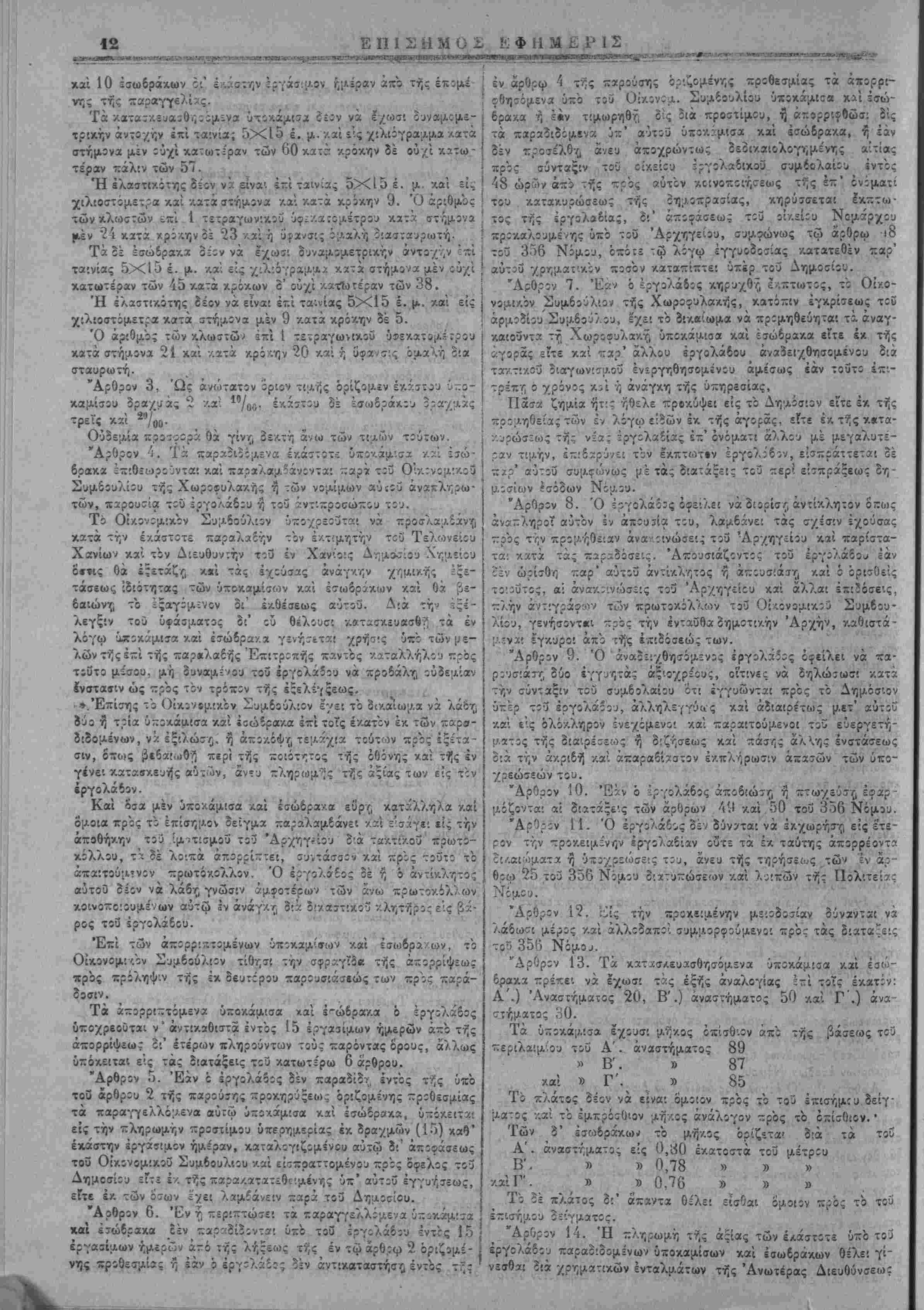 Γεν. Έα<0ε.η>ρ'<)τοϋ των σ/ολείων. 8) Πίοχηρυξΐζ Δημάρχου Χα¬ νίων. Ι) Κο'.νοποίησις Δημ,άρχου Κανδάνου. καί 10) Δικα- στ'-ά γραμμά::ον Ταμείου τινός τής Κρητικής Πολ'.τείας έμφαϊνον την εις αύτο -Λατάθεσιν δραχμών χιλίων (1000) είς χρήματα ή με¬ τοχάς τίίς Τραχίζη·, Κρήτης κατ;: την ΐτί τής ίν.δόσίώ; των αξίαν. Τό γραμμίτιον τουτο ίϊΐστρεΐεταΐ πρός μέν τους άποτυχόντας μιιοϊότας άμίσως μίτά την κ,ατα/ΐύρωσιν, πρός δέ τον ανοιχ¬ θησόμενον εργολάβον μετά την άκ,ριδή εκπλήρωσιν άιτασώ^ των ύποχρώκών τού. "Αρθρον 8. Ώς ανώτατον όριον τιμής όρίζίτα'. ή ποσότης των ρα/μωτ ιο δι ελαστον ι,ευγος. Ούϊεμία προσΓορά θά γίνη δν/.τϊ", άνω τής τιμής ταύτης. Άρθρον '.). Τα ζΛραδιδόμενα όχάστοτϊ στ:ί'άν:α ϊπιθεωροΰν- ταί καί παραλαμδάνοντα: παρά τοΰ Οίχονομι/.οϋ Συμβουλίου τής Χωροφυλα/.ή; ή των νομίμων αΰτοΰ άναπληρωτών παρουτία τού ίργολάβοιι η τ: ι αντιπρόσωπον τού. Τό Οίκονομ'.ΛΟν Συμβούλιον ύ·Λ5χρεο"ίϊα! νά προσλαμδάντ; χ,α;ά τ ι,ν εκάστοτε ^ιιραΧΛ&Γ^ τόν έκτ.μητήν τοΰ Τϊλωνείου Χα- κ^'. τόν Διευθυντήν τού έν Χανίοις Δημοσίου Χημείου. Τό Οικονομικόν Συμβούλιον Ιχε'. τό δικαίωμα νά ίςιλώσ^ δύο ή τρία ζίύγη επί τοίς εκατόν πρός εξακρίβωσιν τής τε ποιότητςς τήί σόλας/.αί τής Ισωτερι/ής κ:·τασκευής των σπίαίίων, μή δυ¬ ναμένου τόϊ εργολάβον νά προδάλί) ουδεμίαν Ινσταιΐν ώ; πρός τόν τρόπον τή; ϊξϊλέγξίως. Τα ούτω ϊξιλωμένα σιιδάνια ύποχρεοΰ- ται ό ίργολάβος νά άντι/.αθυτ» έί' έτίρων άνευ άποζημιώσεώς τινος. Καί ό'σα μέν στιδάν.α εΰρη κατάλληλα καί ό'μοια πρός τό ΐ~ί- σημον οείγμ* παραλαμβάνη καί είσάγβι ε'.ς τάς αποθήκας τοΰ Άρχηγείόυ 5ιά τακτικοί κρωτοχ.όλλου, τα 3έ λοιπά άπορρΪΈτει συντάυον /.αί πρός τουτο τό απ«:τούμςνον πρωτόκολλον. Αμφο¬ τέρων των πρωτοκόλλου τούτων δέον νζ λάβη γνώσιν ό έργο- λ?6ος ή ό άντίκλητος αΰτοϋ αυθημερόν, χοινοποιοομέν ών αύτω ΐν άνάγ/.ν; ?ιά δίκαστικίΰ κλη:ήρος ϊίς βάρος τοϋ ίργολάβου. Επί των άπορριπτίμιένων στίδανίων τό Οικονομικόν Συμβού¬ λιον τίθησι ΐήν σφραγΐία τής απορρίψεω; φερουσαν τό στοιχείον Α., πρός πρόληψιν τής ΐκ δευτέρου πίρουσιάσεώς των πρός ταράδοσιν, επί των πελμάτων ούτως ώίτε νά αφίνς βαθΰ «χο- τύπωμα. Τα άπορριπτόμε^α σΐίδίνυ ό ίργολάδο; ύποχρεοίτα: νά άντι/.αθίστα ίντός 15 έργασίμων ημερών άιτο τής άπορρίψεως ϊι' έτιρων πληροϋντων τοϋς παρόντας ό'ρους άλλως ύΛΟκβινται είς τίς :ιατάς*:ς τοϋ κατα>τέρω 11 άρθρου.