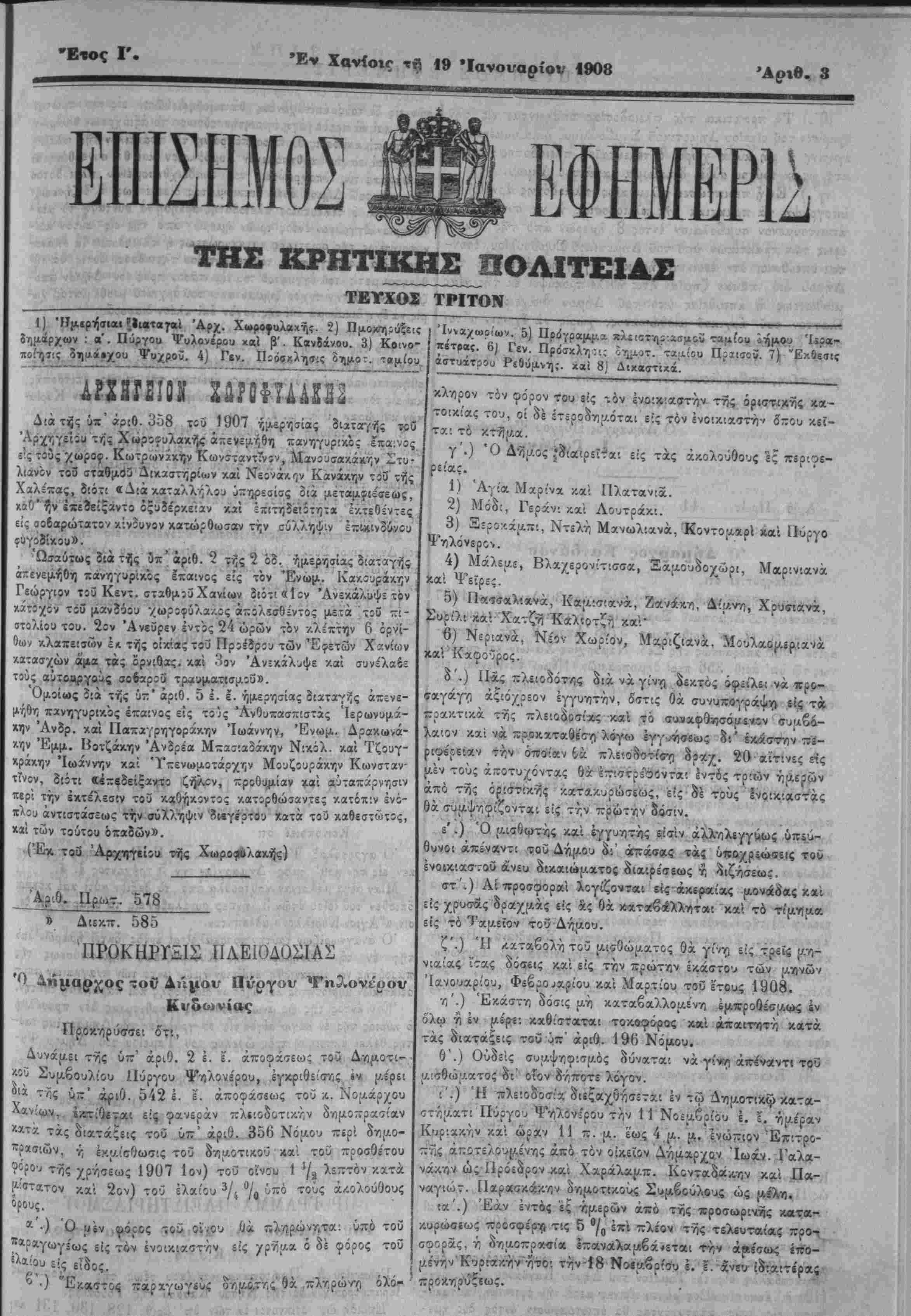 λιανον το3 σταβμο'ΰ Δικαστηρίων καί Νβονάκ<]ν Κανάκην τίϋ τής Χαλέχας, διότι «Διά κατάλληλον υπηρεσίας 3ίά μεταμφιε'σεως, χαθ' ήν ϊ«3είξαντο όξυϊε'ρκειαν καί έπ'τηδε'ΐίτηΐα εκτεθέντες εί; σοβαρώτατον κίνδυνον κατώρθωσαν την σύλληψιν επικινδύνου γ "Ωσαύτως διά τής δπ' αριθ. 2 τής 2 όδ. ημερησίας διατχγής απενεμήθη πανηγυρικϊς επα'νος είς τόν Ένωμ. Κακουδάκην Γεώργιον τοϋ Κεντ. σταθμ3ΰ Χανίων διότι «1 όν Ανεκάλυψε τόν χάτϊχον τοΰ μαν34ου "/_ωρ5φΰλα/.ος άπολϊσθίντος μετα -ου τλ- πτολίου τού. 2ον Άνεΰρεν έντός 24 ώρών τόν -/.λίκτην (ι όρνί- Οων κλ»πε:σών έ λ τής οικίας τού Πρϊέδρου των Έφετών Χανίων χατασχών ά'μα τάς ορνίθχς. κ*ί 3ον Ανεκάλυψε καί συνέλα6ε τοϋς αύτοΜργαϊις σοδαρΐίί τραυματίσμοΰ». η Έμμ. Βοτζάκην Ανδρέα Μπαΐίαδάν.ην Νικόλ, καί Τζουγ- χράκην Ιωάννην καί 'Υπενωμοτάρχην Μουζβυράκην Κωνσταν- τΤνον, διότι «".«-βδείξαν,τί ζήλ:ν, κροθυμίαν *αί αυταπάρνησιν περί την εκτέλεσιν τοΰ καθήκοντος κατορθώσαντες κατόπιν ενό- πλου άντίστάσεως την σύλληψιν 'ίιβγίρτό!) Χατά τού καθεστώτος, κ»ι των τούτου όιταδών». ί/Ε* τοΰ Άρ.χι™εί5υι -—ής Χωρο^6λαχ.ής) 'Α,ο/.Ο. Πρωτ. 578 585 ΠΡΟΚΗΡΥΞΙΣ ΙΙΛΕΙΟΔΟ^ΙΑΣ ς τοθ Δι1|,ιον Ιΐύργον χΡηλονέρον Ό Ιΐροκτίρύσσε: ότι, Δυνάμει της ύ-' αριθ. 2 έ. έ'. αποφάσεως τοδ Δημοτι- ωΰ Συμβουλίου Πύργου 1Γν.λονβ"ρου, έγ/κριθείοπος *·* με'ρίΐ ^ια -της ύπ' βφιθ. 542 έ. ε. αποφάσεως τοΰ /.. Νομάρχου Χανίω,ν, ϊ«τίθίται εις φανεράν πλΐ'.οδοτικήν δημοπρασίαν ■«τα τάς διατάξεις τοδ ύπ' αριθ. 356 Νόμου -ερί δτιμο- τρασιών, ν; έκμίίθωσις τοϋ δνιμοτικοϋ καί τοϋ ττροσθδ'του ?όρου της χρήσεως 1907 Ιον) τού οίνου 1 !/ί λεπτόν κατά (ώπατον κ"α{ 2ον) τού ελαίου 3/4 °/ο ύπό το{"; άΛθλου0ουί ορους. *'■) Ό Μβν .^όοος τοΰ οϊίου ίΐά. πλϊ)ρώνηται ^πό τοΰ ^ραγωγί'ως είς τόν ένοικιαίτ-ήν είς ^ρϋμ* ό δέ φόρος τοθ ίλ«ίου είς 61δος. δ'.) Έκαστος παραγωγεύς ^,μο>,; 8ά ττλ/,ρών/ι ολο-
