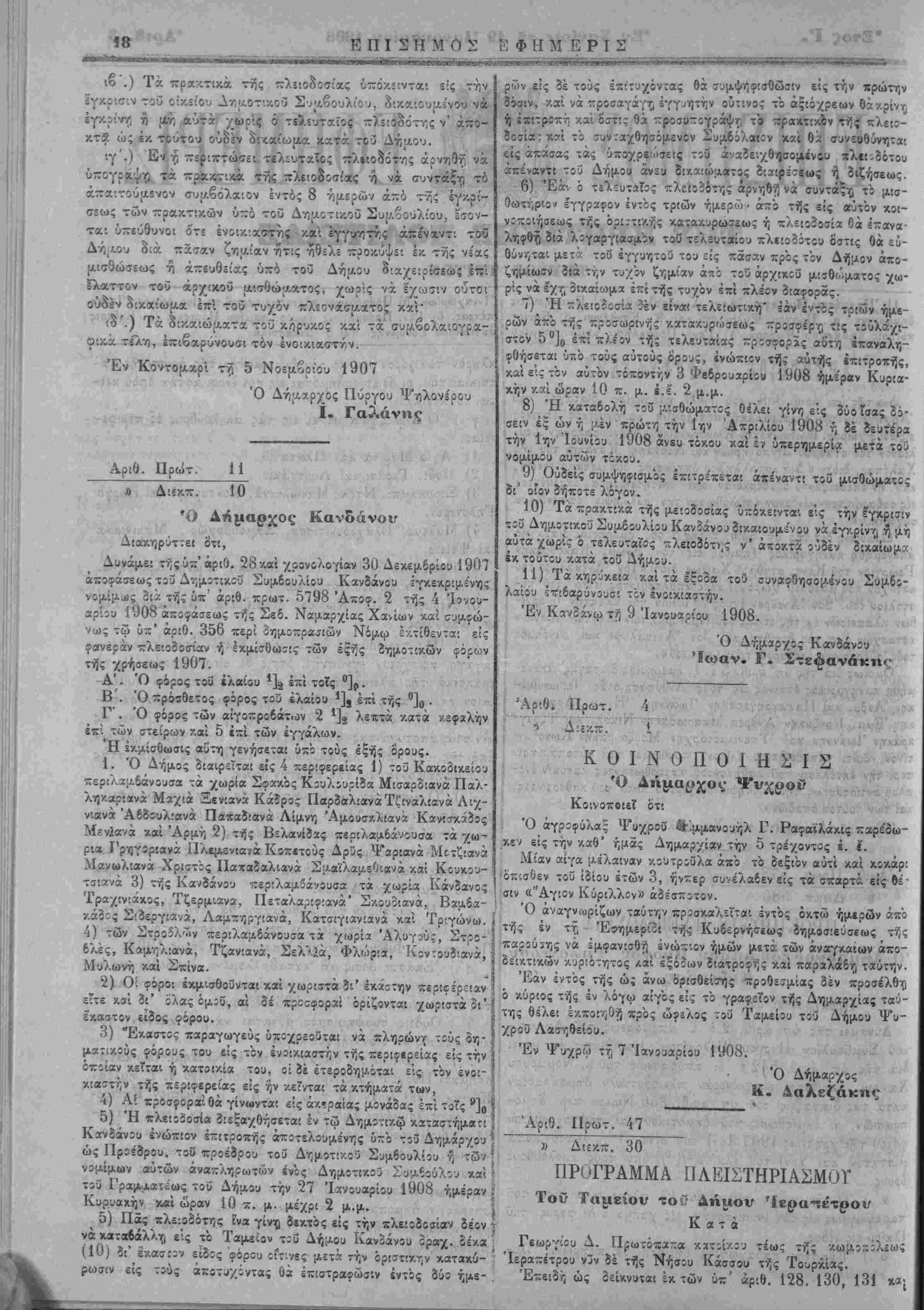 '.δ'.) Τα δι/.αιώ'Αατα τοΰ κόρυκος χ.χί τα συμβολ<χιαγρα- Ο'.ϊ-χ. τέλη, έπιβαρύνουσι τόν ένοΐΑΐοισητ,ν. Έν Κθντομχρί τη 5 Νοεμβριού 1907 Ό Δγ)ν.α.ρχος Πύργου ψηλονερου Ι. Γαλάνιις Αριθ. Πρώτ. 11 10 Ό Κανδάνοιτ Διακηρύττεί ότι, Δυνάμει τής ΰπ'αριθ. 28·Ααί χρονολογίαν 30 Δεκεμβριού 190" αποφάσεως τοΰ Δημοτικόν Συμβουλιον Κανδάνου ϊγκεκριμένης νομίμως 2« τής ΰπ' αριθ. χρωτ. 5798 Άποφ. 2 τής 4 Ιανου¬ άριον 1908 αποφάσεως τής Σεδ. Ναμαρχίας Χανίων καί συμφώ¬ νως τφ ύπ' αριθ. 356 χερί οημοπρα^ιών Νομώ Ι'.'.τίθενται είς γανερχν πλειοδοσίαν ή έκμίσθωκς των έςής ϊημοτίκων φόρων τής χρήσεως 1907. Α'. Ό φόρος τοΰ ελαίου 1]2 επί τοίς °]ί. Β'. Όπρόϊθετος φόρος τού ελαίου *]β επί τής °]0 . Γ'. Ό φόρος των αιγοπρόβατά 2 *]2 λεπτά ν.ατά κεφαλήν επί των στείρων ?.αί 5 επί των ίγγάλων. Ή έκμίσθωσις αυτή γενήσίταί υπό τούς εξής ό'ρους. 1. Ό Δήμος διαιρεΐτα' είς 4 περιφερείας 1) τοΰ Κακοϊίκείου περίλαμδάνουσα τα χωρία ΣφακΌς Κουλουρίϊα Μισαρδιανά Παλ- λη/.αριΐνά Μαχιά Ξενιανά Κάδρος ΠβροαλιανάΤζιναλίανά Αιχ- νιανά Ά6δΐνλ:ανά Παπαδιανά Λίμντ; Άμουσ/.λιανά Κανί?κά3ος Μ?νίανά -/αί Άρμή 2) τής Βϊλανίδας περίλαμβάνουσα τα χω¬ ρία Γρηγορίανά Πλεμενιανά Κοπίτούς Δρύς Ψβρίανά Μοτζιανά Μανωλιανά Χριστός Παχαδαλιανά ΣμαϊλαμείΙιανά /.αί Κουκου- ταιανά 3) τής Κανδάνου περιλαμβάνουσα τα χωρία Κάνϊανος Τραχινιάκος, Τζερμιαν*, Πεταλαριφιανά' Σ/.ουϊιανά, Βαμ,βα- κάο;ς Σιδεργιανά, Λαμπηργίανά, Κατσΐγιανιανά καί Τριγώνω. 4) των Στροβλών περιλαμιδάνονσα τα χωρία Άλυγούς, Στρο- δλές, Κομηλιανά, Τζαν:ανά, Σελ*·!», Φλώρια, Κοντουδιανά, Μυλωνή καί Σπίνοι. 2) Οί φόροι έκμισθοΰντα! καί γΐύριζτα ϊι' έκάατην περιΐέρείαν ί?τε καί 3ι' όλας έμίϋ, αί 3ί πρΐσφοροίϊ όρίζονται χωριστά 3«' έκαστον είδος φόρον. 3) Έκαστος παραγωγεύς ϋποχρεοΰται νά πληρώνγ τΐύς οη- ματικούς φόρους τού είς τόν βνοικιαστήν τής περιφερείας είς την οποίαν κείται ή κατοικία τού, οί δέ έτεροδημόται είς τόν ενοι- χιαστήν τής περιφερείας είς ήν κεΐνται τα κτήματά των, 4) Αί προσφοραί θά γίνωνται είς άκ;ραίας μονάδας επί τοίς 9]ο 5) Ή πλειοίοσία διεξαχθήσεται έν τω Δημοτίκφ καταστήματι Κανδάνΐυ ενώπιον έπιτροπής αποτελούμενης υπό τίΰ Δήμαρχον ώς Προέδρου, τοϋ κροέδρου τοϋ Δημοτιν.οΰ Συμδουλίου η των νΐμίμων αυτών άναπληρωτών ίνός Δημοτΐ'Λού Συμ6ούλου κα! τοΰ Γραμα.ατέως τοΰ Δήμου την 27 Ιανουάριον 1908 ημέραν Κυριακήν κβί ώραν 10 π. μ. μέχρι 2 μ.μ. 5) Πας πλειονότης ίνα γίνιτ, δεκτός ίίς την πλειοδοσίαν δέον νβ καταίάλλγ, εις τό Ταμείον τ;ΰ Δήμου Κανοάνου ϊραχ. δέκα (10) δι' εκασϊον είδος φόρου οΓτ;νες μάτά -ήν οριστικήν κατακΰ- ρωσιν είς τούς άποτυχόντας Οά έπιστραφώσιν έντος δΰί ημε¬ ρών είς δέ τούς έπίτυχόντος θά συμψηφΐσθωσΐν είς την πρώτην δόσιν, καί νά προσαγάγτ;, έγγοητήν οντινος τό βξίόχρεων Θά-Λρίνγ; ή έπιτρ=πή καί ό'στις θά προσνπογράψΓ, τί» πρακτίκθν τής πλειο- δοσία: κ3·ί τό συνταχθησόμενον Συμδόλαίθν κα'ι 6ά συνευθΰνηταΐ είς απάσας τάς ύποχρεώσεις τοΰ άναδειχθησομένίυ πλειοδότου άπέναντι τοΰ Δήμου άνευ δ!/.»ιωματος ϊιαιρέ-εως ή διζήσεως. 6) Έά ό τεΐευτίϊίς πλείοΒότης αρνηθή νά συντάξ/; τό μΐσ- Οωτηριο^ έγγραφον ίντός τριών ήμερώ· άπ'ο τής είς αυτόν κοι- νοποιήσεως τής όριττικής κατακυρωσεως ή πλείοδοσία Οά επανα¬ ληφθή διά λογαργιασμόν τοθ τελευταίον πλειοδότου όστις θά εύ- θΰνν,ται μετ5 τοΰ ίγγυητού τού :ίς πασάν πρός τόν Δήμον άπο- ζημίωσν διά την τυχόν ζημίαν απο τοΰ «ρχίκοΰ μισθο')ματος χω- ρις νά εχ·/; οικαίωμα επί τής τυχόν επί πλέον διαφοράς. 7) Ή πλειοίοσία 3έν είναι τελειωτική" «