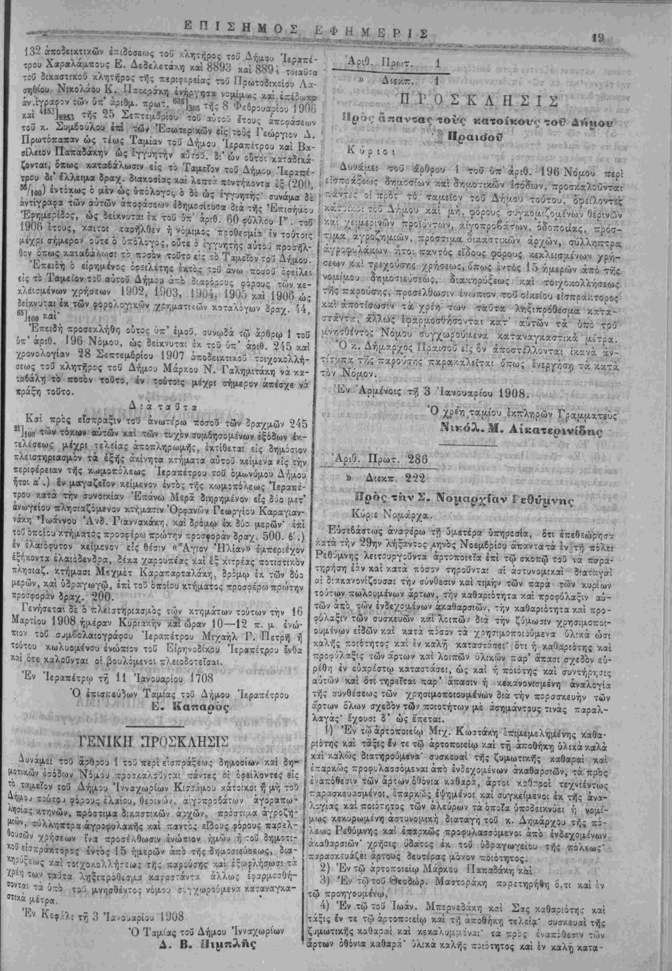δοτηρίων τοΰ δι*, κλητηρος τοϋ ΠρωτοοΥ/.είου Ρεθύμνης