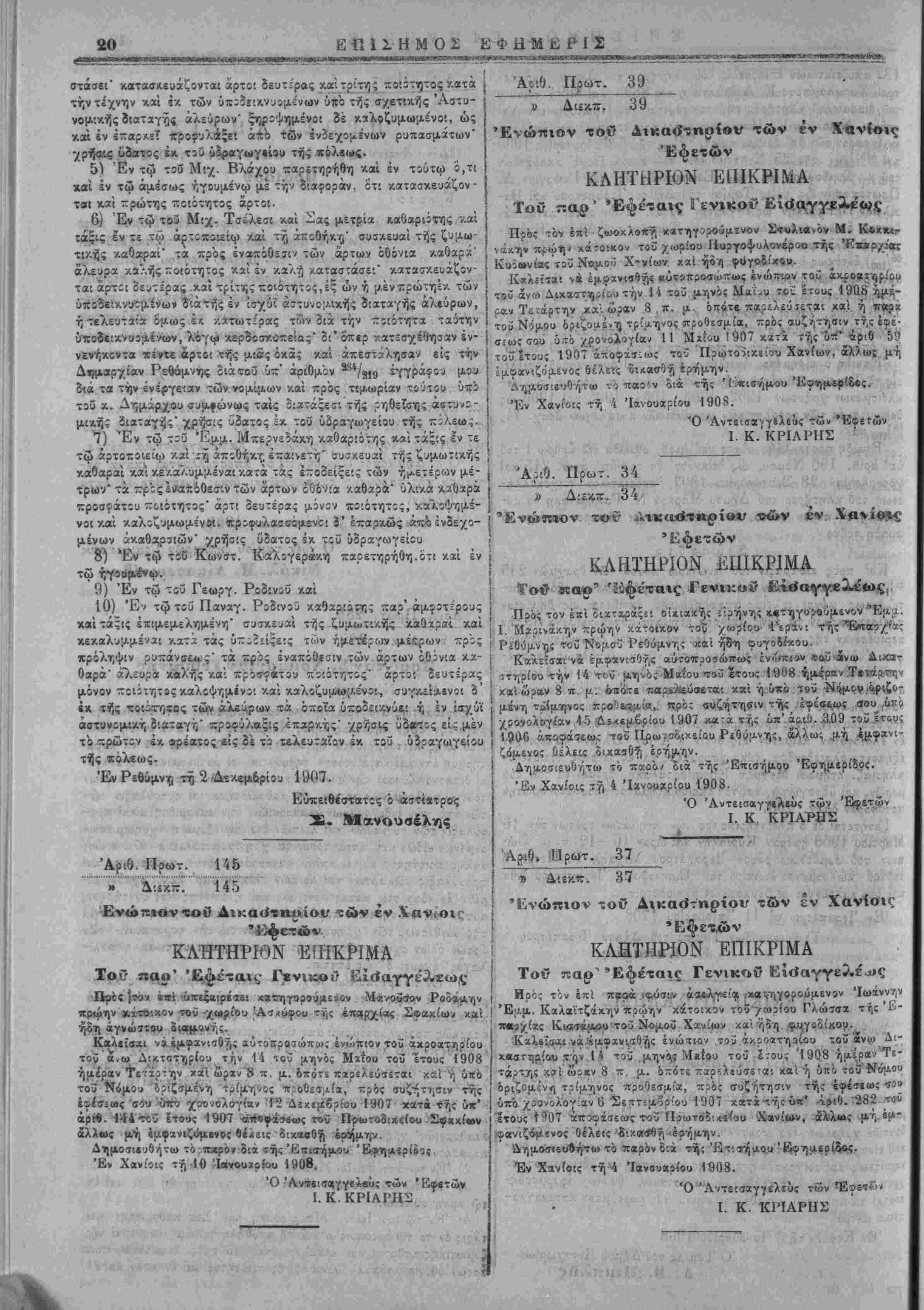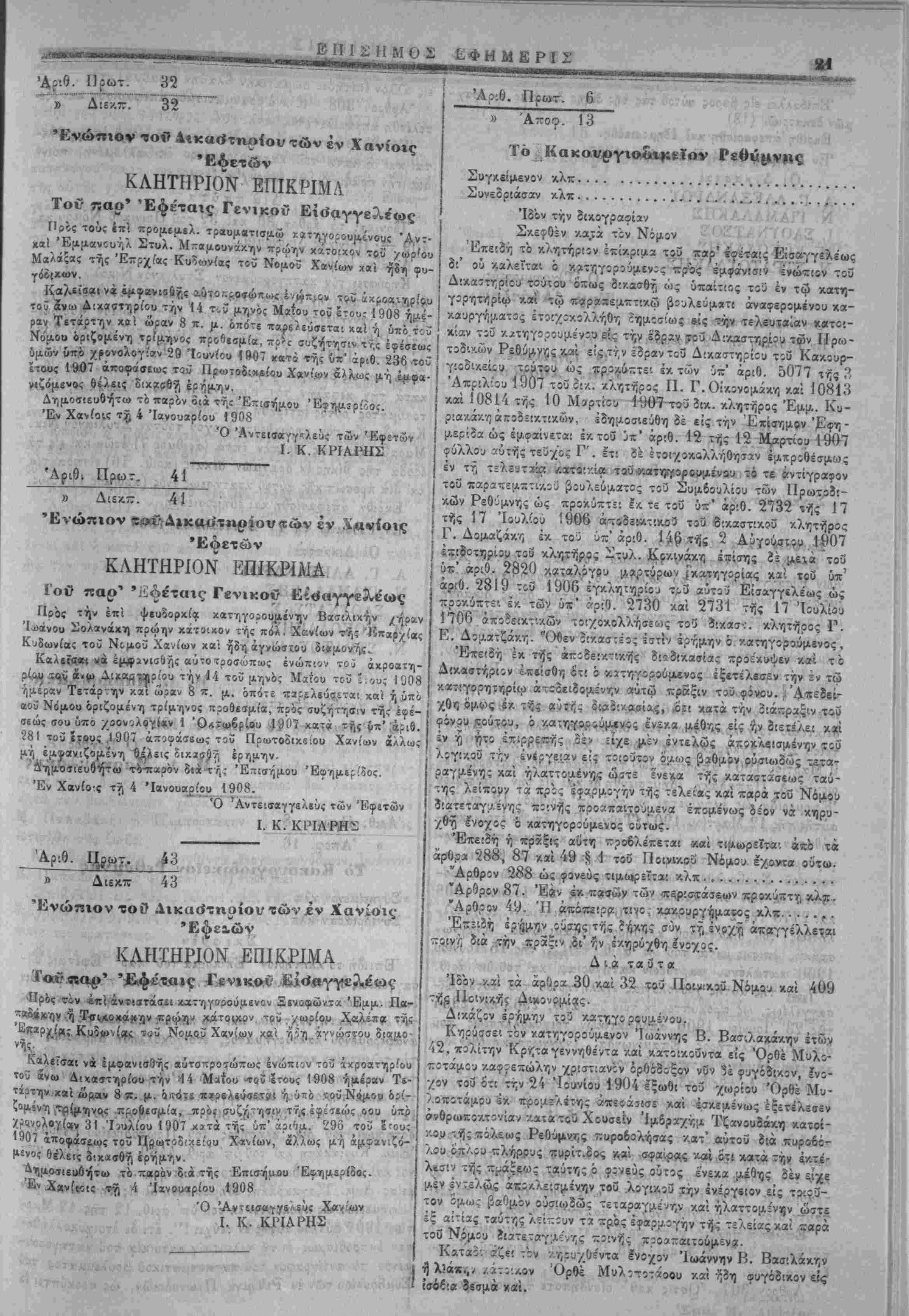 Έμμ. Μ. Μβάτ<οΐ; | Ότι άκ,ρι&ίς ά-πβΦπασμα. : Έν Ρίθομνγ, τ?, 16 Νοεμβριού 1907 Ό Ύπογρα.ΐΛ|Λχτεύς . Μ. Άβάτζθς Αριθ. Πρωτ, 5 ί » Άποφ. 12 Τό Κακουργιοδικεΐον Ρεθύμνης Συγκείμ«νον Αΐλ.................................. Ίδόν την Δικογραφίαν Σ/.εοθέν κατά τ'ον Νόμον Επί ίδη τό κλητήριαν έπίκριμ.α τοΰ παρ' Έφίταις Χανίων Ει¬ σαγγελέως, δι" ου καλείται ό κατηγορούμενος πρός εμφάνισιν 'ένώπιον τοΰ Διχαστηρίου τούτου ό'-ως δικασθή ώς ύπαίτιος τοΰ έν τώ κατηγορητηρίφ και τω παρατκμΐίτικω βοι/λεθματ: άναφε- ρομένου καχοοργή ιατος, έτοιχο-Αθλλήθη δημΐσίως ϊίς την τελευ¬ ταίαν κατοικίαν τ5ΰ *ατηγορου,;.έν5υ, είς την έ'οραν τοΰ Δίκαστη- ρίου των ΠρωτοδΐΑών Ρεθύμνης κχί είς την έ'δρ«ν ιοί Κβκουργιο- δικείου τίΐτου, ώς προκύπτει έκ τοΰ 6~' αριθ. 5059 τή£ 2α; Αλί 1907 άποίειχτικοΰ τοϋ δικαστικοΰ κΧητήρος Π.' Γ. ·χίου_19θ7 (αε>/ΐς Γ .). Ιτ: δέ έτ-,ιχοκολλήθησαν έμπροθέσμω