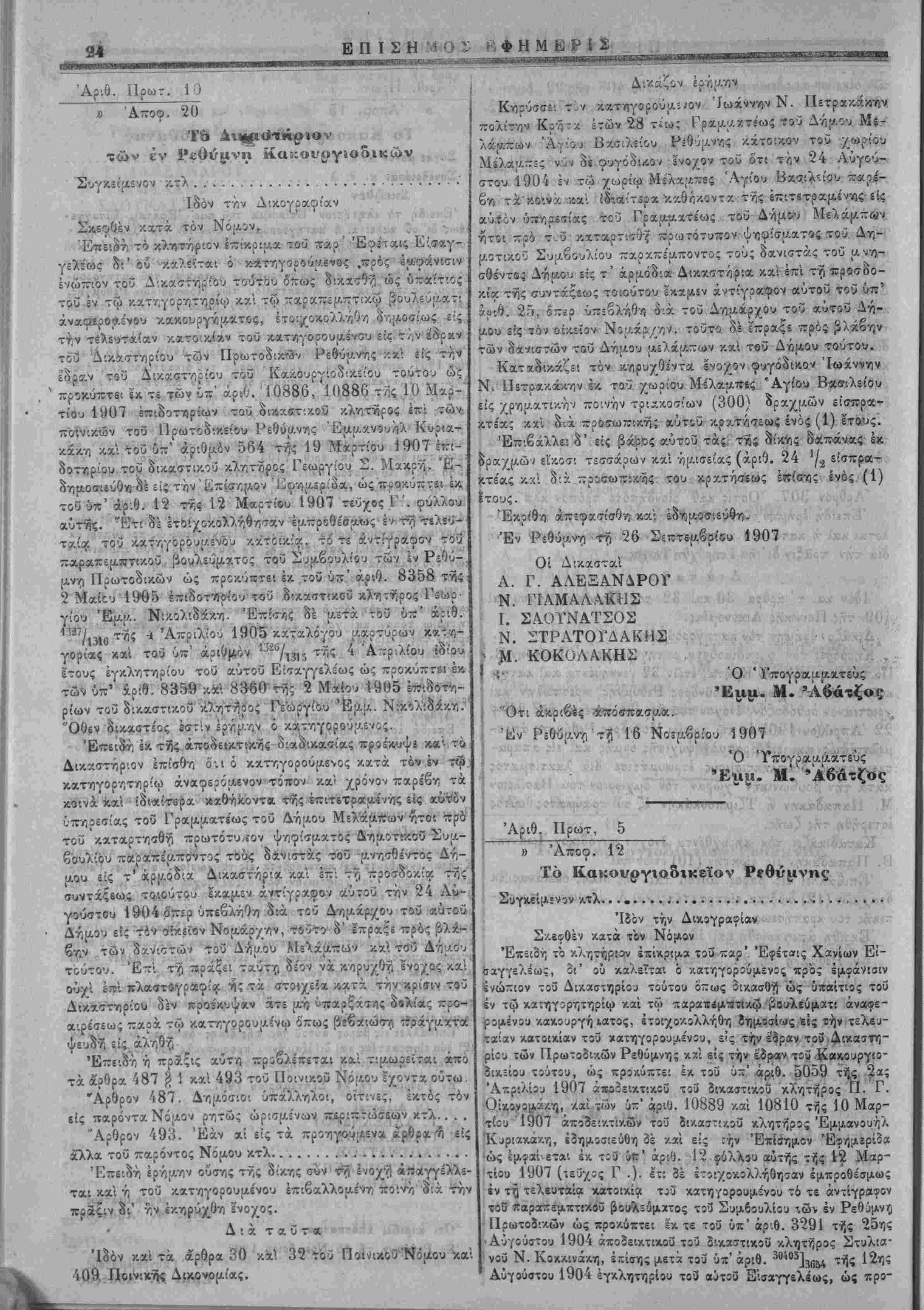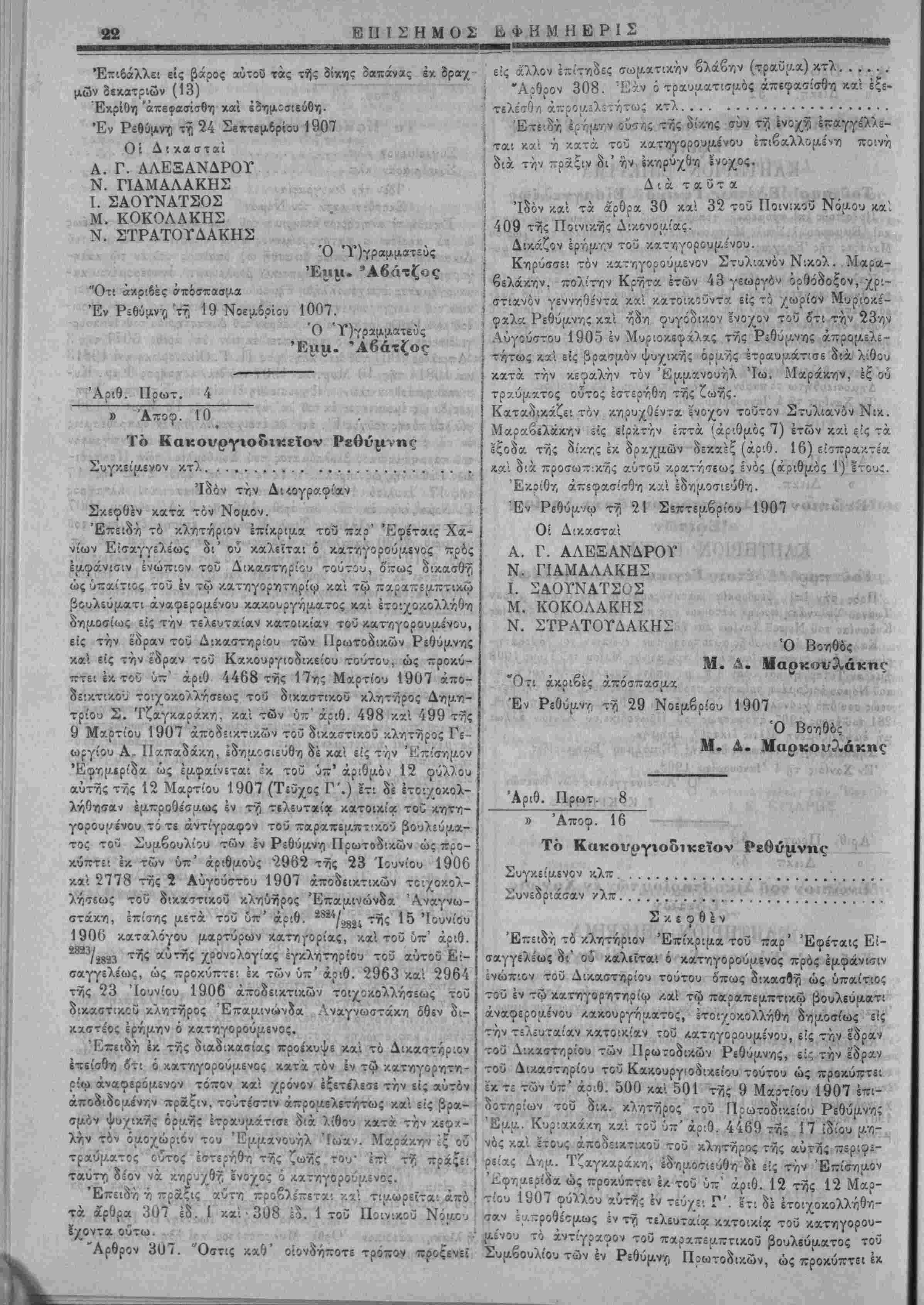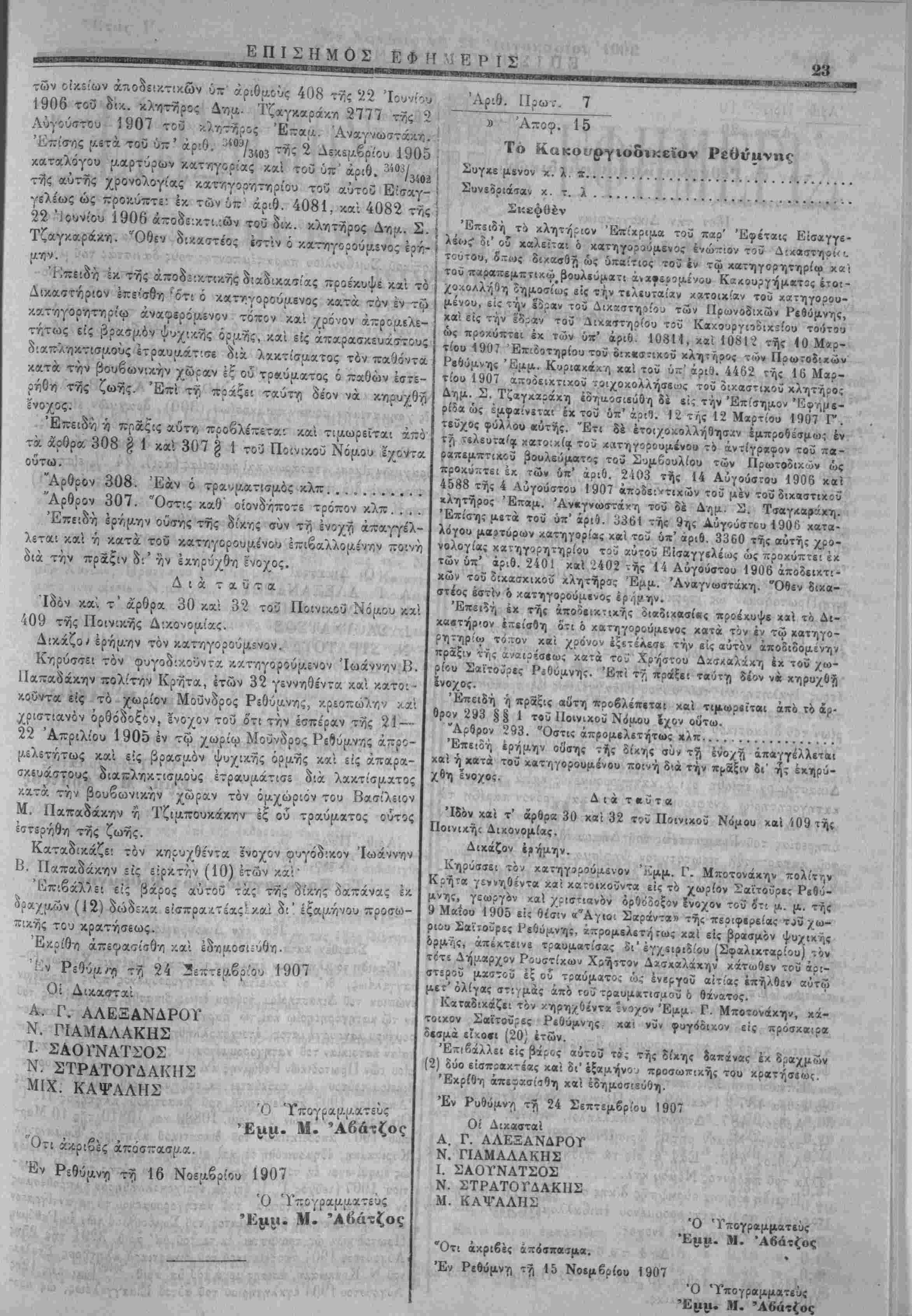 δισμά εΐ<ο·ι (20] έτών. Επιβάλλει είς (3άο<;ς αύτοϋ τ»; τής δίχης δα«άν«ς έ< δραχμών (2) δΰο είΛπίακτέοις χαι δι'έξαμήνο^ προσωπικής τού χρβτήσίως. Εκρίθη άπεΐασίιθη χαΐ εδημοσιεύθη. Έν Ρυθώμνν) τγί 24 Σεπτεμβρίου 1907 Οί Δικασταί Α Γ. ΑΛΕΞΑΝΔΡΟΤ Ν. ΓΙΑΜΑΛΑΚΗΣ Ι. ΣΑΟΤΝΑΤΣΟΣ Ν. ΧΤΡΑΤΟΓΔΑΚ11Σ Μ. ΚΑΨΑΛΗΣ Ό Ύπογραμματεύς Έμ μ. Μ. Ότι άχριβές οΐπ'ΐσπασμα. Έν Ρεθόμνγ! τ^ 15 Νοεμβριού 1907 Ό Ύπογραμματεύς Έμμ. «Ι. Άβάτζος