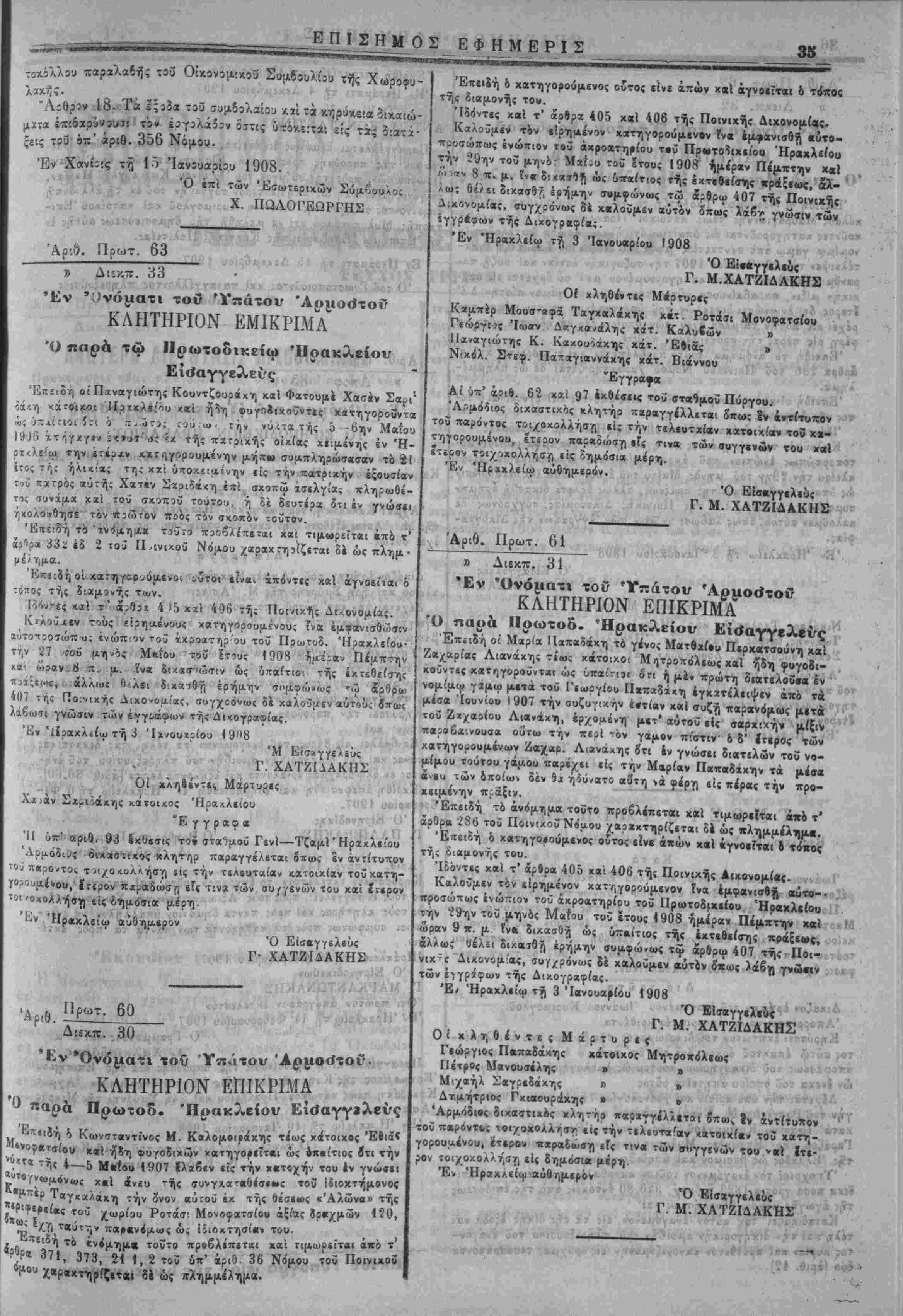 ά-βα των οποίω, θέν 9α ηίύ/ατο αίΐτη «ά <ρέρ^ εί; πέρας την προ¬ κειμένην π.αξιν. 'Επειδή τό άνόμημα τουτο προβλέπεται χαϊ τιμωρΐΐται ά*ό τ' άρθρα 286 τοΰ Ποινΐχοΰ Νβ'μου χαρΐχτηρίζίται δέ ώς κλημμέλημπ. Έπειδή δ χατηγοεοΰμενος ούτος είνε άχών χαϊ ίγνοείταΐ & τοκος τής όιαμονής τού. Ίδόντες χαΐ τ' άρίρα 40δ χαι 406 τή; Ποινιχή; Αιχονομίας. Καλοϋμϊν τ6ν είρημένον χατηγορούμϊνον ίνα έμφανισ$|} αΰτο-· προσώπω; ενώπιον τοϋ άχροατηρίου τοϋ Πρωτοδιχιίβυ Ήραχλιίου την 29ην τοΰ μηνός Μαίου τυϋ ϊτους 4908 ημέραν Πέμπτην χαϊ Μ ώραν 9 κ. μ ίν« διχασ6^ ώς ΰπκίτιος τής έχτ·9εί<της πράζί<»ς, άλλως θέλει διχαΐθβ έρημον συμφώνως τώ άρθρω 407 τή; Ποι- νιχ~ς Δικονΐμίας, συγχρόνως {έ χαλοϋμεν αυτόν ίίπως λάβ|) γνώ«ιν τώνέιγρίφων τής Διχογραφίας. Έ- Ήραχλίίψ χίι 3 Ίανουαείου 1908 Ό ΕΙσαγγεΜί'" * Γ. Μ. ΧΑΤΖΙΔΑΚΗΣ Οί χληθέντε; Μάρτυρες Γεώργιος Παπαδάκης χάτοιχθ; Μητροπόλεως Πέτρθς Μανουσέλη; β » Μιχαήλ Σαγρεδάχη; » » Δτ,μήτριο; Γχιαουράχης » » Άρμόδιος δικαστικλς χλητήί *αρ»γγέλ/ιετοι ί«ω% Ιν αντίτυπον '|Υ^ τοϋ ππρόντε,ς ίθΐ/οχολλησϊ; τίς την τιλευτα'αν *ατοιχ(«ν τοΰ κατη- *~ γορουαένου, ίίτερον παραδώστ] είς τίνα των σογγενών τού να1 Ιτι- 1 ρον τοι/ΰ/.θλ',Ύιι?ι ίϊί δημοσία μέρη. * Έν ΉρΐχΑίίω αυθημερόν Ό Είσαγγελεϋ; Γ. Μ. ΧΑΤΖΙΔΑΚΗΣ