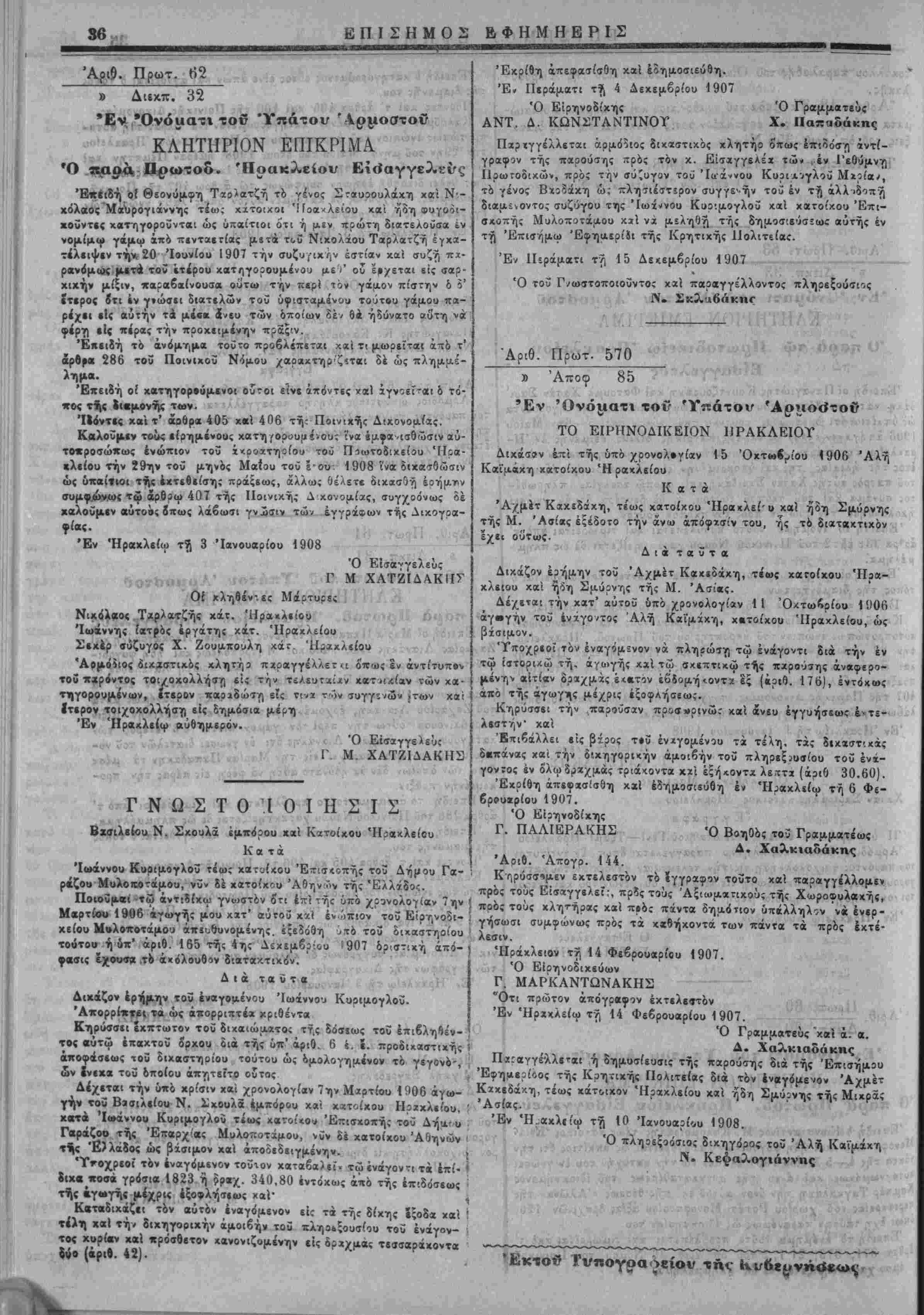 ίΐχα -«ά γροσ.α 1823 ή δρ.χ. 340,80 «ντόκως ά,ο τής ίπ-δ<ίσεως τής ·νγ»γτι« μέχρις ίξοφλήσιως χαί· ^ Κβταδικάζει τόν αυτόν έναγομενον είς τα τής δίχης ϊξοδϊ χαϊ ■ τίΐη χαί τη, διχηγοριχην αμο,βή, τοΰ πληο»ξουσίου τβΰ ένάγον- τβς κυρίαν χ.Ι «ρόσβ.τον χ.νον,ζομίνην είς δράμας τεσσαράχοντ. ΆοιΟ. Άπογρ. 144. Κηρύσσ^μεν εχτελβστόν τό ϊγγραφον τουτο χ«1 παοίγγέλλομε» πρός τους Εί~γγε)εΐ-, πρϊς τους Άξιωμ,τιχου; τής Χωρο*υλαχής, πρός τους χλητήρας χ«! π»οί πάντα δηαοτιον 6πάλληλ-,ν 'νά έν«ρ- γησωσι συμφώνως πρός τα χ«θήχοντα των πάνΐα τα πρός εκτέ¬ λεσιν. Ηράκλειον τί} 14 Φββρουβρίου 1907. Ό Είρηνοδιχεΰων Γ. ΜΑΡΚΑΝΤΩΝΑΚΗΣ Ότι πρώτον απογραφήν έχτελΐβτον Έν ΉρΐχΑείω τ?| 14 Φεβρουαρίου 1907. Ό Γραμματεύς "χαί ά. α. ^ Χλδ Π«:αγγε·λλεται η δημοσίευσις τής παρούσης διά τής Επισήμου Κφημ.ρίος τής Κ3ητιχής Πολιτείοις διά τον έναγομενον Αχμέτ Άσ'αα*η' Τέωί χάΤί'ίΧΟν <Η?αχλ«ίο« κίί ήδη Σμύρνης τής Μικραί Έν Ή,ακλιίω τϊ) 10 Ίανουαρίί,υ 1908. Ό πληι,εξοόσιος δικηγόρος τοϋ Άλή Καίμάχη Ν. Κεφαλογιάννης Γνπογοα >βίον τή<: