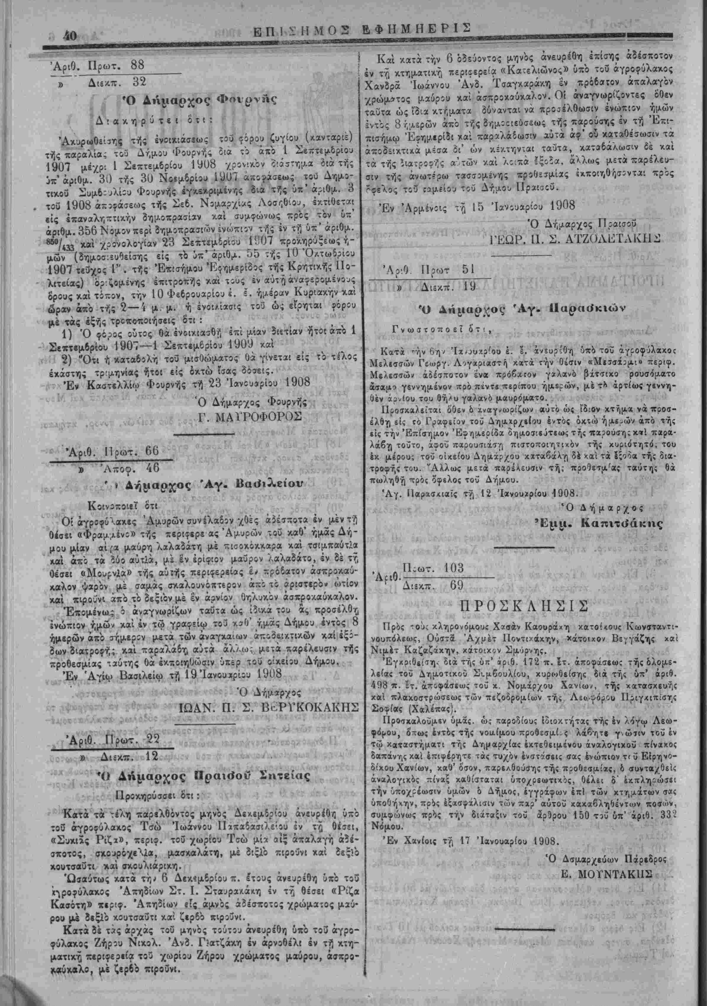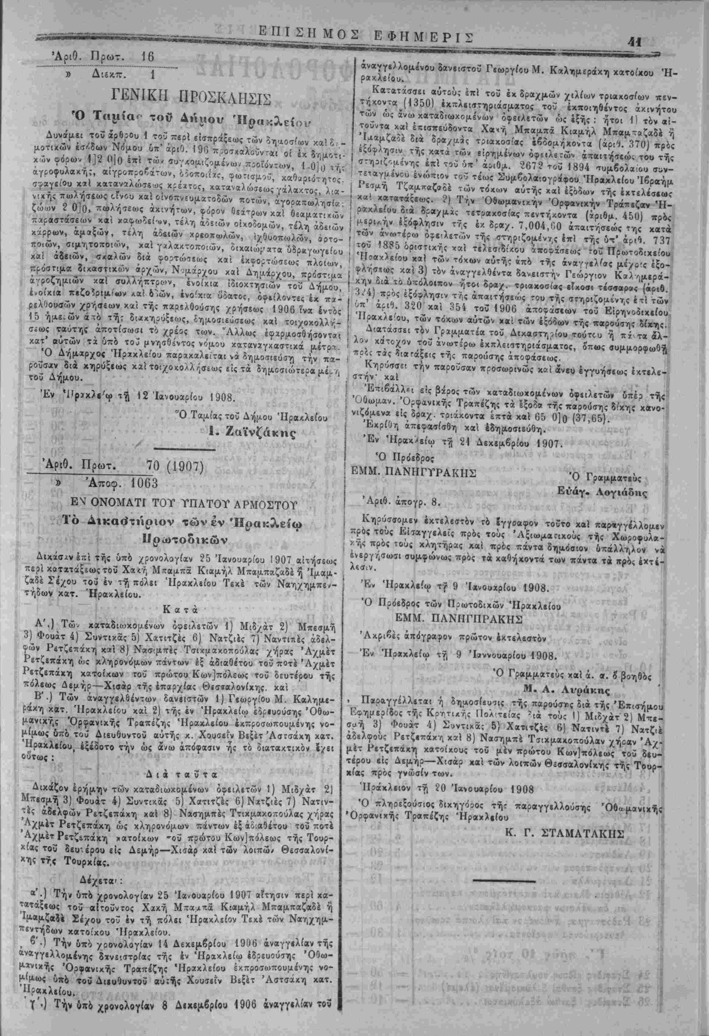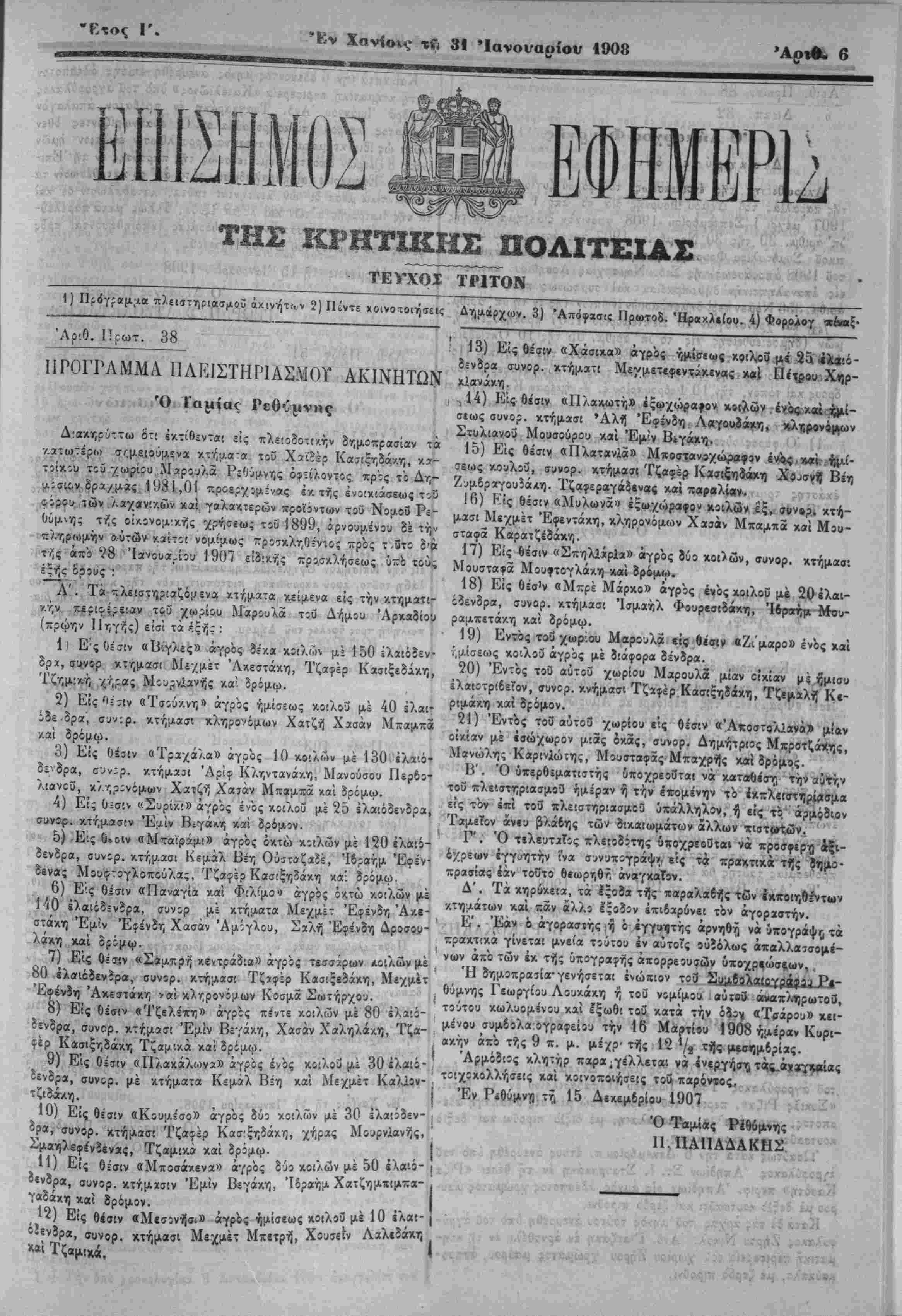 ! τούτου κωλυομένου καί Ιξωβι τοϋ κατά την όίϊγ «Τ<χάρου» κει¬ μένου συμίολα ογρβφείου την 16 Μαρτίβυ 1908 ημέραν Κυρι- ( «/.ήν άπό τ?,ς 9 π. μ. μέχρ- τής 12 7ϊ τής μεσημβρίας. ! Άρμόδϋς κλητήρ παρα ,γέλλεται νά ενεργήση τάς.ά»3γκβί«ς τοιχίχολλήσείς καί κοινοποιήσεις τοϋ παρ4ν»ος, ( Έν ΡίθύμνΤ) τ?ί 15 Δικεμδρίου 1907 ', Ό Ταμίας Ρίθ6μνης ! 11, ΠΑΠΑΔΑΚΗΣ