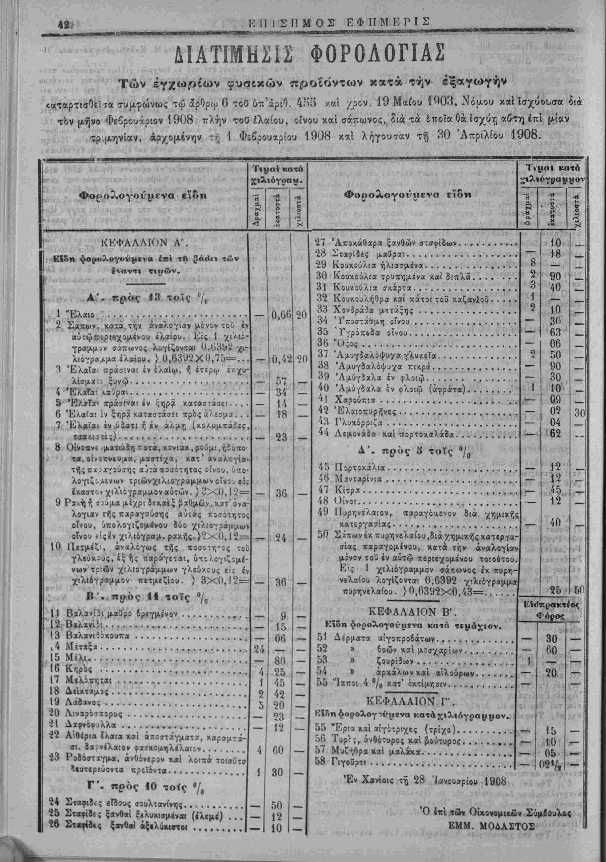 <«ταρτισθείτα συμφώνως τφ άρθρω 6 τοθ ύπ'άριθ. 4Η5 καί /ρον. 19 ΜαΐΌυ 1903, Νόμου καί ίσχύοΐ/σα διά τον μήνα Φεβρουάριον 1908 πλήν τοθ ελαίου, οίνου καί σάπωνος, διά τα 6ποΐα Οά ισχύϊ] αυτή επί μίαν τρμηνίαν, αρχομένην τή 1 Φχβρουαρίου 1908 καί λήγουσκν τί) 30 Απριλίου 1908. Φο^ολογούμενα ειδή τ»ι ^α^ κατά χιλιόγραρ. Ή β α. Ό Ο Η (ΟΙ ?<: ε'ίδτι ΊΛ|ΐαί κατό ΚΕΦΑΛΑΙΟΝ Λ'. ΕΙ&η ψφ(Ηΐλ»γ»ν(ΐΐ!να έ«1 τή (?Λ<1*ι των Α'. πρός 13 τοίς °/φ 1 Έλαιο................... 2 Σά,χων, κατά την αναλογίαν μόνον τού ι αύτω ιτίριεχομίνου ελαίου. Είς 1 γραμμήν σάπωνος λ&γίζονται 0,('ι3*η¥ '( λιάγρα,χμα ΐλαίρυ. } 0,6392X0,7ΰ—=. 1 Ελαίαι πράσιναι έν έλαίω, 9, έτερψ έ ν. χ λίσμχ:ι ςυνφ................... 4 ΈλαΓχ: μαύραι................... 5 Έλ>ΐχ< πράσιναι έν ξηρά καταστάαει. .. 6 Ελαίαι ίν ςηρ» καταστάσει πρός «λεσμα.. 7 Ελαίαι ίν.ΰϊατι ή «ν αλμτ; 8 10 Οίνΐπνί .μΐτώόη ττοτά, κονιάκ,ρούμι,ήίυπι τα, οίνικ:ν*υμα, μαστίχα, κατ' άναλογίι τήςπχίχγούΐης αύτάποσότητος ίϊνου, Οπι λογιζο,Αΐνων τρ(ώνχιλίθγρ»μμ«ιν οΓνΐν ι.. ϊκαστΐ» χιλ'ιόγραμμοναυτών. ) 3X0,12= Ρίχήή σ^ύμαμίχριδεκαεξ ^αθμών,κατ'ά»α λογιαν τής παραγοΰσης αύτάς ποσοτητο οίνου, Οπολογιζομενου δύο χιλιβγράμμω· οίνου είς εν χιλιΐγρβμ. ρα*τ;ς.)2Χϋ, 12= Ιΐΐτμίζι, αναλόγως τής ποσότητος το γλεύκους, έξ ής παράγεται, ύτιλογιζιμέ νων τριών -/ιλιογράμμων γλεΰκους είο Ιν χιλιογραμμον πετμεζιου. ) 3X0,12= β νπρός 11 τοίς ά:ι μα3ρο Βαλανιίίκοκπα Μίταξα Κηρος Μ5 ΔεΑκταμος Λάϊανος 23 25 Α'θιρια ίλαια καί άκοστάγματα, σι. ία:νέλαιον φασκομηλίλαϋν........ Ροδόστιγμα, άνθίνΐρον καί λοιπά τοίαΰτ»; ΐ«υτ«ρίύο>τα ι