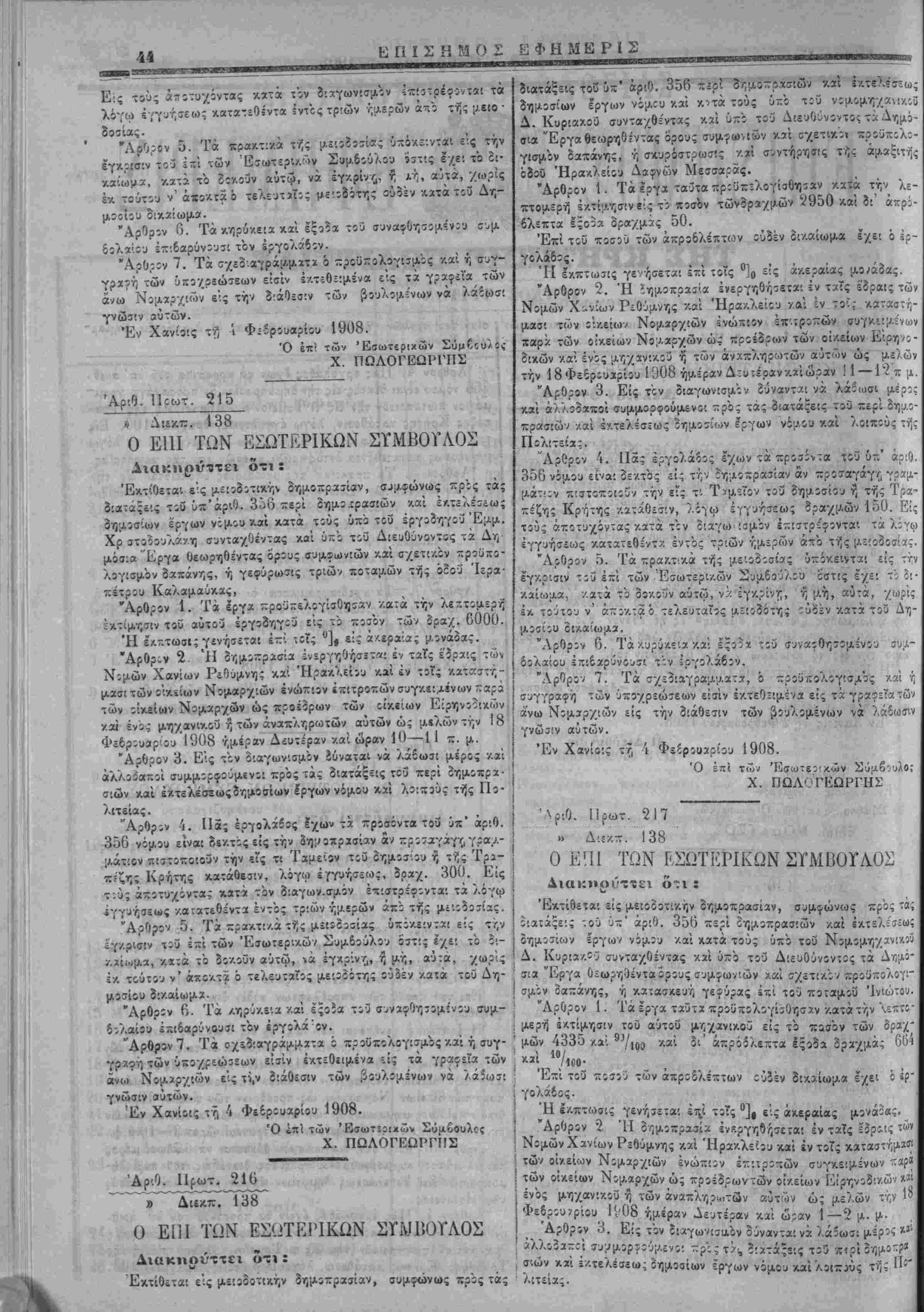 "Εργα Οίΐορη,θίντας ό'ρυς α«μφ<*ν.ων ■λ.ύ σ·/ε:ικ!ν πρβϋπολΐγι- 3μόν 8αχίν/ίς, ή -/.ατασκευη γεφύρα; ί^ί -οδ ποταμοϋ Άγίβυ ΓίΜργίβυ είς χωρίον Άδδοΰ Πεδιάίος. Άρθρον 1. Τα Ιργα ταυτα τΐρούϊτελογίσθησαν κατά την λε- πτεμερή ίκτίμησιν τ:3 αΰτοΰ νομομν/ϊνίνΌΰ »ίς τό ποτεν των ίραχμών 3,5ϋΟ. Ή εκ-ΐωσις γβνήβεται επί τοίς °/0 είς ά/£ροιίας μονάδας. Άρθρον 5. Ή δομοπρασία ενεργηθήσεται 5ν ταίς έ'ίραις των Νομών Χανίων, Ρεθύμνης Ααί Ίΐραί/είου /.3'. ΐν τ;ϊς κα:ασ-ή- μασι των ο'ικείων Νομαρχιών ένώπϋν επιτροπών συγκειμένων ταρΛ των ο'./.είων Νομαρχών ώ; ~ροίΖρων των (ίχείων Είρη- νοϊικίον καί ενός μηχαν'.κιϋ ή των άναΐϊληρωτών αυτών ώς μελών, την 19 Φεδρουαρίου ]90δ ήμίραν Τρίτην καί ώραν 2 — 3 μ. μ. "Αρθρον 3. Εις τ:ν ϊιαγωνισμόν ούνανται νά λάβωσι ;^·έρος -/αί άλλ:38π.5Ϊ συμ.μ.3ρφού;Λενΐι —ρος τάς διατά;?ις τ3·3 πϊρί ϊη- μοπρασιών -/αί έκτελί'σεως δημ2ϊίων Ιργων νόμου κοιί λθ!~:ϋ: τής Πολιτείας. "Αρθρον -4. Πας έργολάδος έχων τα ζοϊϊόντα τού ϋζ' άρ:9. 356 νίμου είναι δεκτϊς είς την δημοχρασίαν άν προσαγίγ/; γραμ- μ.άτιον πιστίπϋο^ν τΓ,ν είς τι Ταμείον τοϋ Δημοσίου ή τής Τρα- ι ~έζης Κρήτης /.αταθεσίν λόγω εγγυήσεως, δραχμώ' 160. Εις! τώς ά1:οτ^χόντας κατά τ'ον διαγωνισμόν ίπιστρίφοντα; τα λόγφ ' εγγυήσεως -Λατατεθίντα έντός τριών ημερών άπο τής μϋοδοσίας. Αρθρον 5. Τα πραχ,τικά τής μευδοσίας ύπόκειντα· είς την ' έγκρισιν τοΰ επί τώ' Έσωτΐρίκών Σύμβουλον ό'ΐτις έχε: το δι- ! καίωμα, κατά τό 3ΐκο3ν αύτω, νά ΐγκρίνγ,, ή μή, αύτά, χωρίς έκ ' τούτου ν' άποκτά ό τϊλϊυταΐος μειοδότης ουδέν κατά τοϋ Δημο- | σίοο δικαίωμα. ! Άρθρον 6. Τα κηρύκεια καί εςΐδα ::3 συναφθησ:μένίυ ϊυμ^ δολαίου έπίίαρύνουΐ: τόν εργολάβον. ! "Αρθρον 7. Τα σχεδιαγράμμιτα, ό πριυιτολογισμίς καί ή συγ · ' γ·αφή των υποχρεώσεων εισίν έ/.τίθϋμϊ'να είς τα γραφβϊα των :ρχ ,ον ίίς τήνϊ άίΐςΐιν τϊ>» (ϊ;υ/5μ.έν όν να λαοοσι γνώ-1