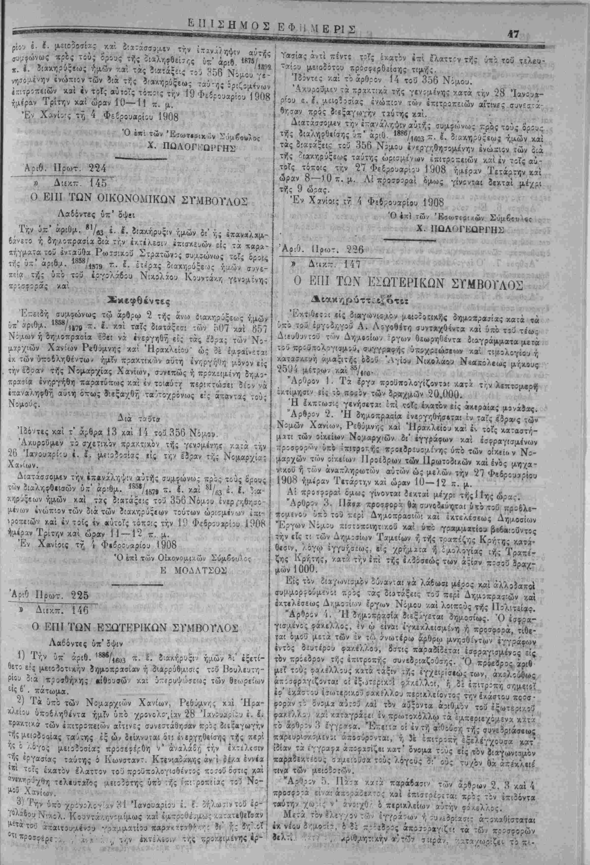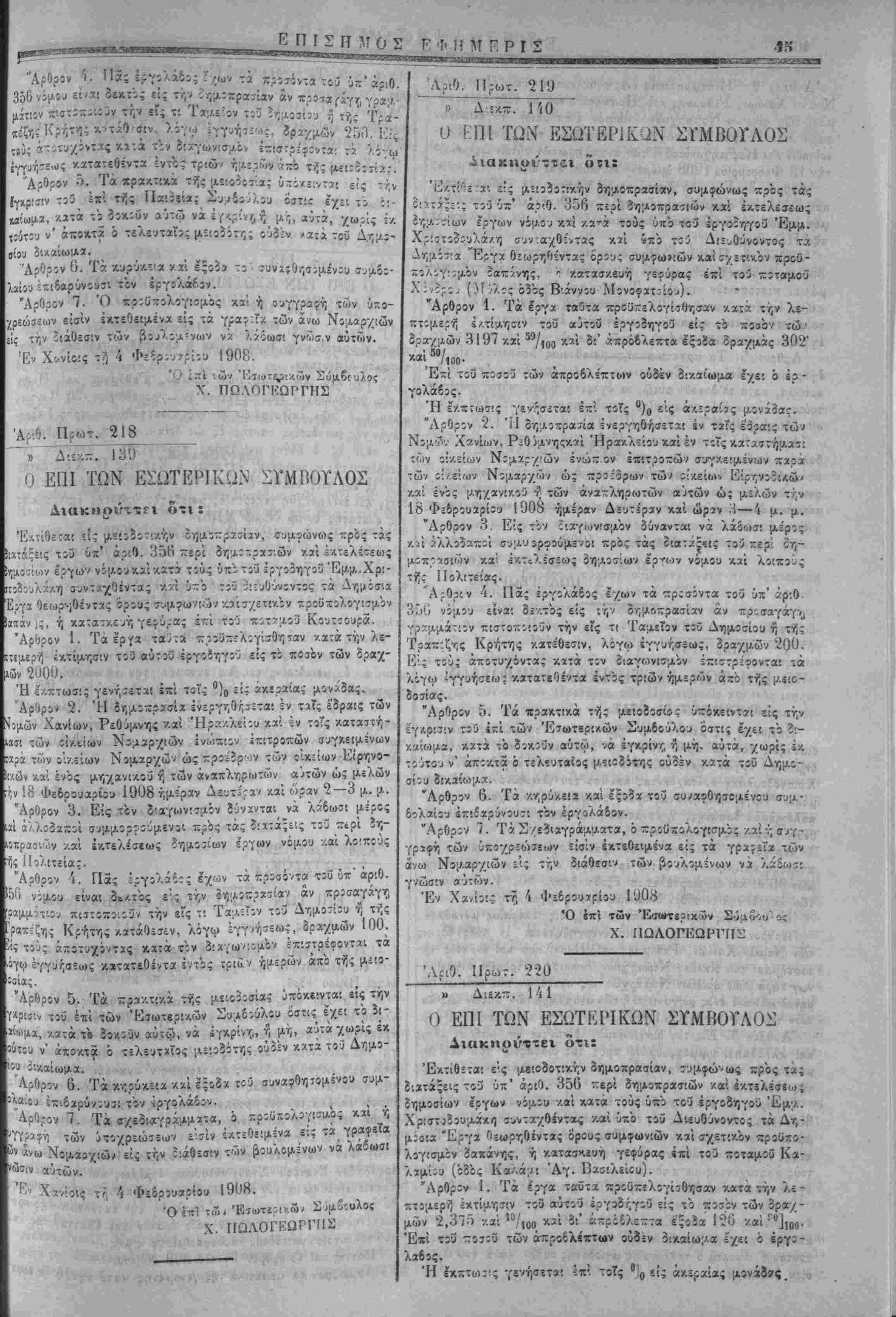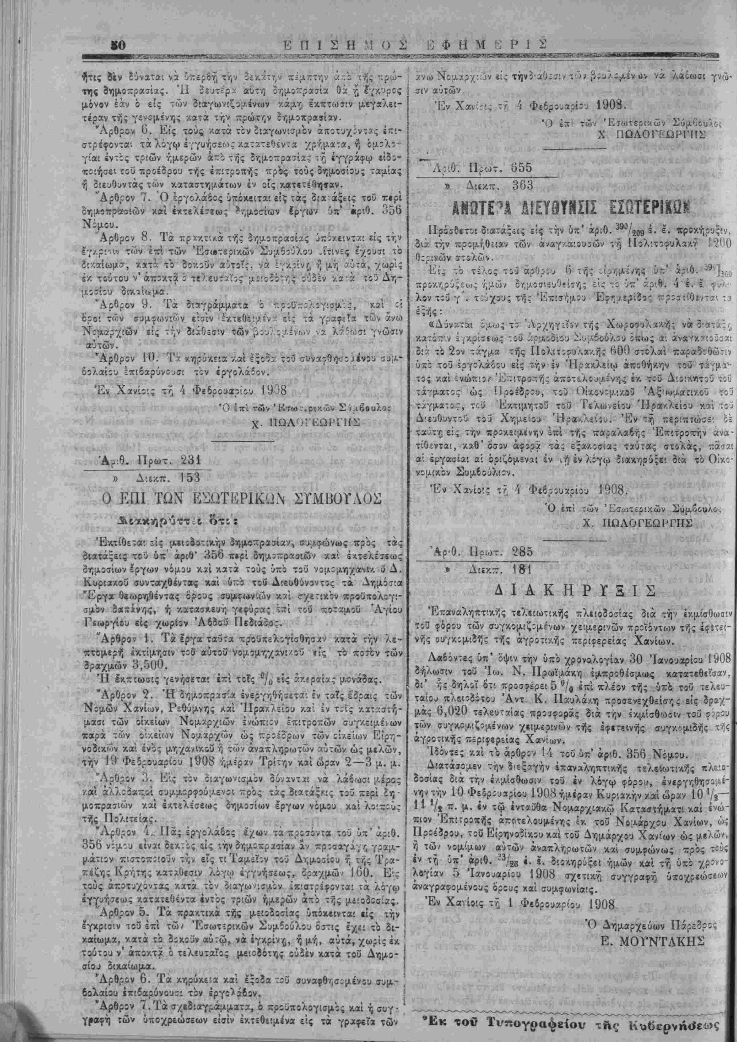 τίθενται, καθ1 6σ5ν »<ίίρχ τάς εςα/.;σιας ταύτας στολάς, ζαι?' αί εργασίαι αί όριζάμεναί ίν ιη ίν λίγω ϊιακηρΰςε! 3ίά τό Ο'ν- νομικόν Συμβούλιον. Έ» Χανίοις τ? 4 Φεδρουϊρΐίυ 1908. Ο επί των 'ϋιτωτερι/.ώ Χ. ΓΙΩΛΟΙΈΩΙ'ΓΉΣ "ΑΡ·0. Ποωτ. 285 ~» λΐί-Λ-. 181 ΔΙΑΚΗΡΪΞΙΣ Έπαναληπτ'.κής τελ*!ωτ:κής ττλΐ!οϊ»σίας 3ιά την ΐκμίσθωα τ;3 φόρου των συγκομιζομενων χειμερίνων τροϊόντων τής έφετβ! νής ουγκίμιδτ]ς τής αγρότας περιφερείας Χανίων. Λαδόντες ύιτ' όψιν την υπο χρονο,λίγίαν 30 Ίανουαρίου 190 δήλωσιν τοΰ Ιω. Ν. Πρωϊαάκη «μπρςθέσμως κατατεθΐΤίΐν δι' ,·;ς δηλοί ό'τ; προσφερει 5 °/0 επί πλέον τής ύχο τοΰ τελευ ταίου ΐ5/.6ΐϊδίτοο Άντ Κ. Παυλάλη προσενεχθείσ^ς είς δραχ μας 6,020 τελευ-αίας προυφιρας διά την Γ/.μίσθωσιν τοΰ <ρ:ρο των συγκομίζΐμένων χειμίρινών τής 5φ*τ«ινής συγκ'μίδής τη «γροτιχής περιφβρεϊας Χανίων. Ίϊόντες κϊί τό άρθρον 14 τοϋ ΐιπ' αριθ. 356 Νίμου. Διατάσσομεν την ?'εξ»γήν ίπαναληπτικής τελεωτικής πλε'.ο δοσίας διά την έ/.μίσθωσιν τοϋ έν λόγω φόρο,ι, ένεργηθησο;" νη; την 10 Φεδρ:υα?ίου 1908 ημέραν Κυριακήν /αί ώραν 10 '/ί~ 11 */ι π· μ·- έν τω «νταΰθα Νομαρχια-Λω Καταστήματι καί ένώ πιον Έπΐτροπής αποτελούμενης έν. τοΰ Νομάρχου Χανίων, ώ· Προέίρου, τοΰΕΐρηνοίίκουκα'ιτοϋ Δήμαρχον Χανίων ώς μελών ή τώ; νομίμων αυτών άναπληρωτών καί συμφώνως πρός τ«ΰί έν ττ] ύχ' αριθ. α/νι έ. ϊ. δ'.οκηρύξε! ημών καί τη υπό χρί"- λογίαν 5 Ίανο,ιαρίίυ 1908 σχίτι-Α-7, σογγραφί, υποχρεώσεων αναγραφομίνους ορους καί συμφωνίαις. Έν Χανίοις τ?, 1 Φεδρουαρίου 1908 Ό Δημβρχεΰων Πάρεϊρο Ε. ΜΟΥΝΤΛΚΗΣ •Εκ τοβ Τνπογ^α^είον -ϊ